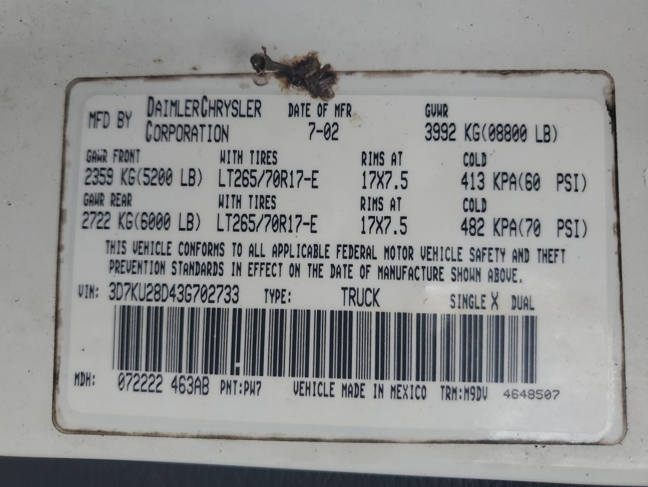 FairThis 2003 Dodge Ram 2500 shows significant signs of wear and tear. The exterior is covered in dirt and grime, with notable damage to the body panels. The interior is in poor condition with visible damage and wear, suggesting a lack of maintenance. Mechanical issues are present, and the vehicle is likely not drivable. The vehicle's overall condition is poor, requiring considerable repair.