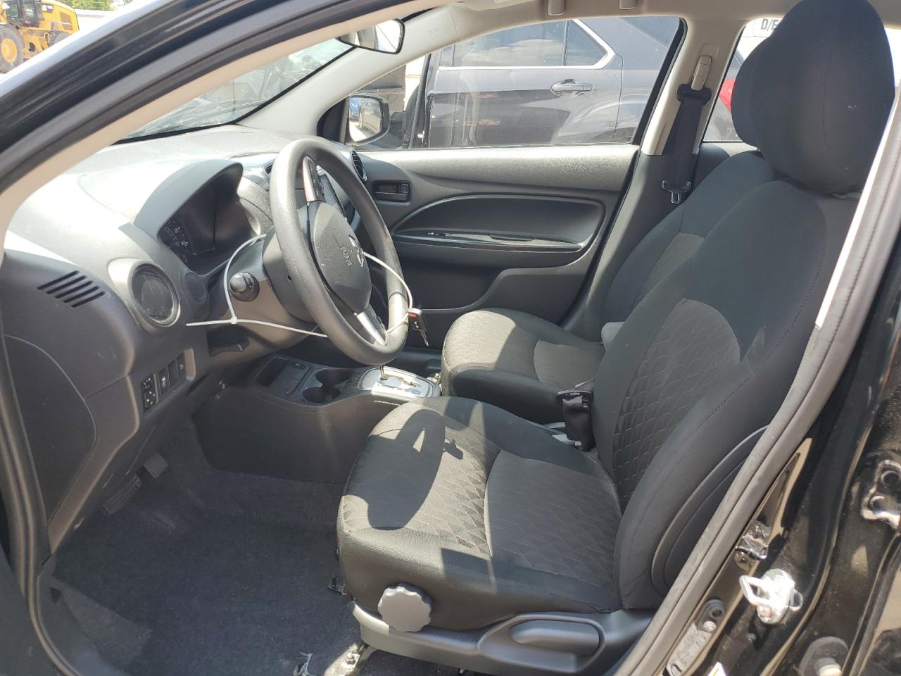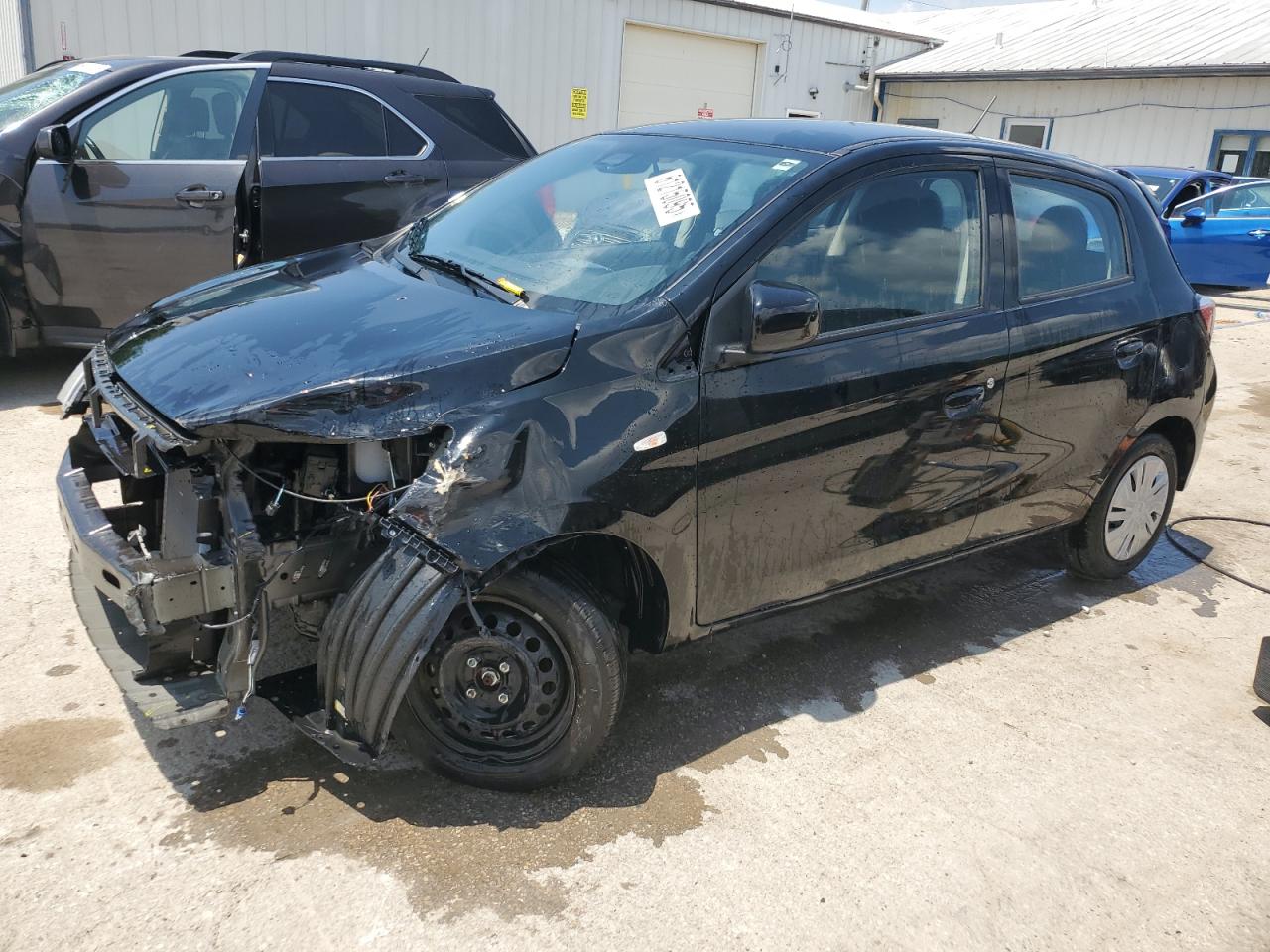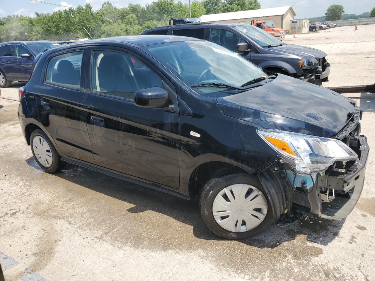 FairThe MITSUBISHI MIRAGE ES 2024, a black hatchback, exhibits significant front-end damage, classified as Body damage, indicating impact to body panels. The undercarriage also shows signs of damage. The vehicle's exterior condition is rated as Fair due to the extent of the front-end damage and the likelihood of needing repairs. Interior condition is Good. The car is drivable, though repairs are needed, especially for the front. The vehicle starts.