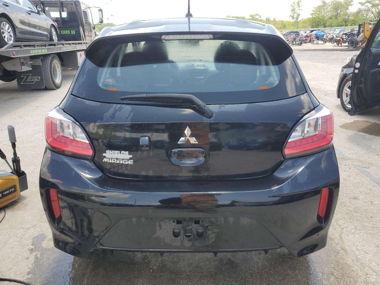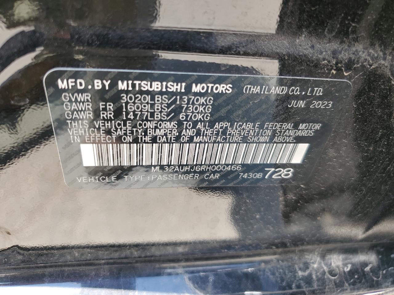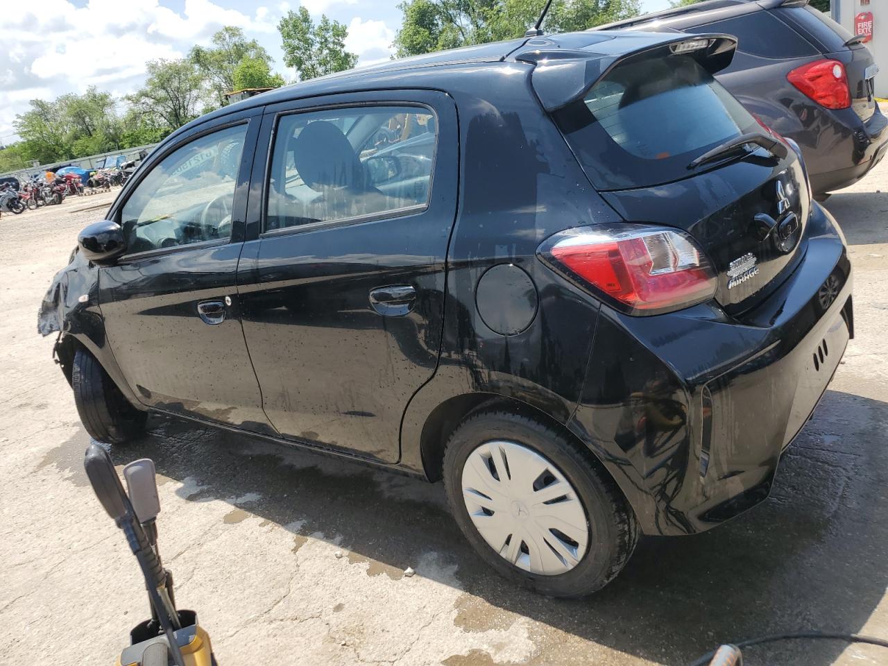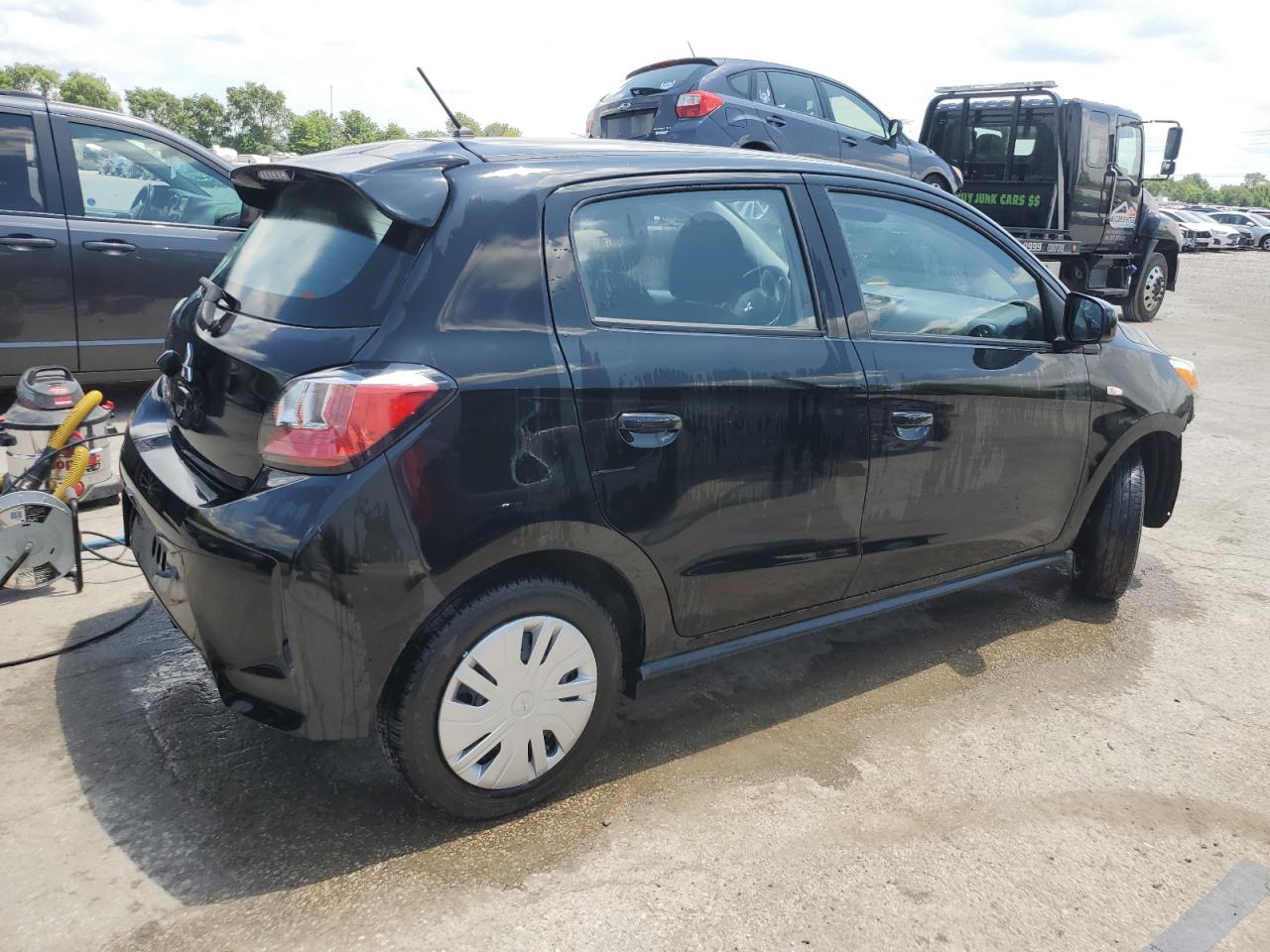 FairThe MITSUBISHI MIRAGE ES 2024, a black hatchback, exhibits significant front-end damage, classified as Body damage, indicating impact to body panels. The undercarriage also shows signs of damage. The vehicle's exterior condition is rated as Fair due to the extent of the front-end damage and the likelihood of needing repairs. Interior condition is Good. The car is drivable, though repairs are needed, especially for the front. The vehicle starts.