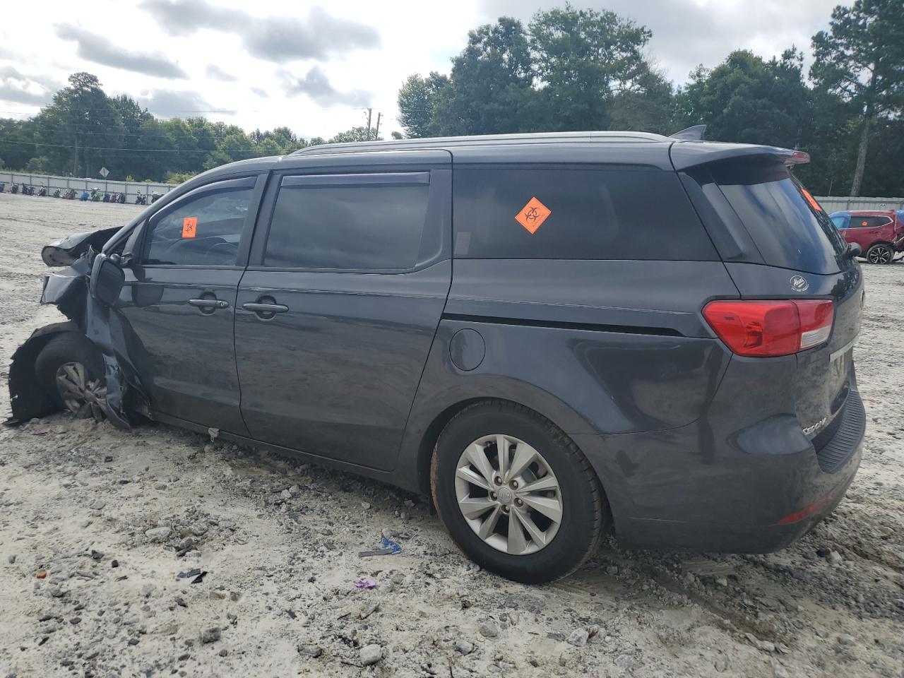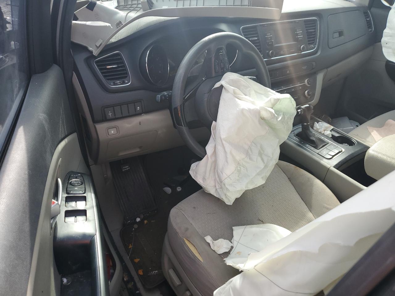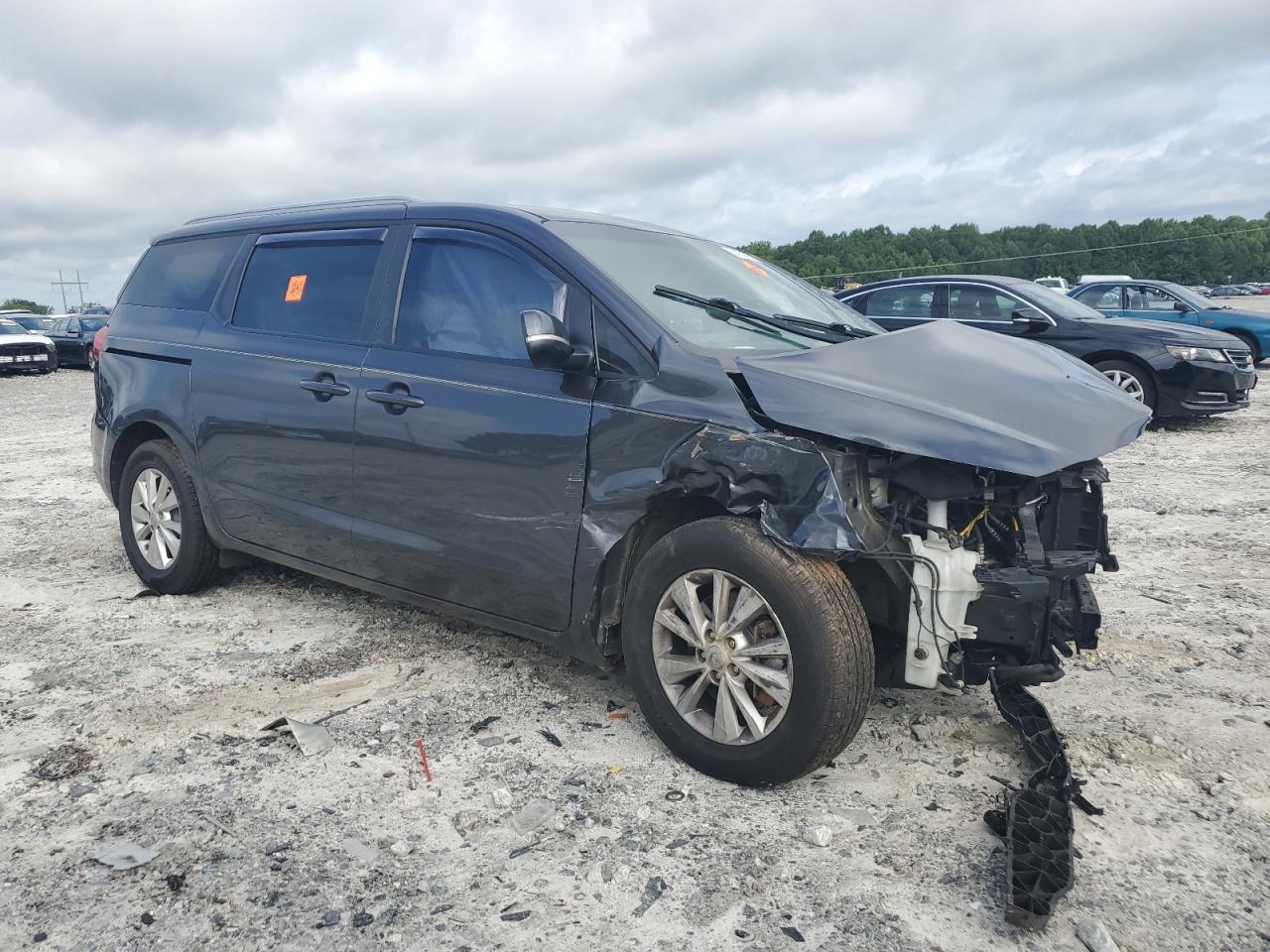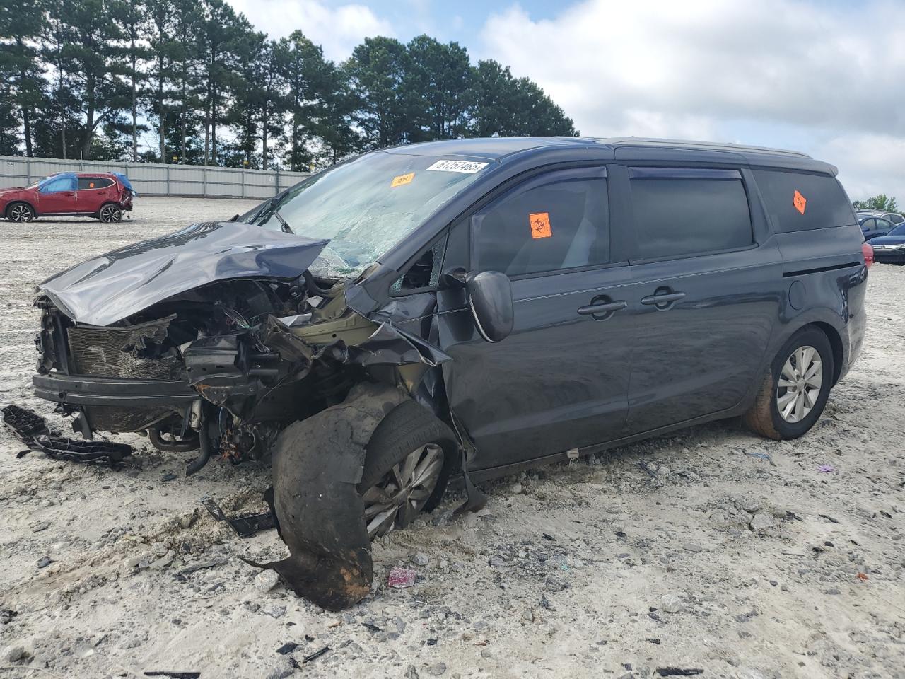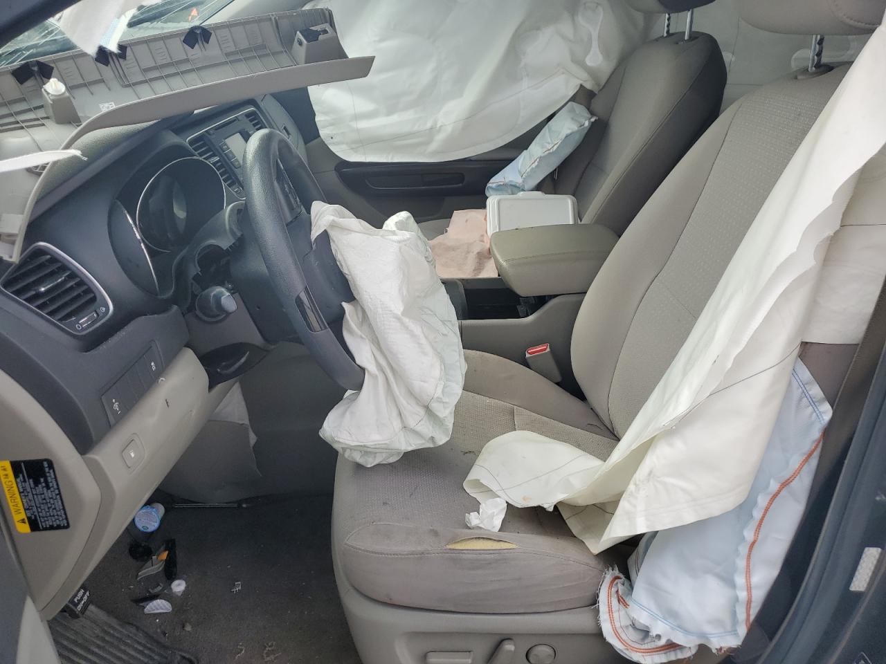 PoorThe 2016 KIA SEDONA LX in gray exhibits significant damage. The primary damage is to the UNDERCARRIAGE and the secondary damage is to the FRONT END. The car's front end is severely impacted, with extensive damage to the body panels, lights, and wheels. The wheels are visibly damaged, and the glasses show some damages. The interior has airbag deployment, visible damage and wear. The car is in a state that requires considerable repair and is not drivable.