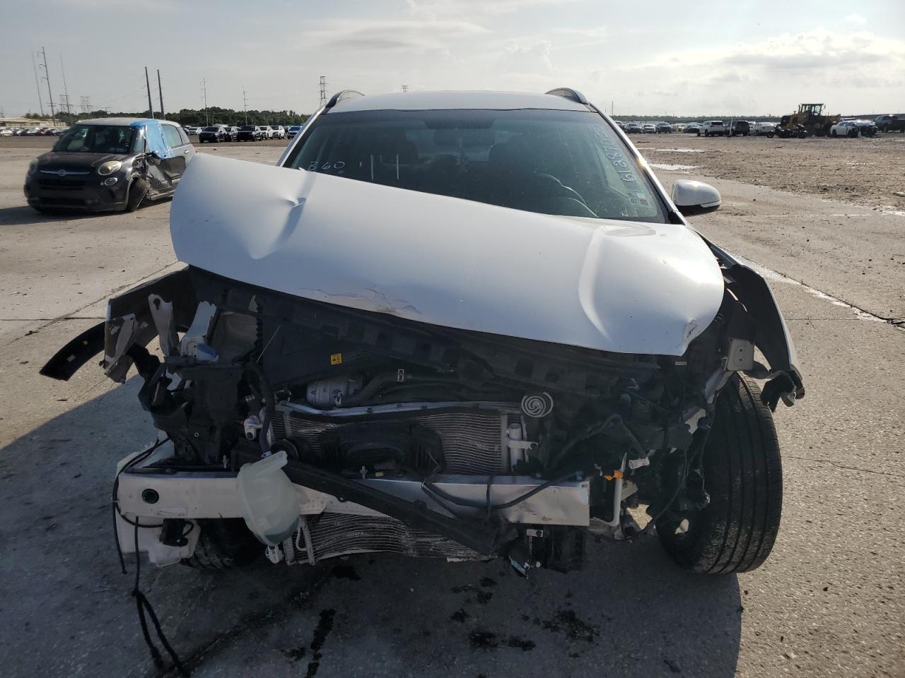 Extensive front-end collision damage including the bumper, hood, and front panels. Airbags deployed. Interior shows signs of impact.