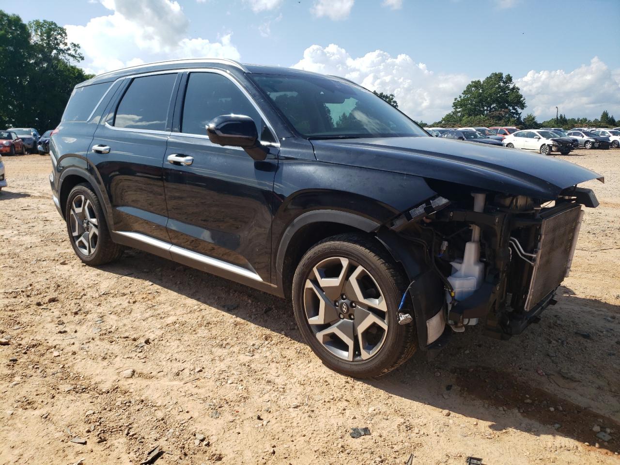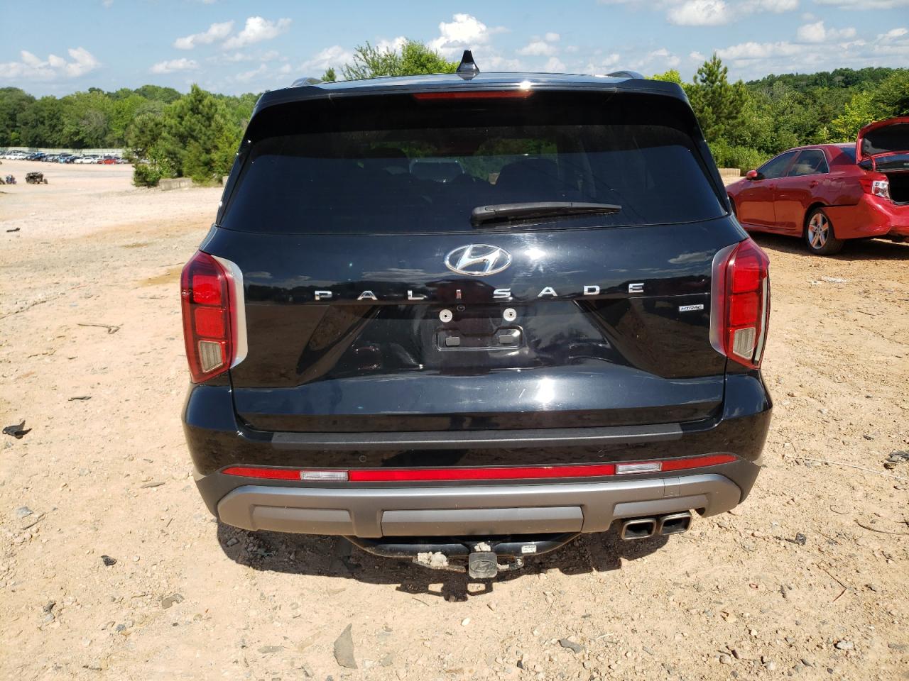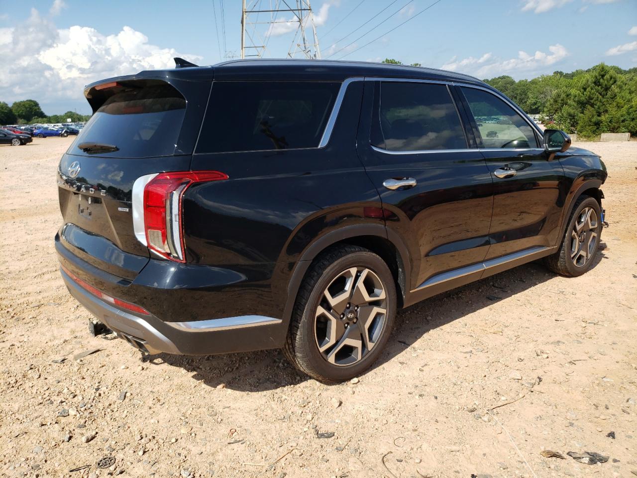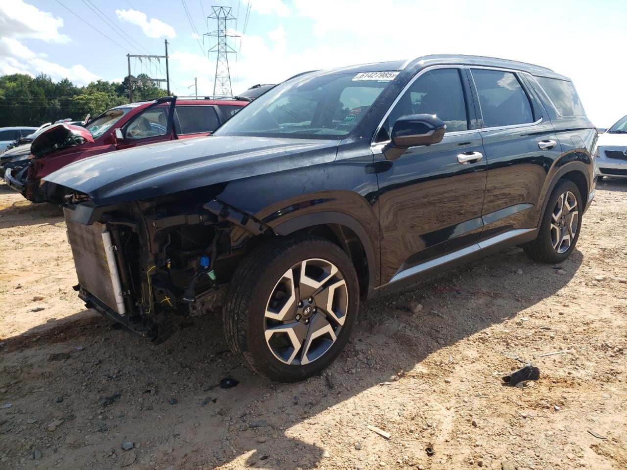 FairHYUNDAI PALISADE L 2023, black color with front and rear end damage. Run & Drive Verified. The front end shows significant damage, including the bumper and hood, while the rear end has damage as well. The interior shows minimal damage. The car is drivable despite the visible damage.