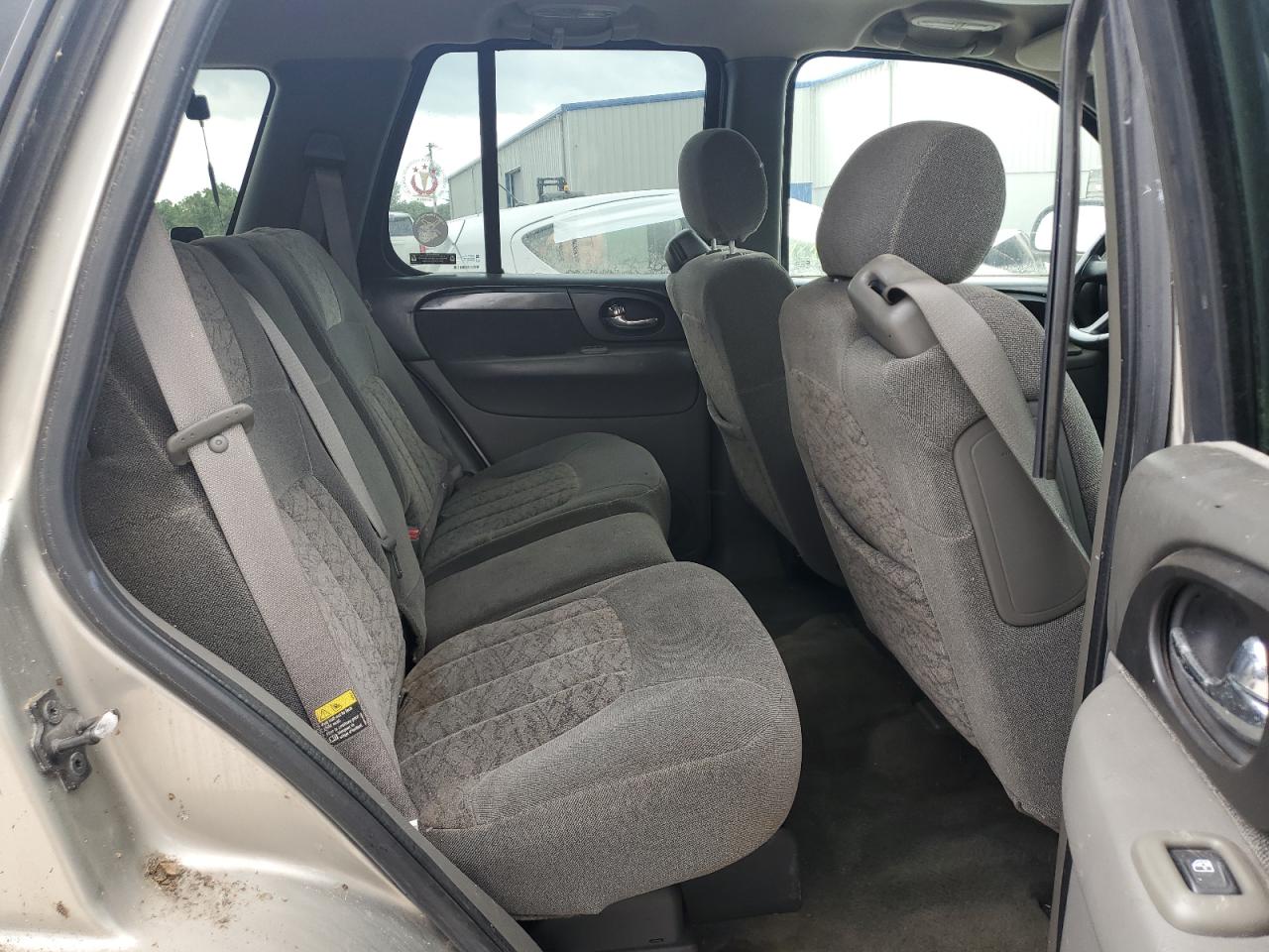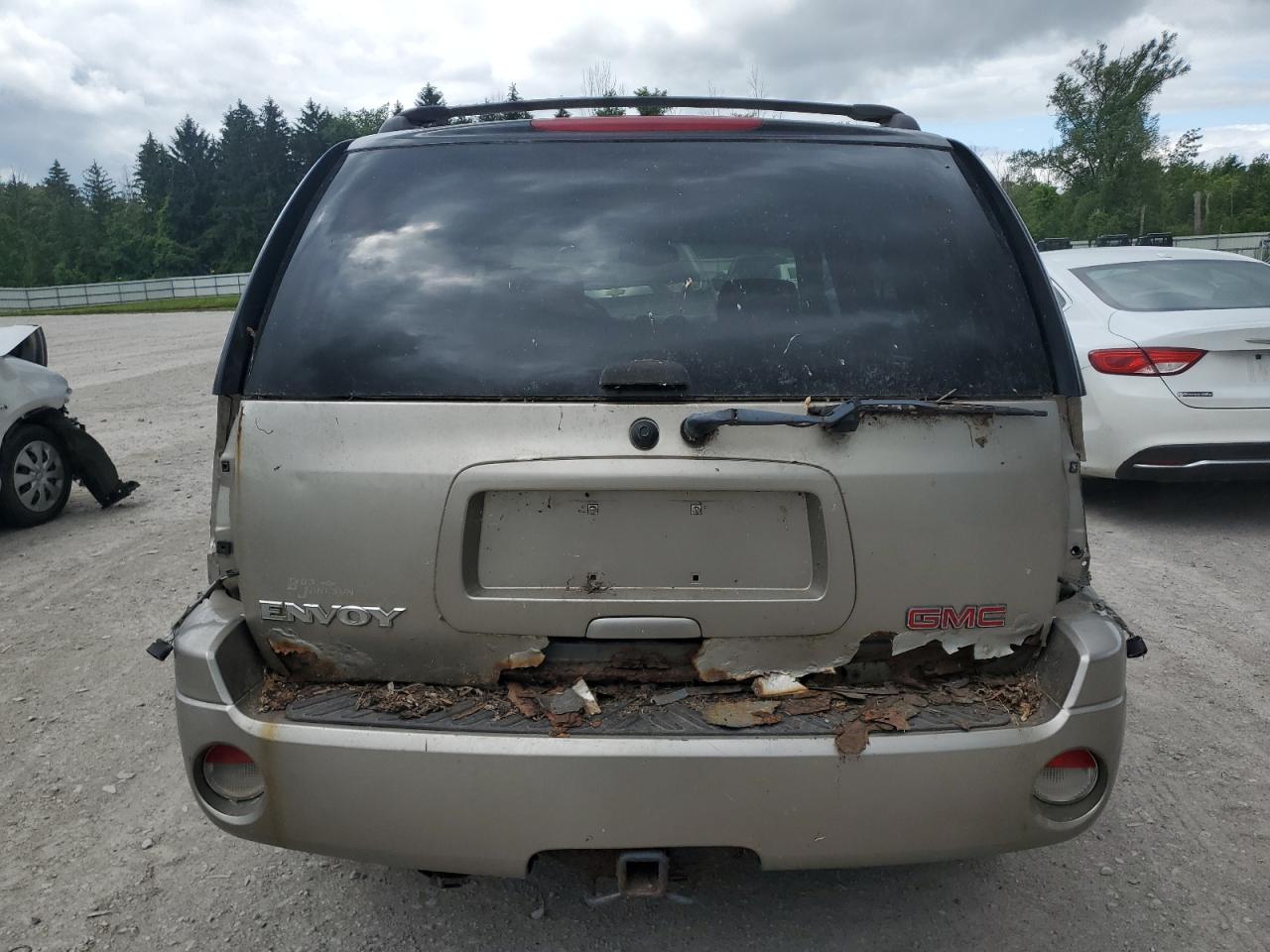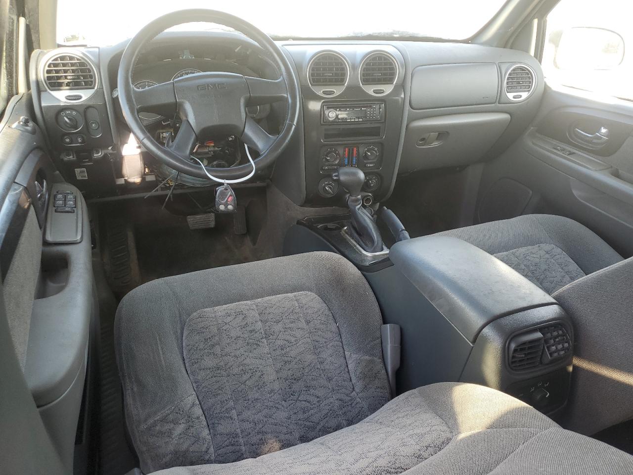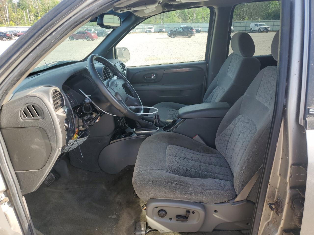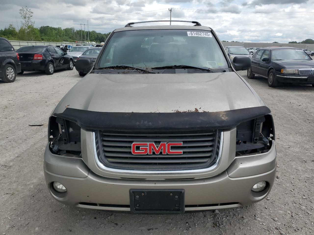 The GMC Envoy shows significant exterior body damage, particularly to the front and rear. Interior condition is good with moderate wear. The vehicle is drivable, wheels are fine, but it needs repairs.