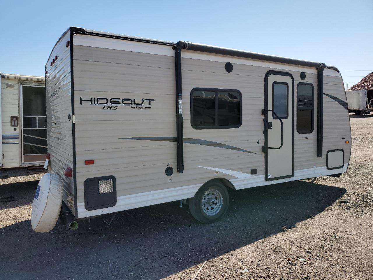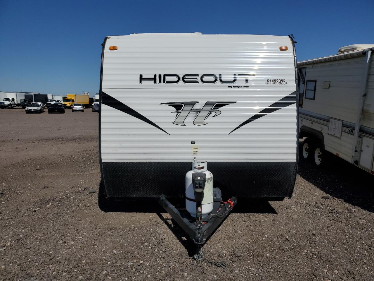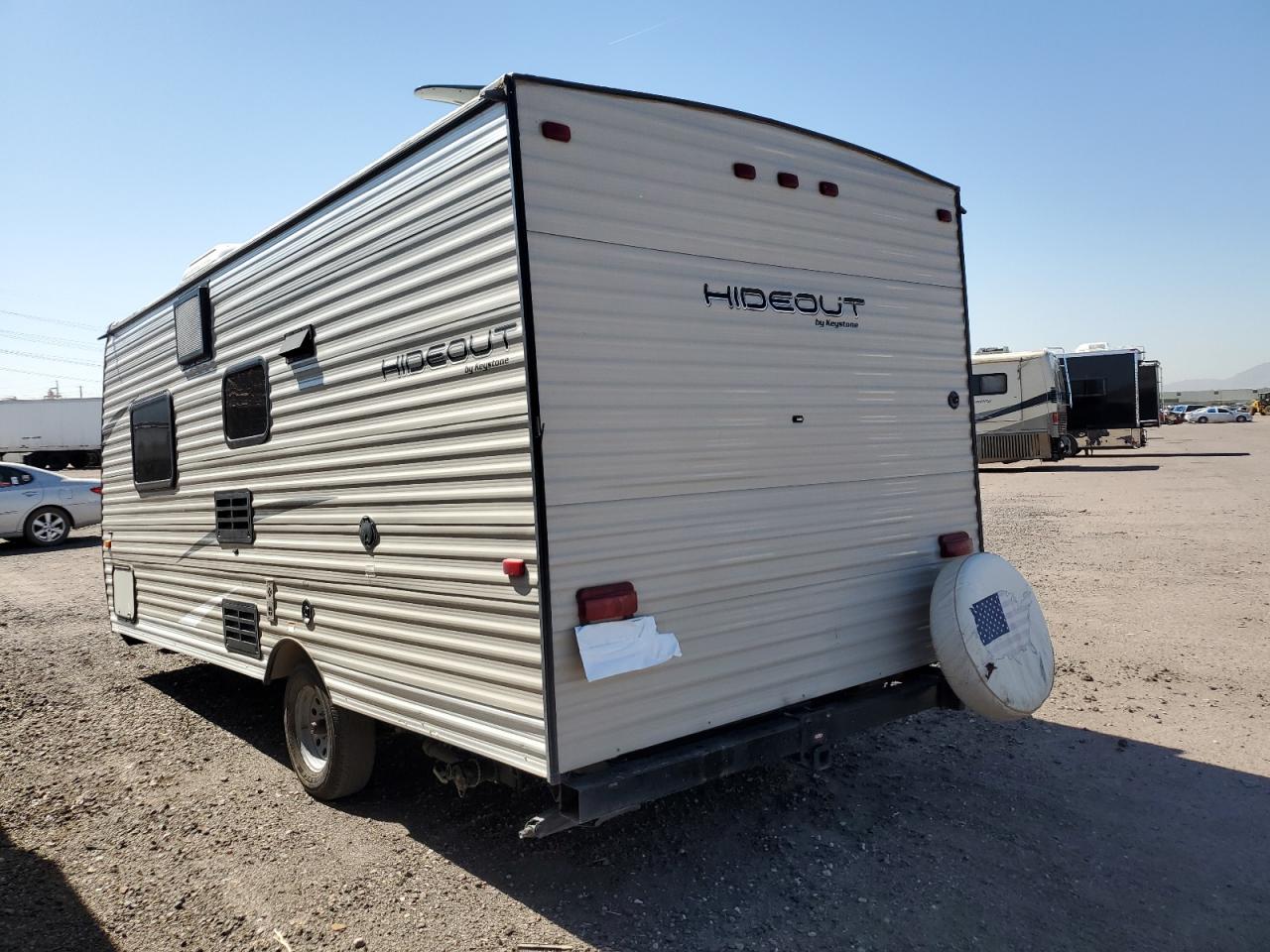 GoodThe KEYSTONE HIDEOUT 2019 appears to have body damage, affecting its exterior. The wheels and glasses seem to be in good condition. The vehicle has a white color. There is no damage to the wheels. It's a travel trailer, suggesting it's designed for recreational use, potentially for camping or road trips. The damage is cosmetic. The vehicle is drivable