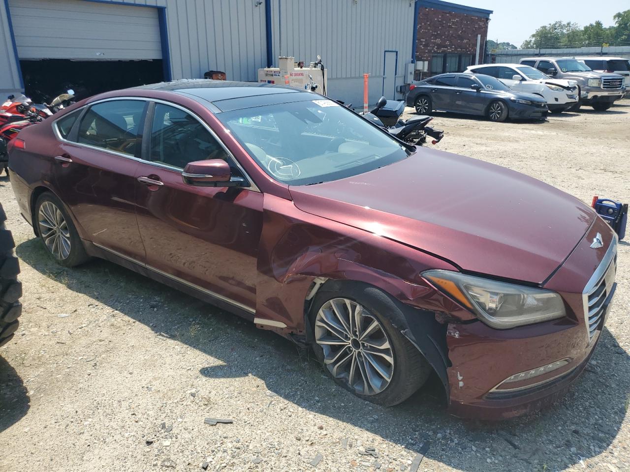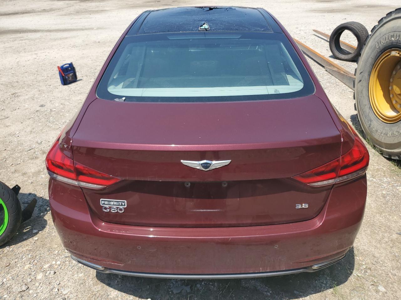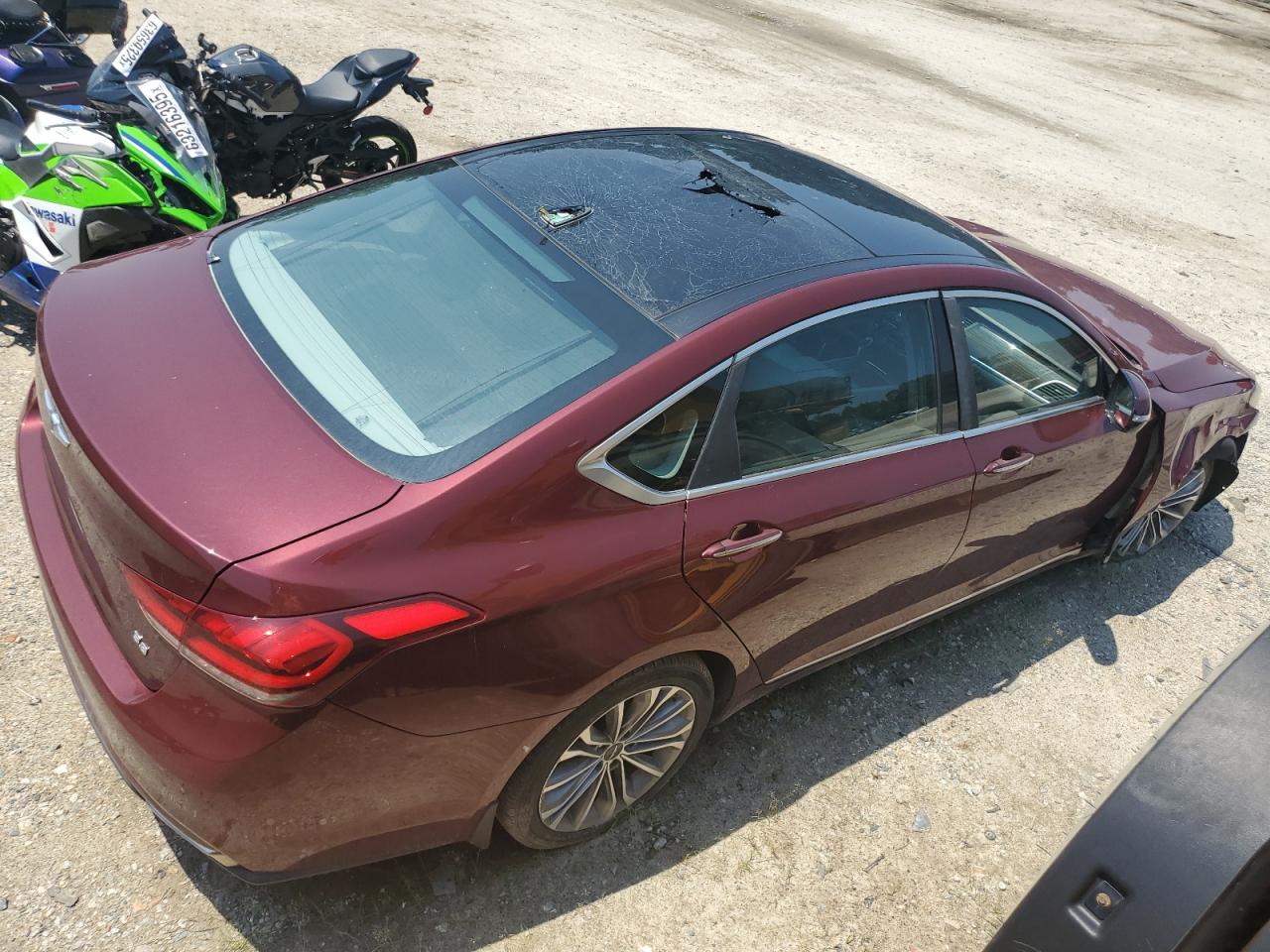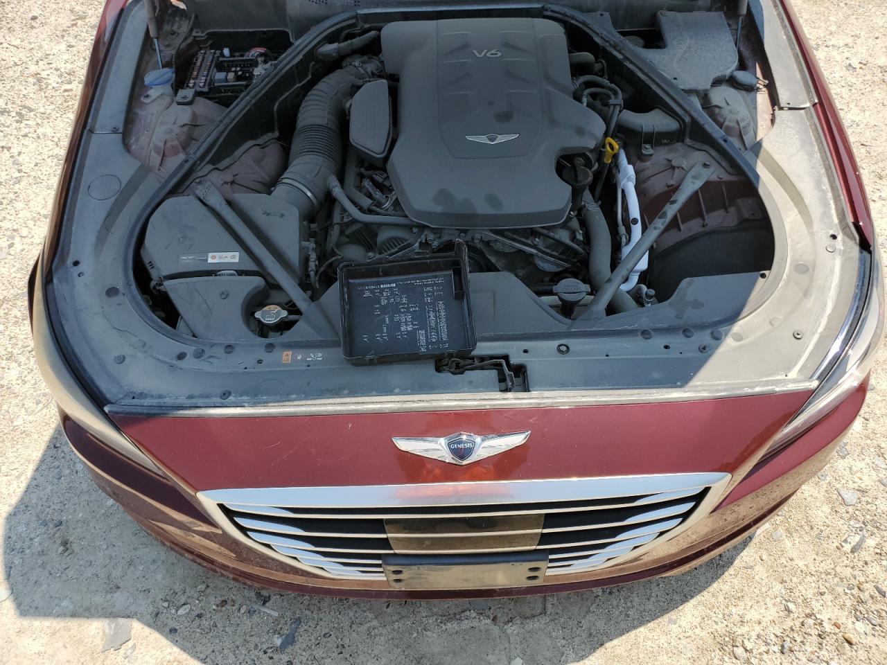 FairThe 2017 Genesis G80 BASE is burgundy with significant front-end damage and a damaged top/roof, indicating a 'Run & Drive Verified' start. The car shows visible damage to the front end with significant body panel damage. The interior shows moderate signs of wear, with possible airbag deployment. The wheels appear to be intact. The lights and glasses are damaged.