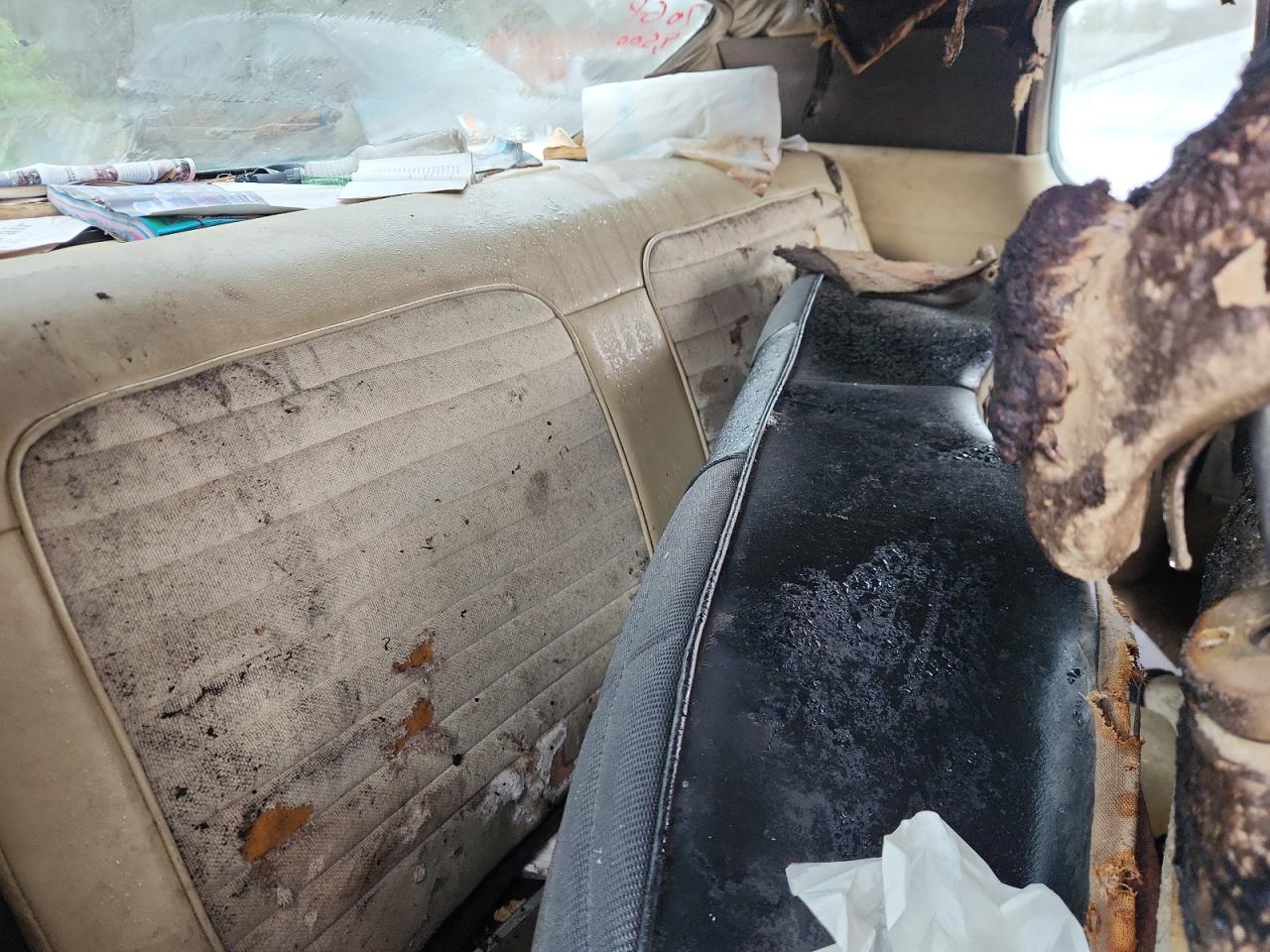 Extensive fire damage to both interior and exterior, body panels showing signs of burn damage.