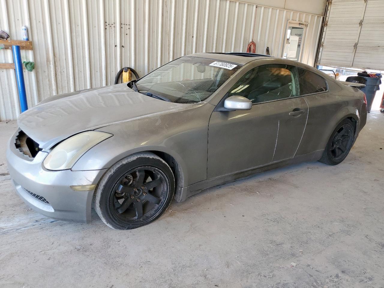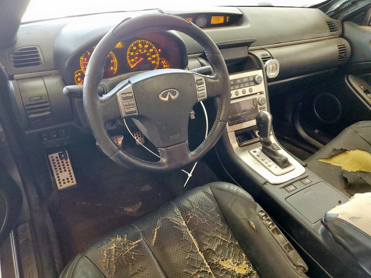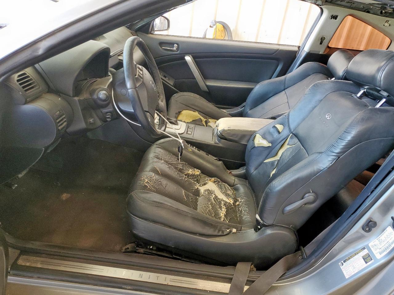 FairThis 2005 INFINITI G35 in gray color has sustained significant damage, particularly to its body panels and side due to hail. The vehicle's Run & Drive status is Verified. The exterior shows considerable wear, including dents and damage. The interior is showing significant wear and tear with torn seats. The wheels appear to be functional. The lights and glasses seem to be intact, but the overall condition is indicative of a vehicle that requires repair. The airbags condition is not clear.
