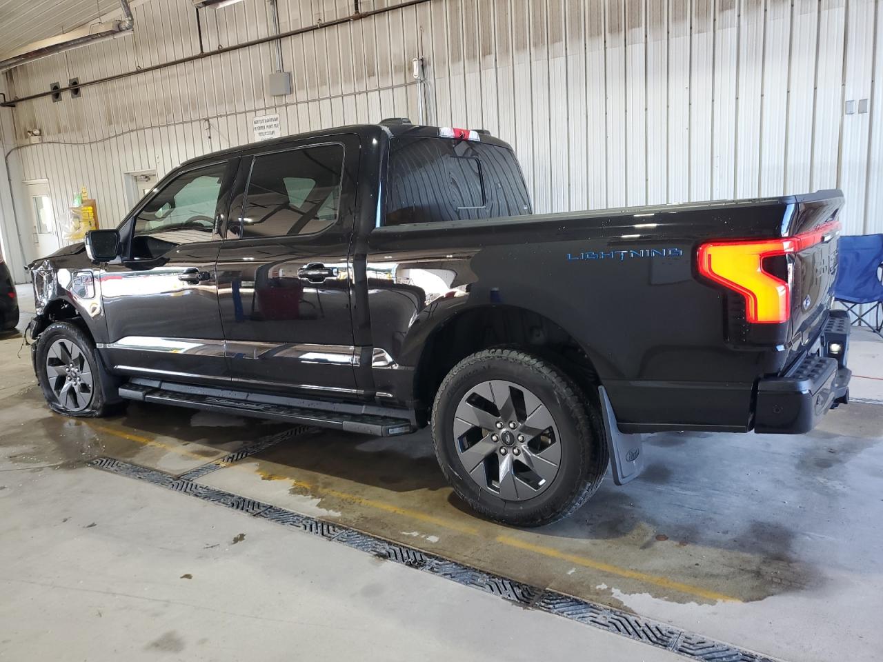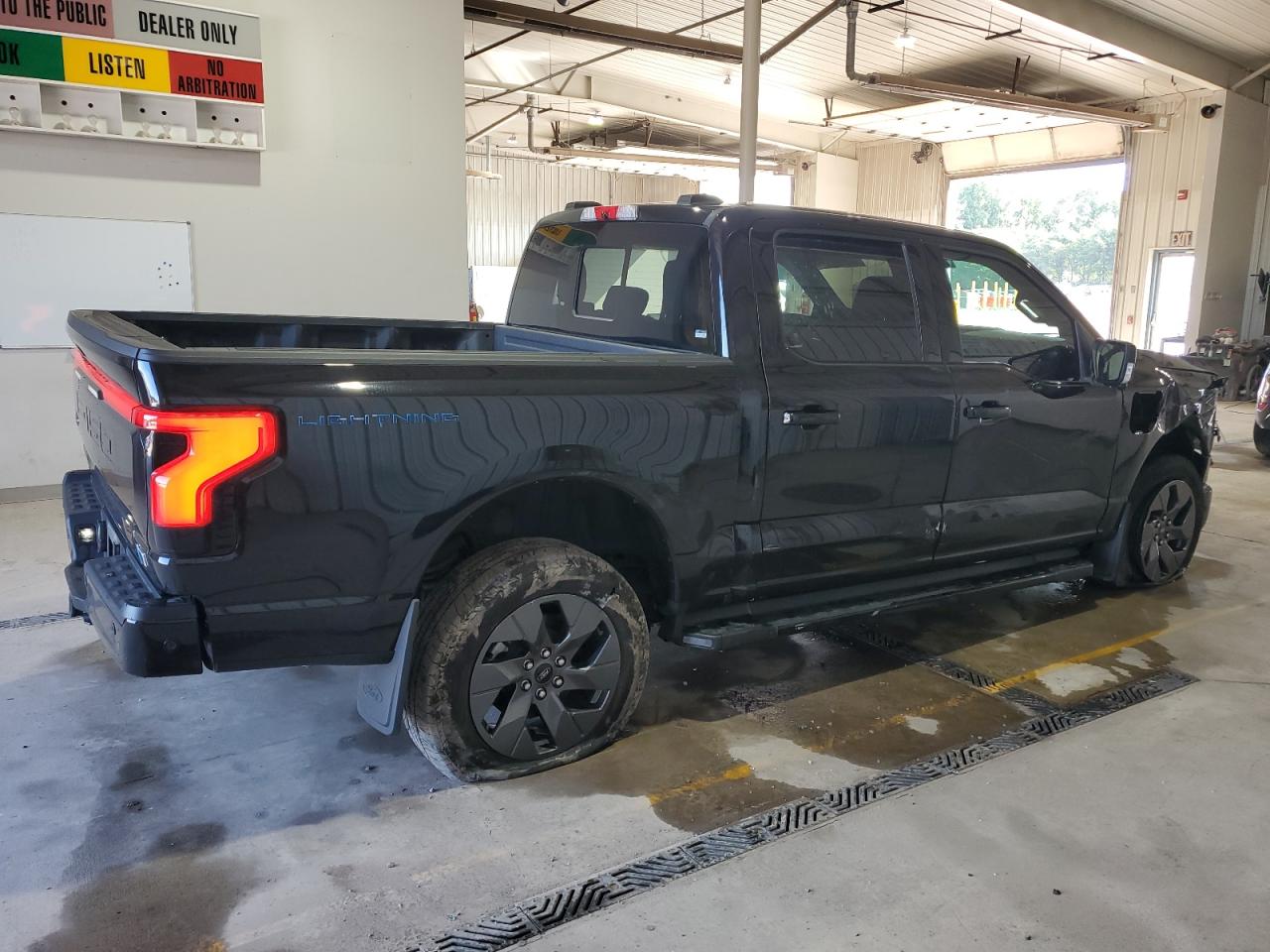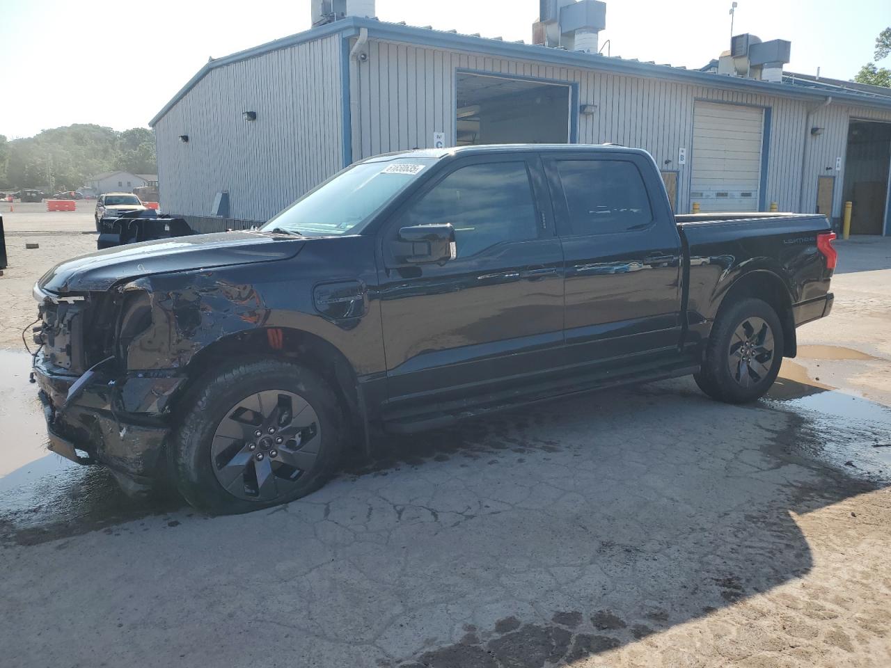 Fair2023 FORD F150 LIGHTNING, black, Run & Drive Verified. The vehicle has sustained front end and side damage. The front end exhibits significant damage, including the bumper, hood, and front panels. Side damage is also noticeable. Wheels appear damaged. The lights have sustained damage. The interior shows signs of use, with no visible airbag deployment. The car is drivable.