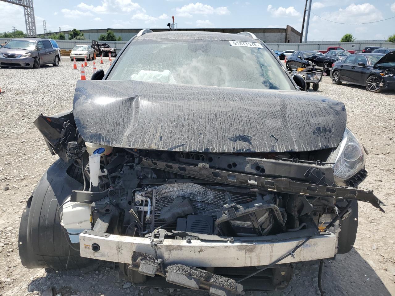 Severe front-end damage, including body panels, lights, and structural components. Airbags deployed. Interior damage visible.