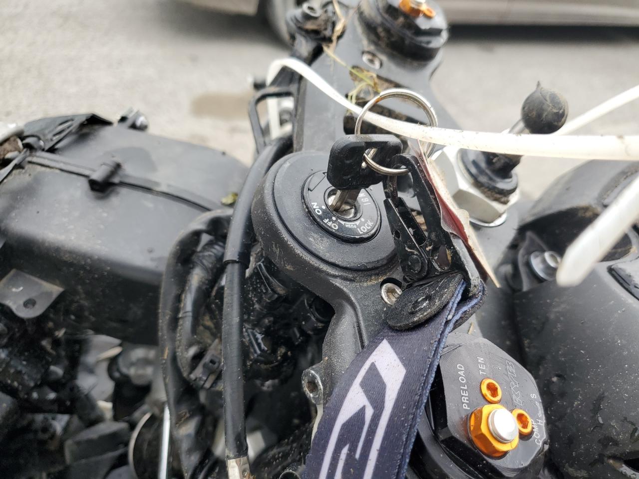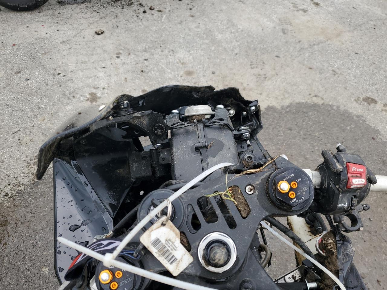 The motorcycle exhibits extensive damage, primarily to the body, consistent with a rollover incident. The front fairing is crushed, the frame is likely compromised, and numerous body panels are severely damaged. The wheels and suspension components also show signs of impact damage.