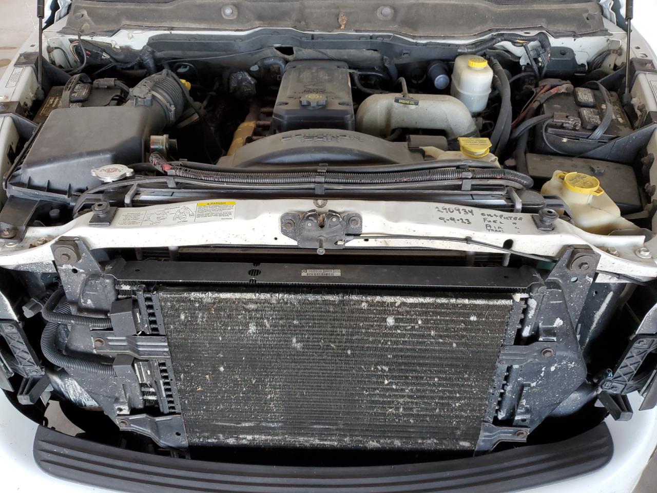 The Dodge Ram 2500 has moderate visible damage, particularly to the front end and undercarriage. The body panels show signs of wear. The interior condition is also fair, with noticeable wear and tear. Wheels and lights appear to be in decent condition, and the glass seems intact. Based on the images, interior damage is present, and the airbag status needs to be checked.