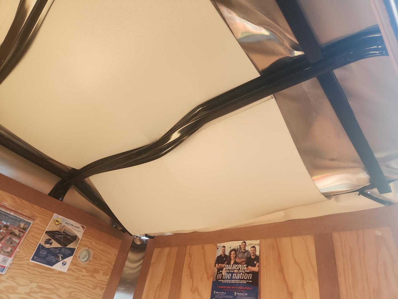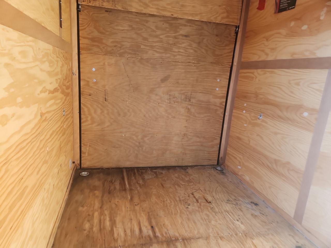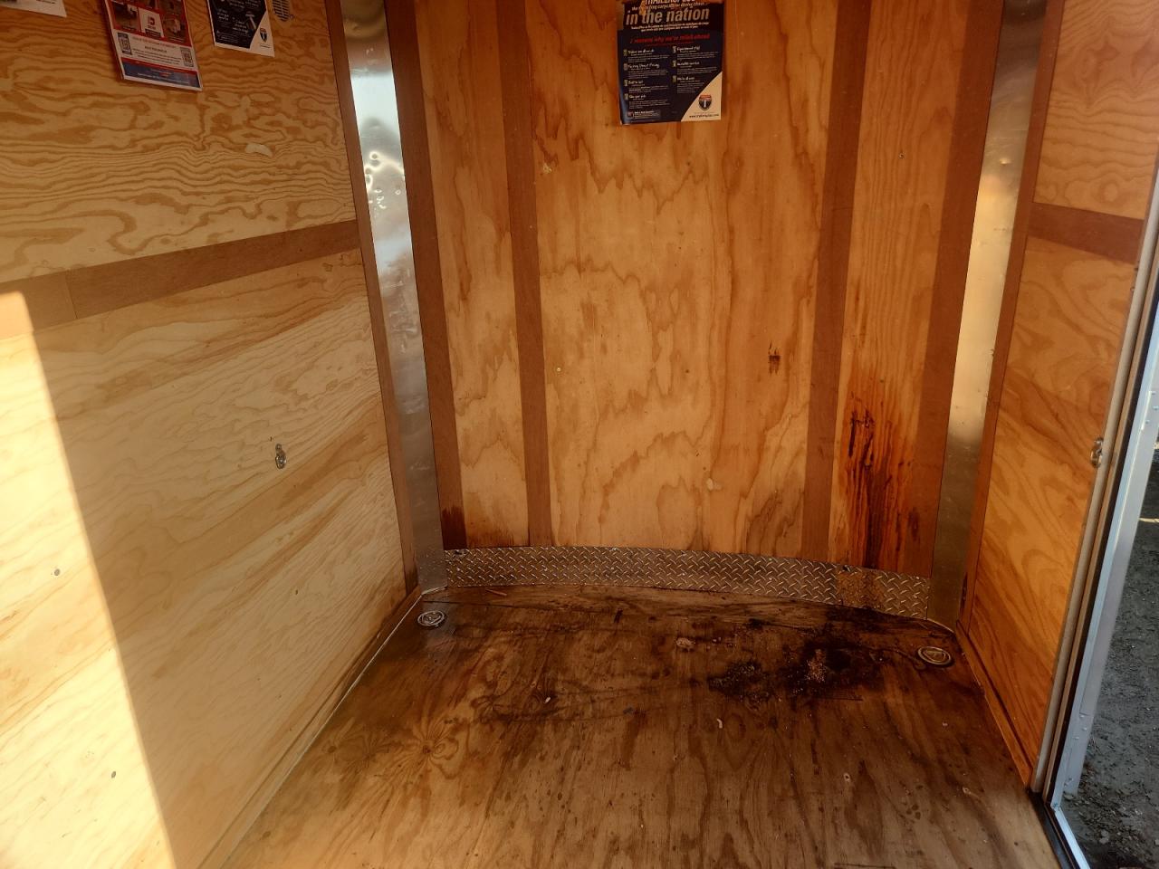 Body damage affecting the panels and roof of the cargo trailer. The trailer appears drivable with no significant mechanical issues. The interior shows signs of wear consistent with normal use.