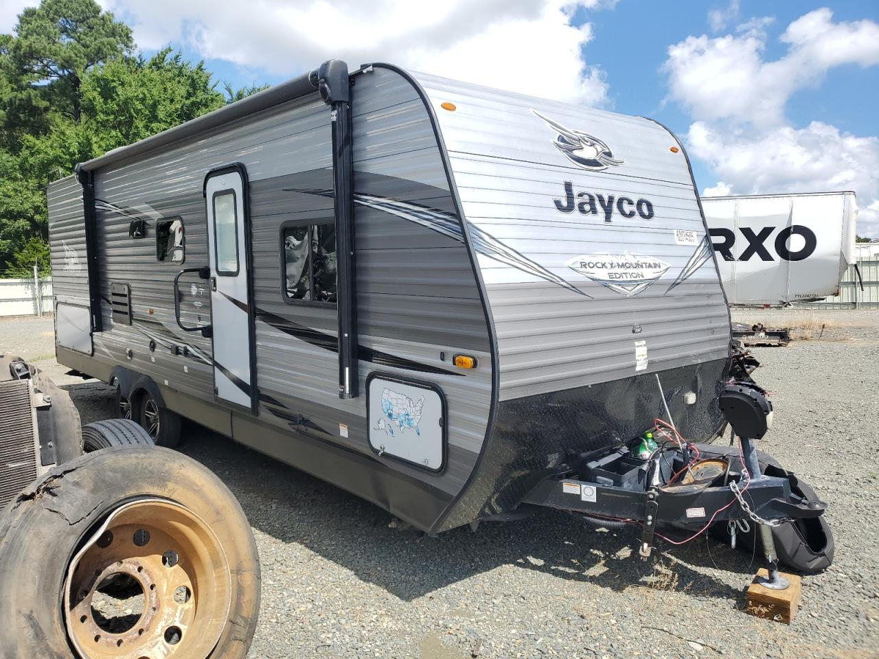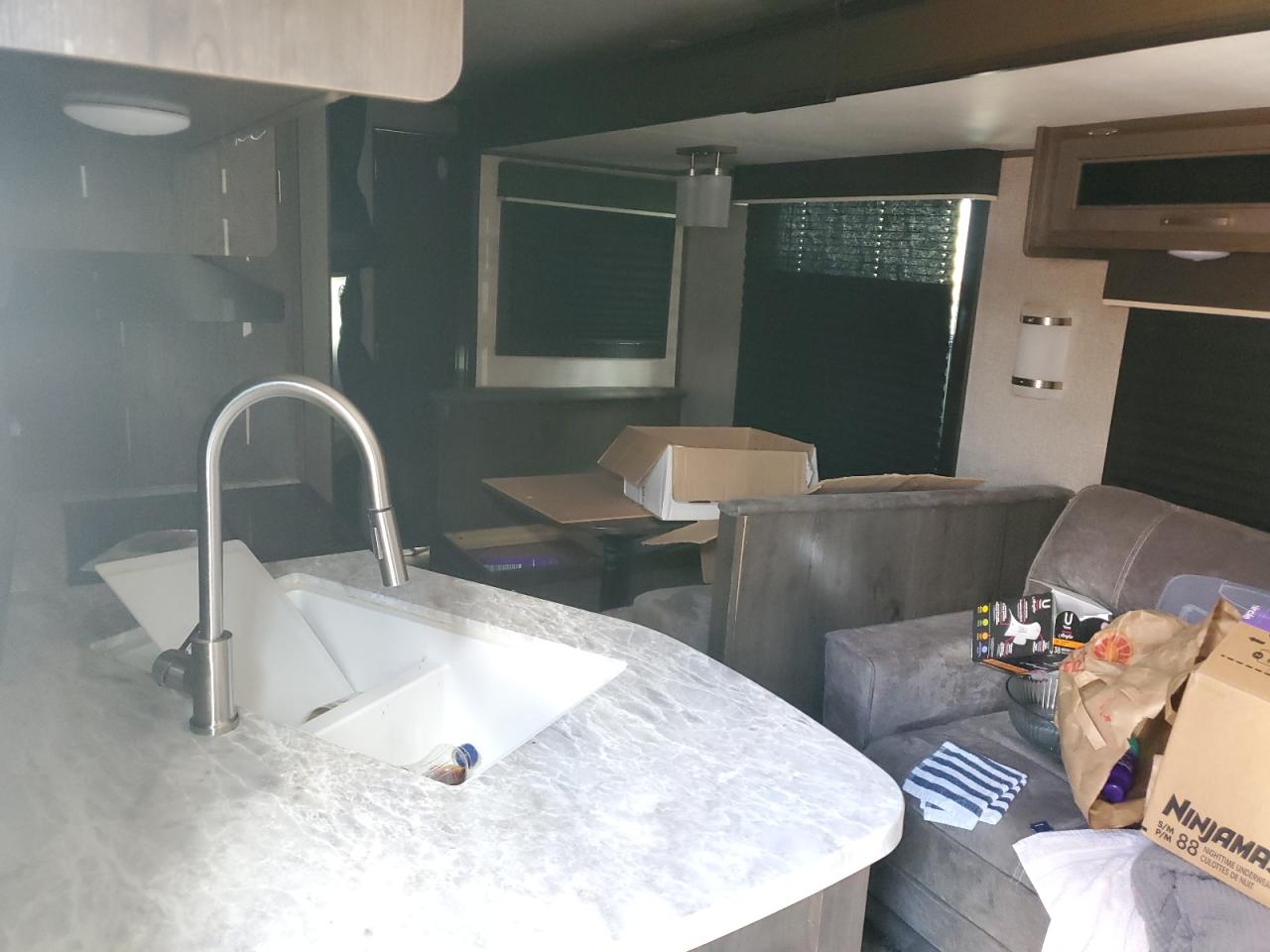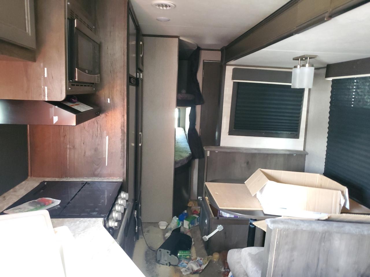 FairThe 2021 Jayco trailer exhibits significant damage. The primary damage is to the side, with substantial secondary damage to the front end, indicating a collision. The trailer's exterior is gray, and it shows clear signs of impact. The interior appears to have damage as well. The trailer is not drivable.