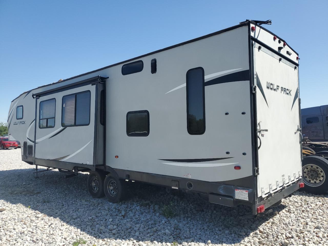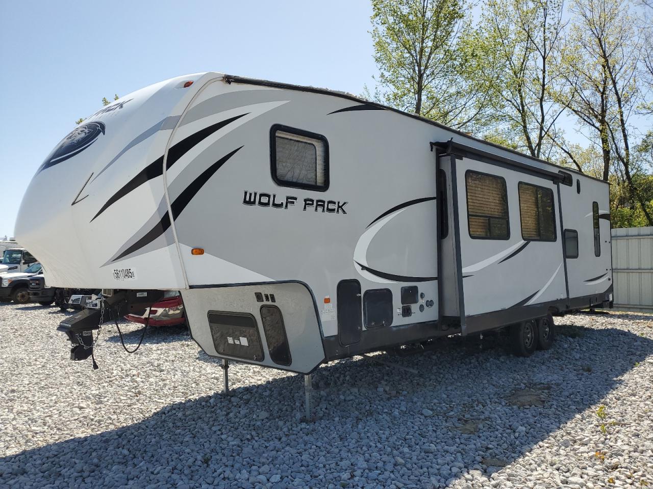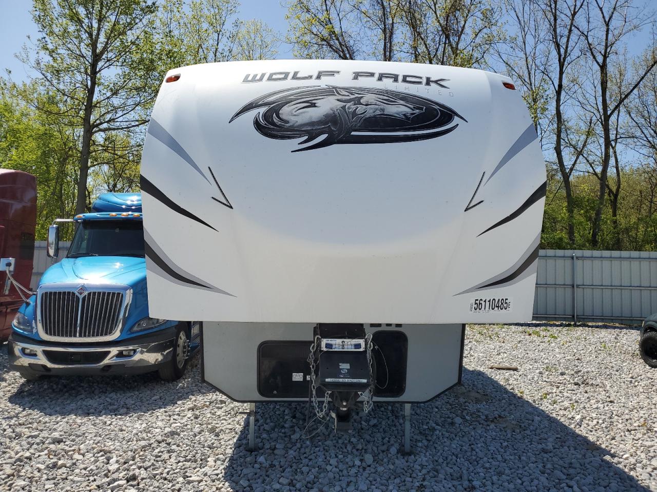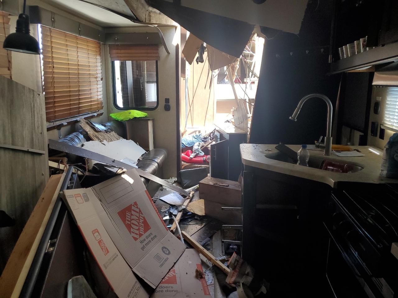 FairThe 2018 Wildwood Wolf Pack is a gray RV. It exhibits significant damage primarily to the top/roof, with secondary minor dents and scratches. The vehicle is in a state of disrepair, with visible exterior and interior damages. The wheels appear to be intact, with no visible damage, and the lights are also ok, but roof damage. The interior shows damage.