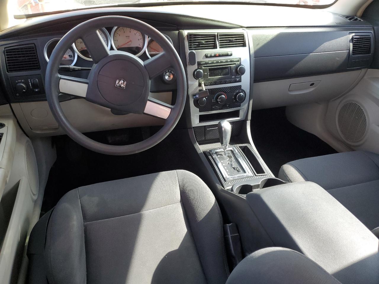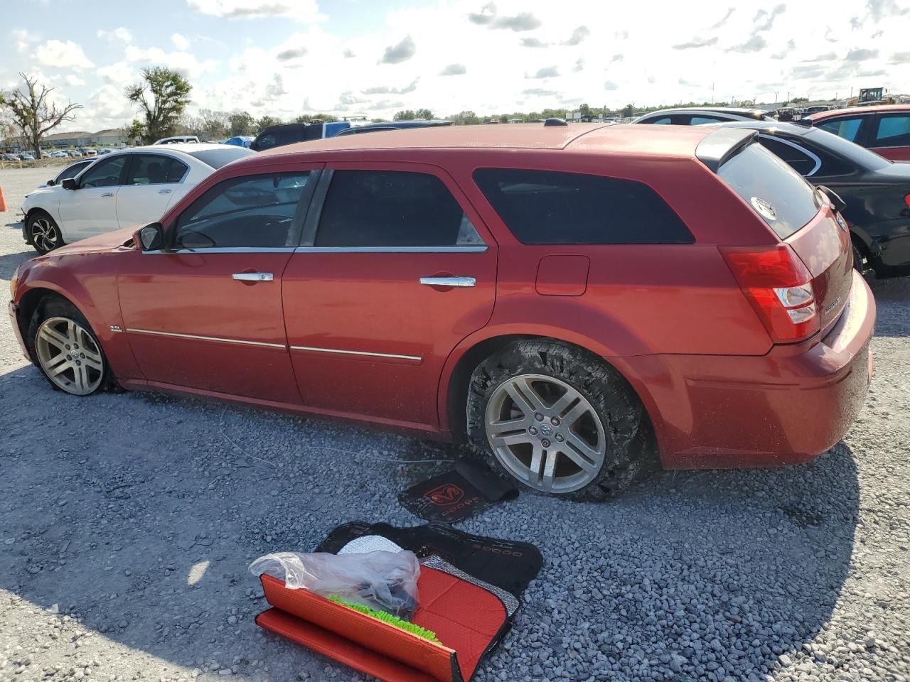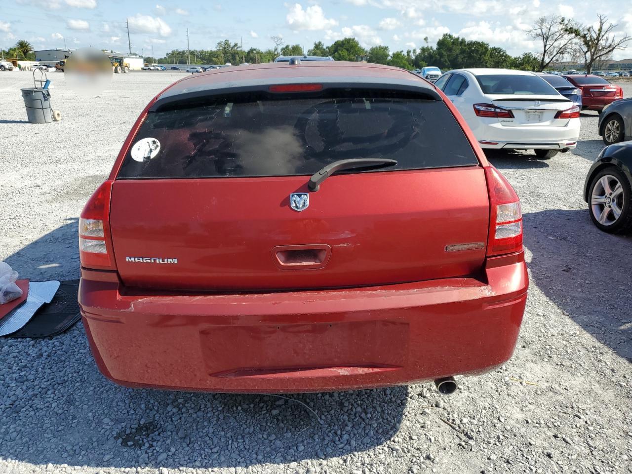 The Dodge Magnum SXT has body damage, specifically on the undercarriage. The exterior has some cosmetic imperfections. Interior shows wear and tear but is in relatively good shape. Wheels and lights appear to be intact.