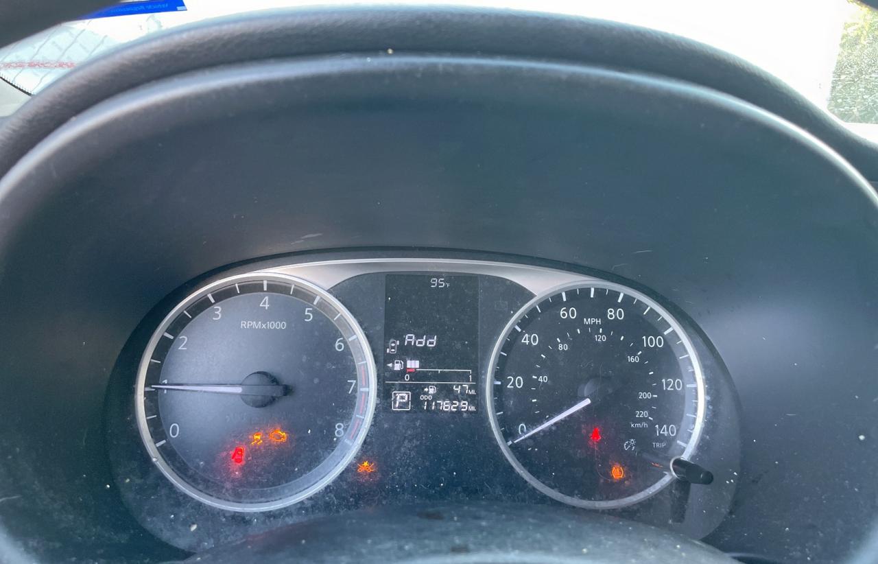The vehicle has significant front-end damage. It has moderate body panel damage and some signs of previous repair. The interior shows normal wear and tear consistent with its age and mileage.