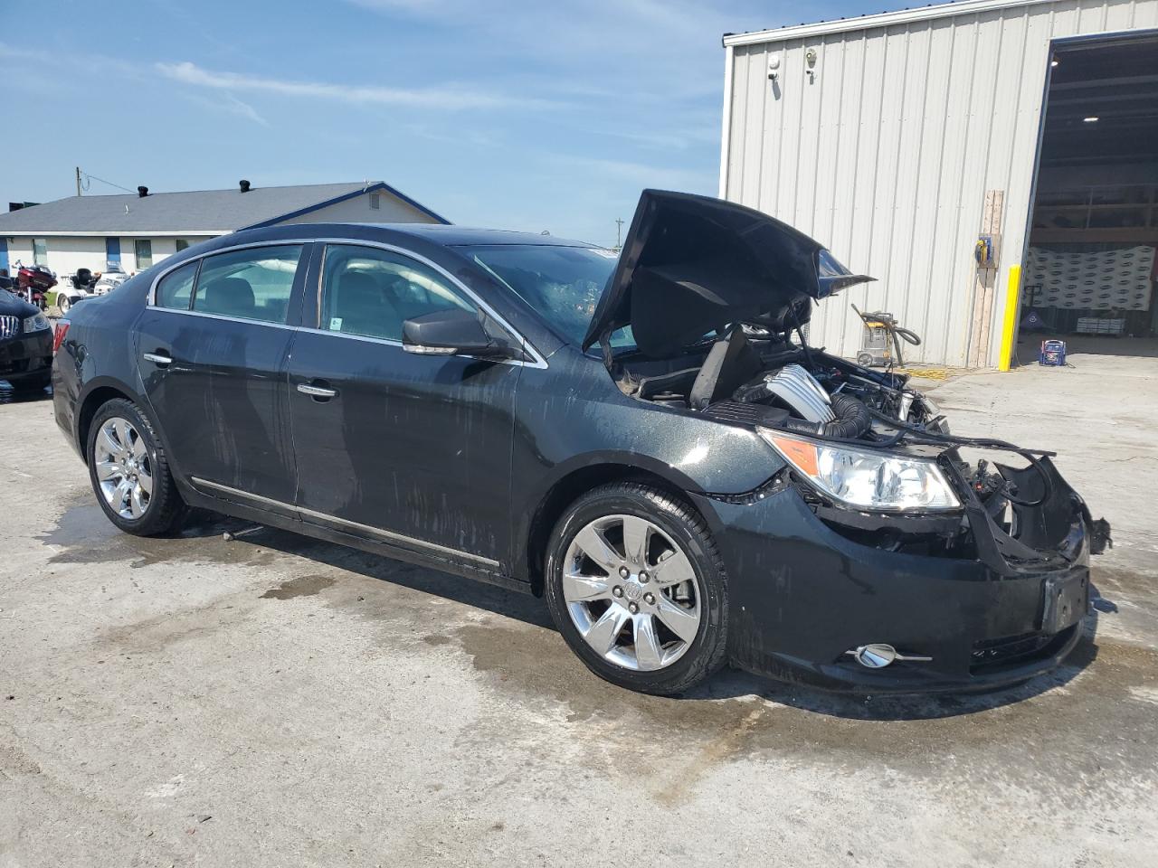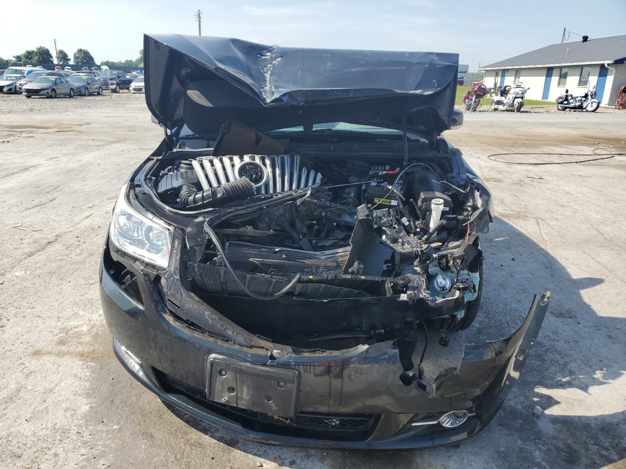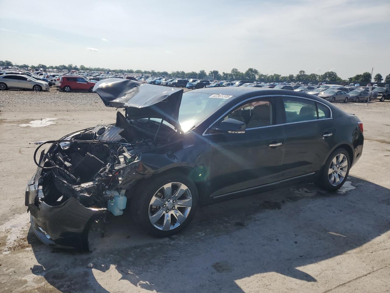 PoorThe 2011 Buick LaCrosse C is a black sedan. It has sustained significant front-end damage, with the hood crumpled, the front bumper and grille severely damaged, and potential damage to the engine components. The airbags have deployed, indicating a significant impact. The interior shows wear and tear. Overall, the vehicle is in poor condition.
