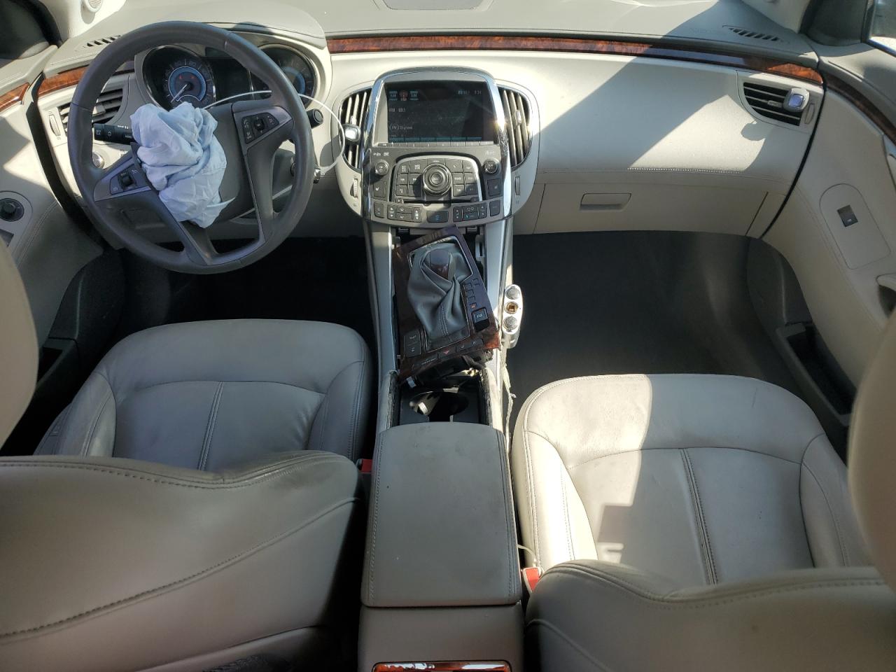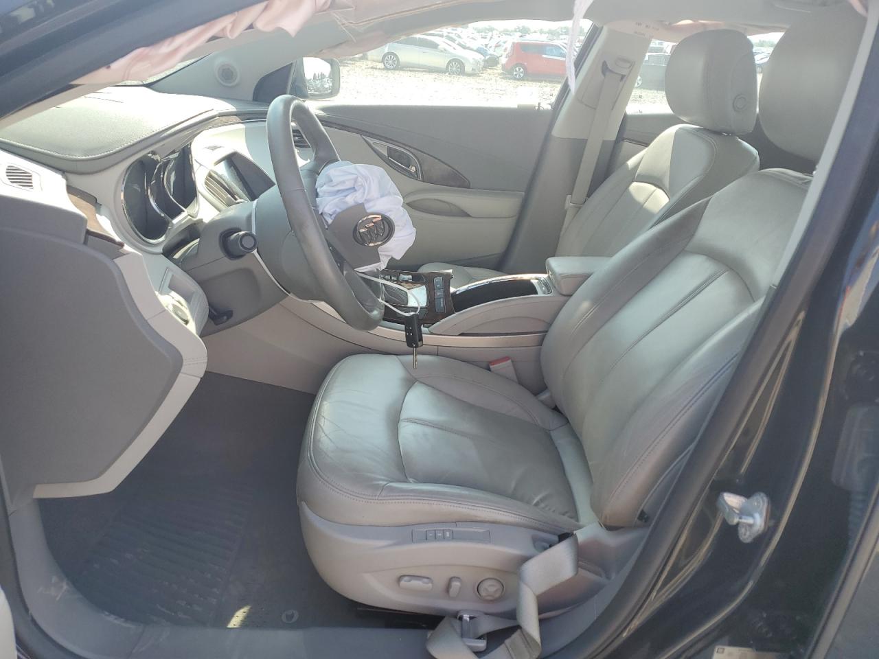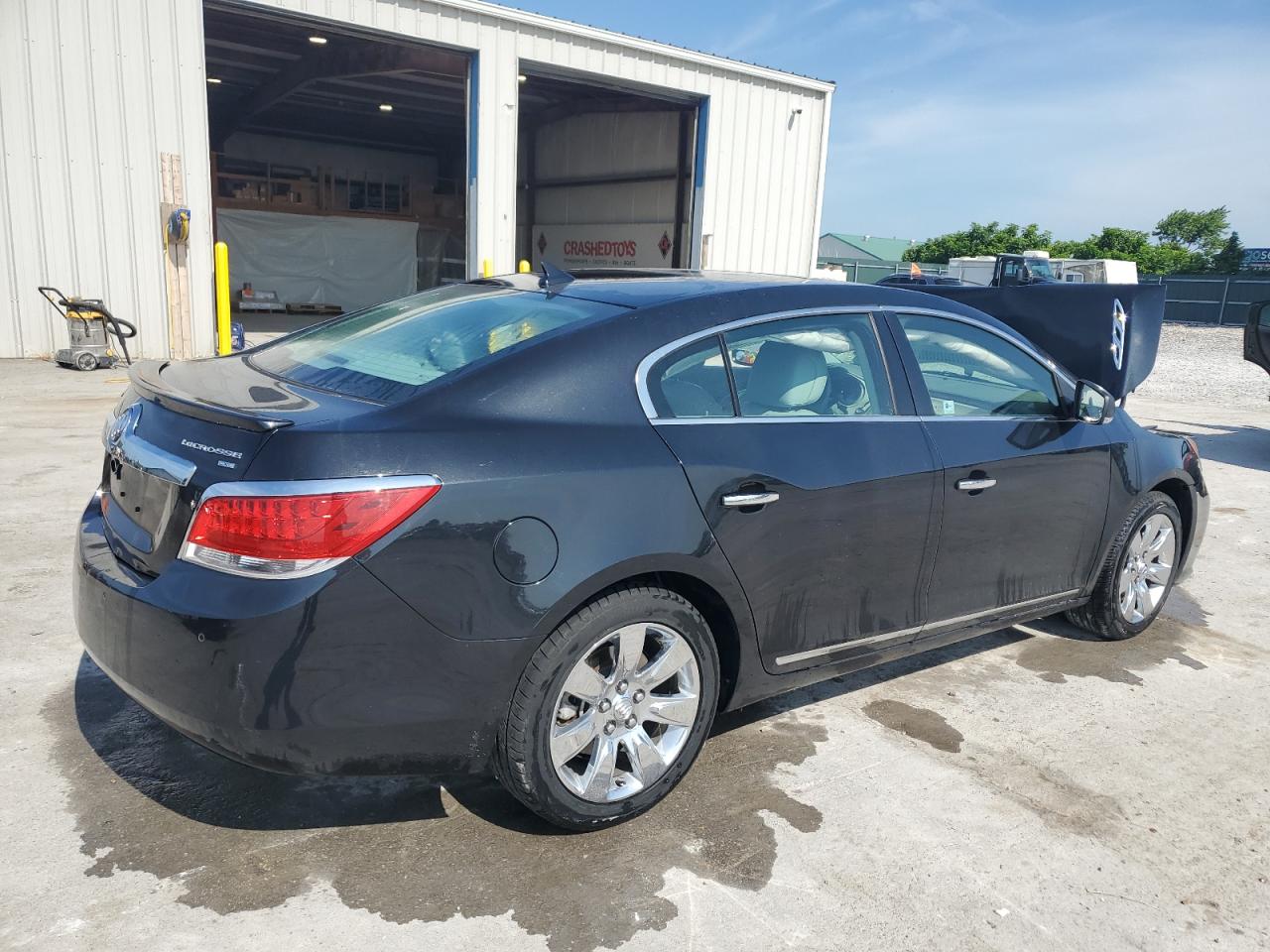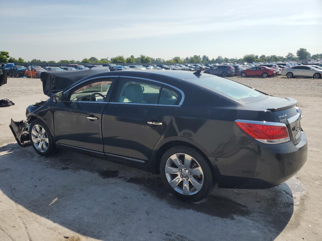 PoorThe 2011 Buick LaCrosse C is a black sedan. It has sustained significant front-end damage, with the hood crumpled, the front bumper and grille severely damaged, and potential damage to the engine components. The airbags have deployed, indicating a significant impact. The interior shows wear and tear. Overall, the vehicle is in poor condition.