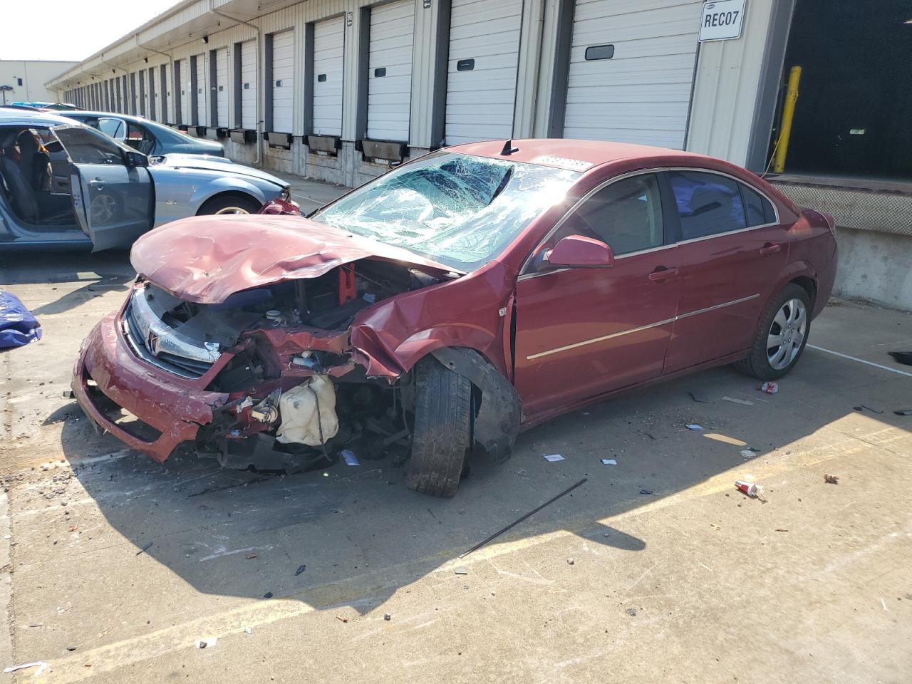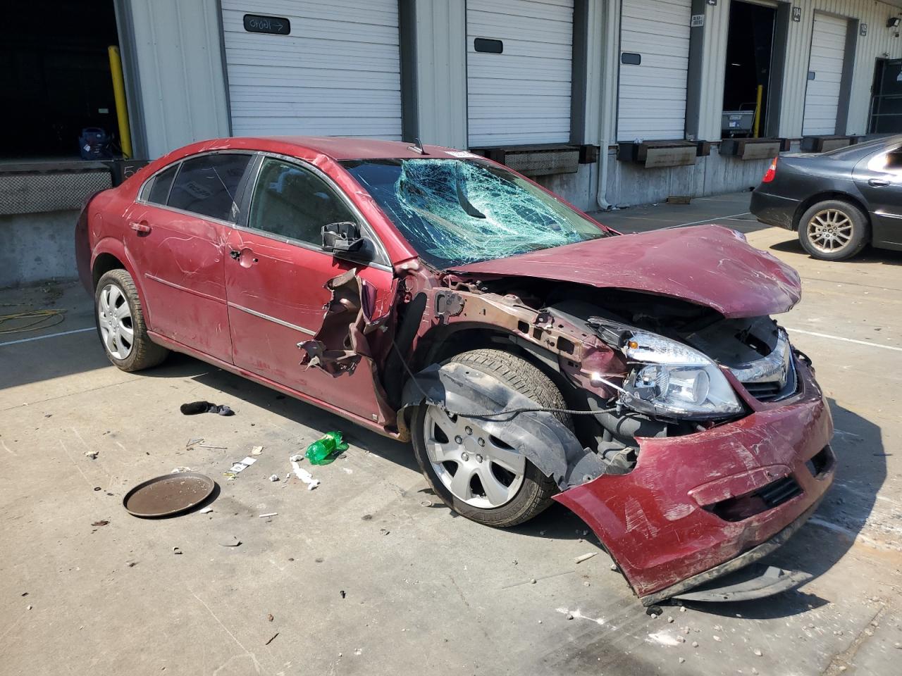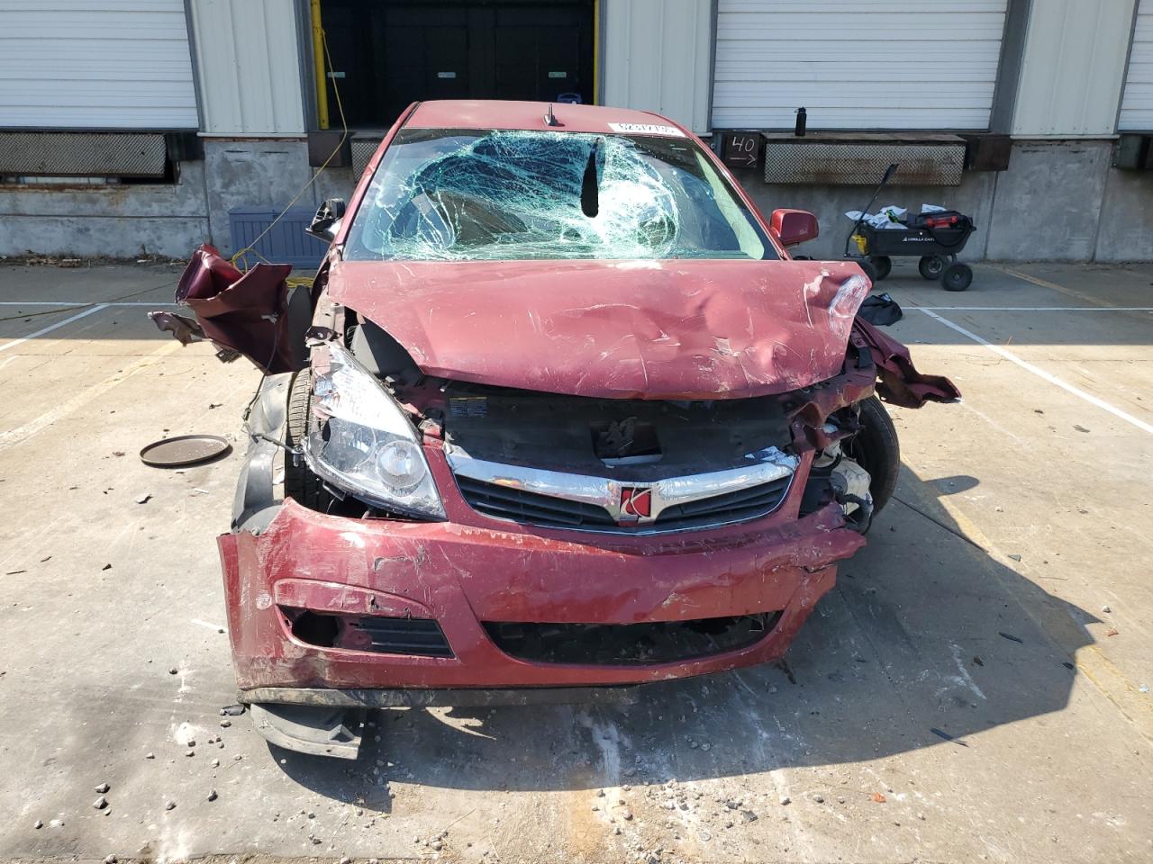 PoorThe 2008 SATURN AURA XE has sustained significant front-end damage, with the front of the vehicle severely impacted, including the front end, hood, lights and windshield. The vehicle's red exterior shows extensive damage. The interior exhibits wear and possible airbag deployment. The car is not drivable.