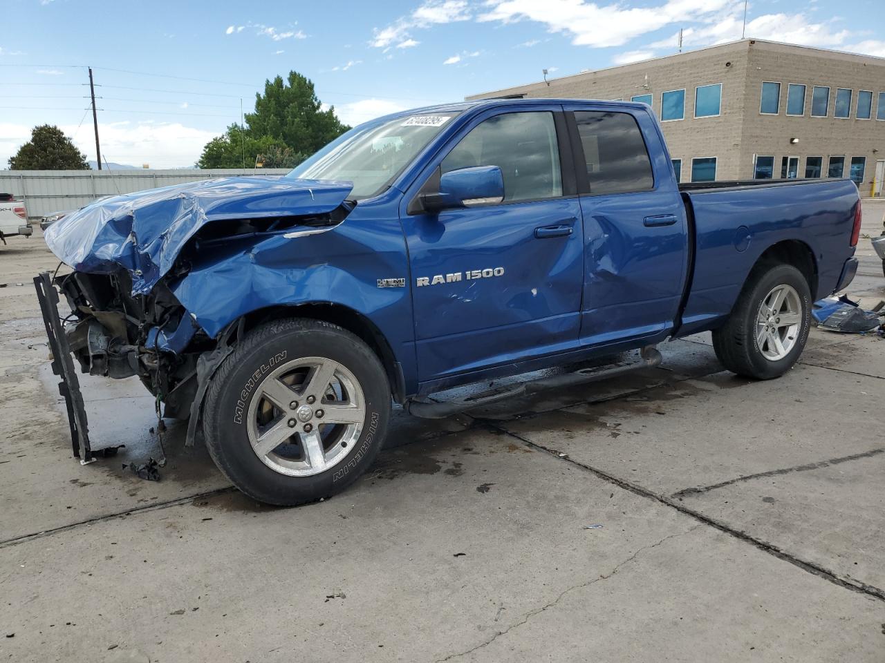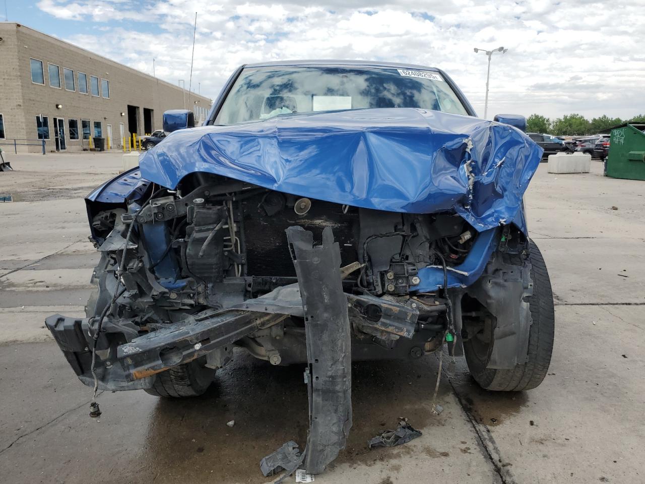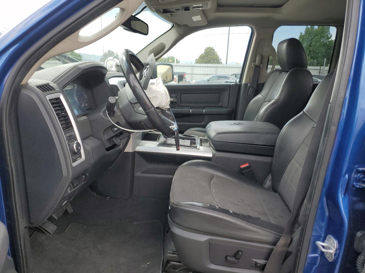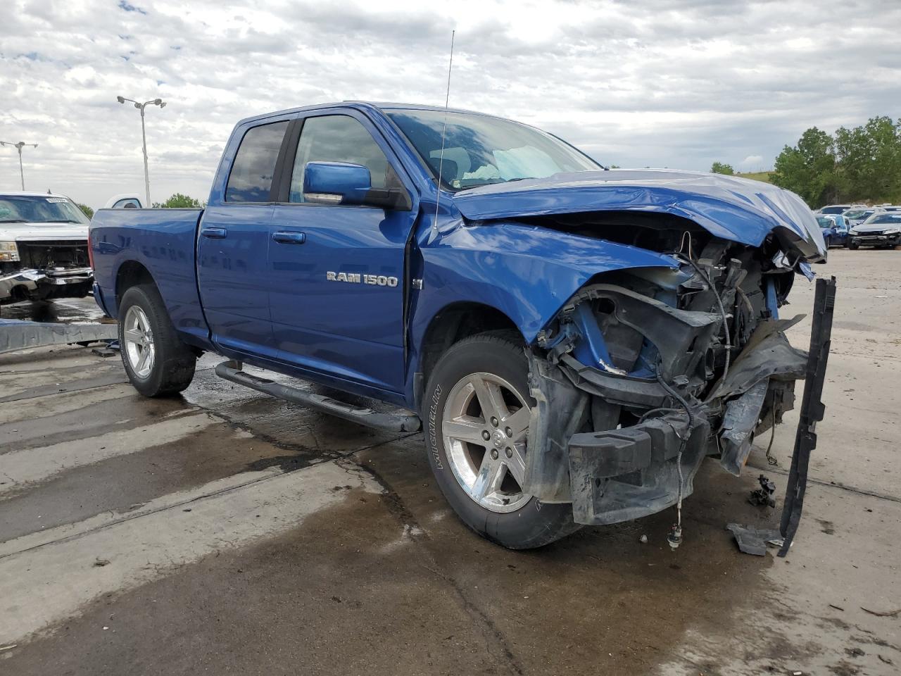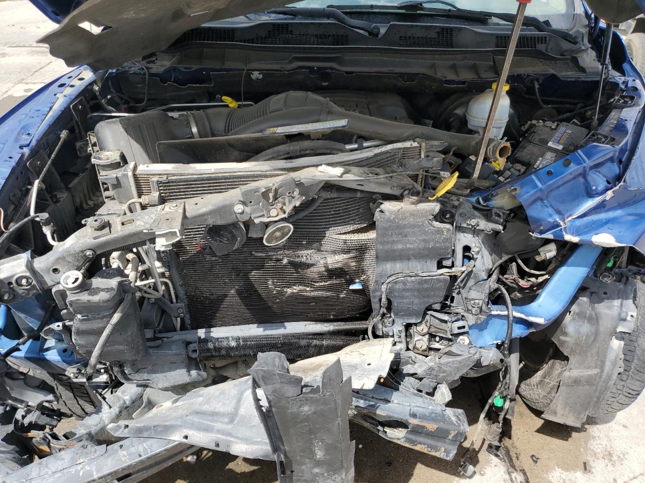 FairThis is a 2011 Dodge Ram 1500, showing significant damage from a front-end and side collision. The blue exterior exhibits major body damage, with the front severely crushed, impacting the hood, fenders, and bumper. The side also presents noticeable impact marks. Despite the exterior damage, the interior appears to be in relatively good condition. The airbags have been deployed, indicating a considerable impact during the collision. The wheels seem to be intact. The vehicle's overall state is fair, suggesting the need for substantial repairs.