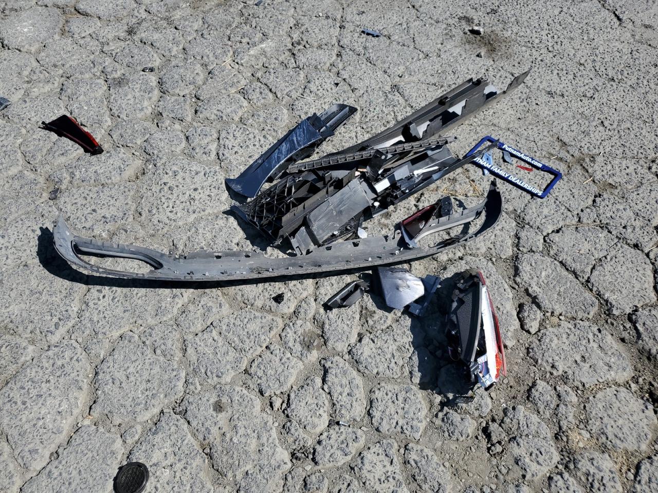 The car has sustained extensive body damage, with significant crumpling of body panels. The wheels and lights are damaged.
