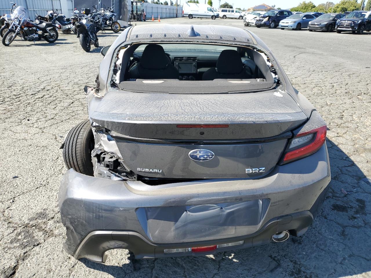 PoorThis is a SUBARU BRZ PREMIUM 2024 in gray. The car has sustained significant damage. The damage is concentrated on the body, with visible crumpling and deformation to multiple panels on both sides. The front end, including the hood, appears to have damage. The roof has sustained significant damage. The wheels are still attached, but the extent of their functionality is unknown. All the lights are damaged. The car starts. The interior shows some wear and tear. Airbags deployed.