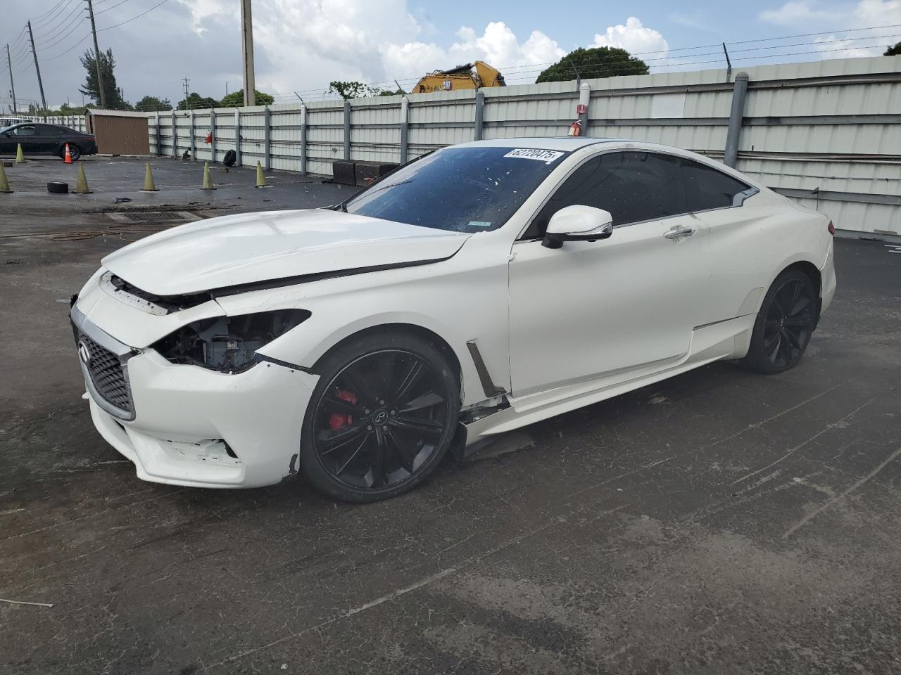 FairINFINITI Q60 RED SP 2018 in white, showing significant damage. The vehicle has suffered mechanical issues and requires partial repair, with extensive damage to the body. Interior shows signs of damage, particularly with deployed airbags. The overall state is poor, suggesting substantial repair needs.