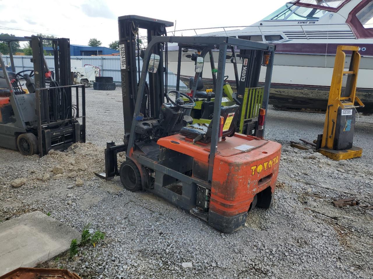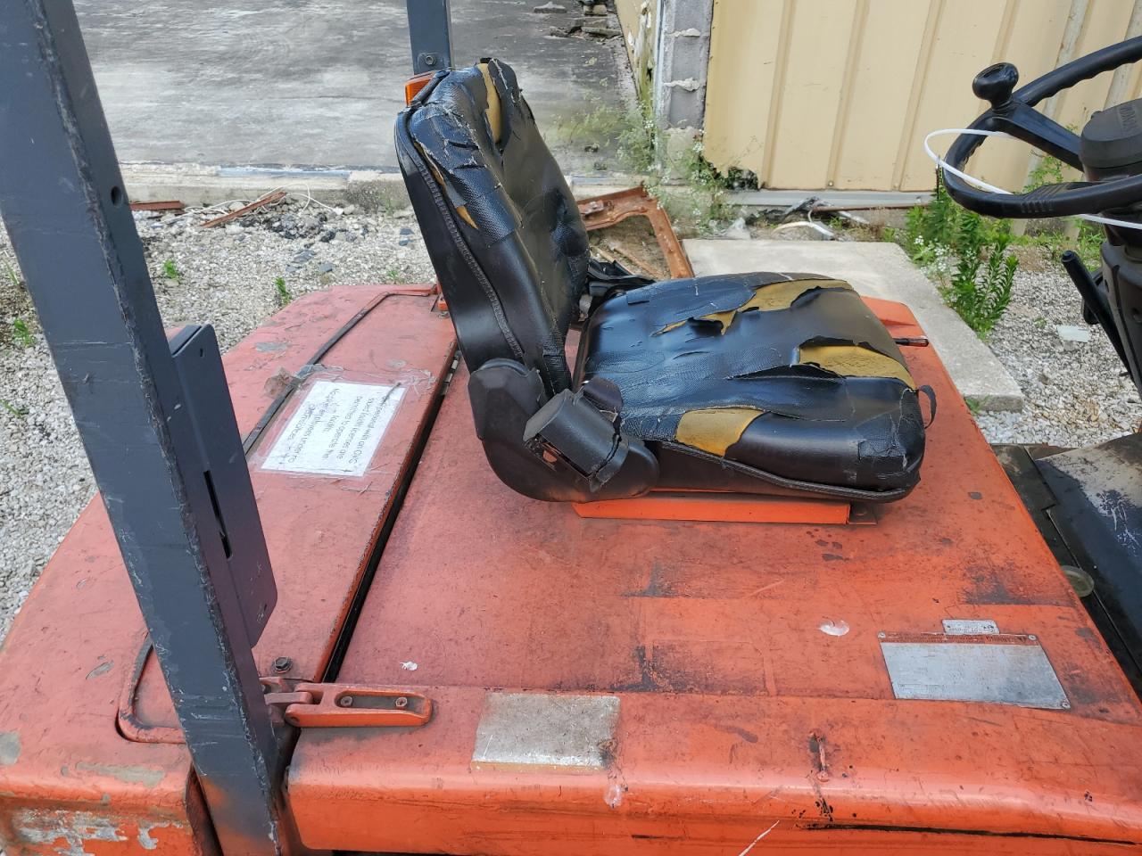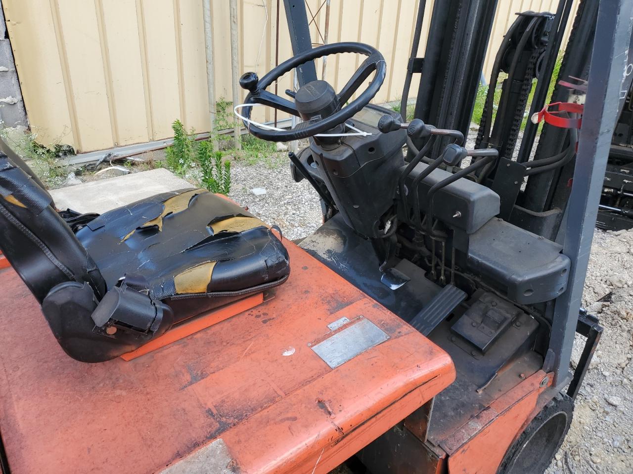 FairThe TOYOTA FORKLIFT 2000, presented in a vibrant orange, exhibits signs of wear and tear. The exterior displays moderate visible damage, indicative of its operational history. The interior shows similar signs, with noticeable damage to the seat. Despite these issues, the vehicle's wheels and other vital components appear to be intact, suggesting it may still be drivable, but requires repair.