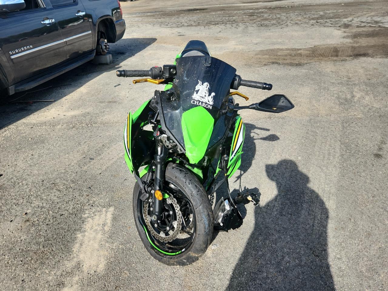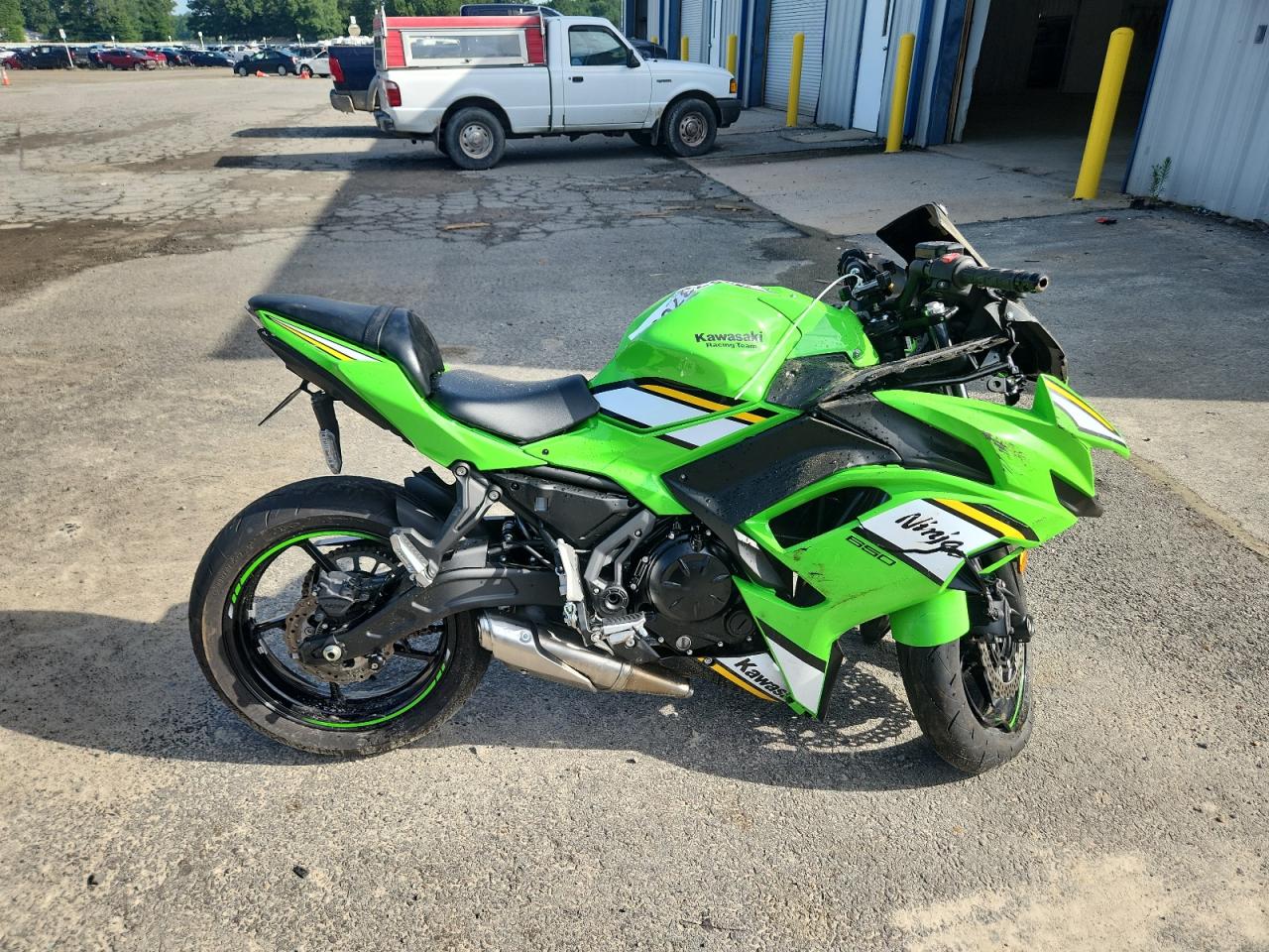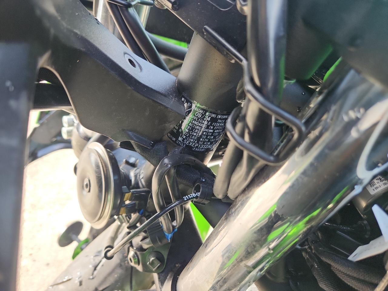 FairThe KAWASAKI EX650 P 2025, a green motorcycle, exhibits front-end damage. The primary damage is to the front, with no secondary damage reported. The motorcycle starts. The images show damage to the front of the motorcycle, and there are no indications of damage to the wheels, lights, or glasses. The interior condition appears to be good. The motorcycle requires repair.