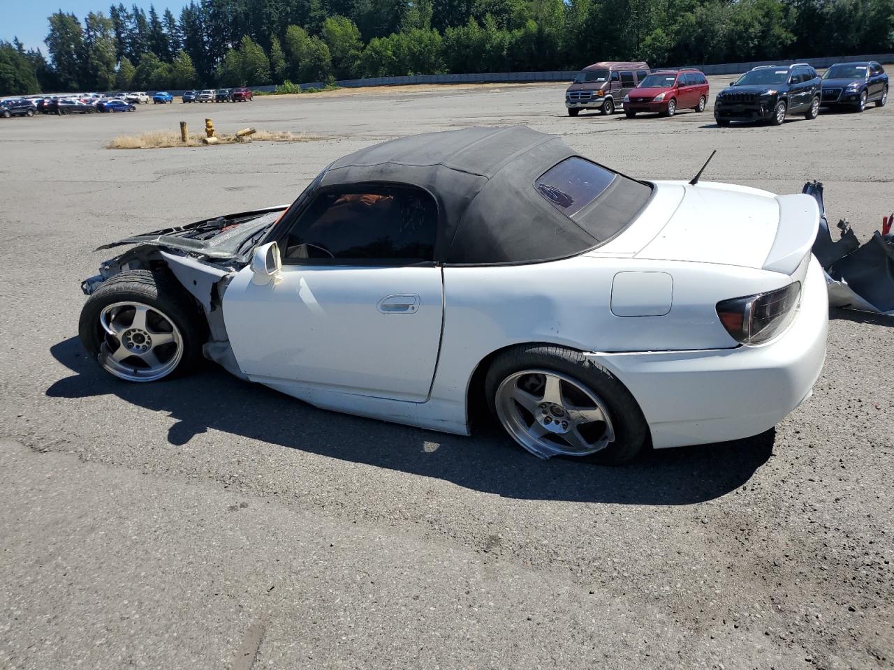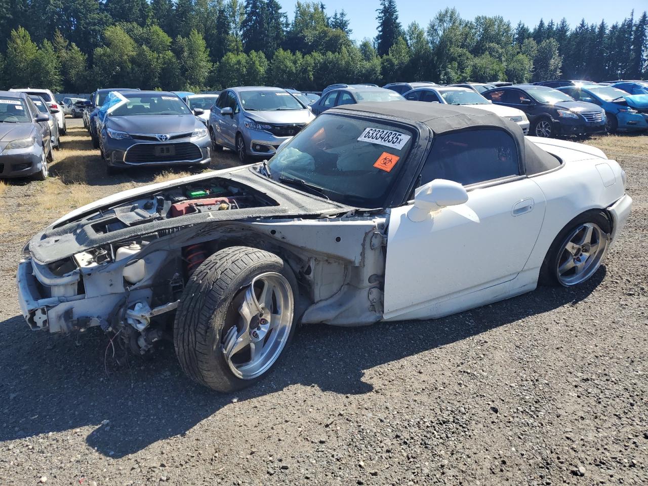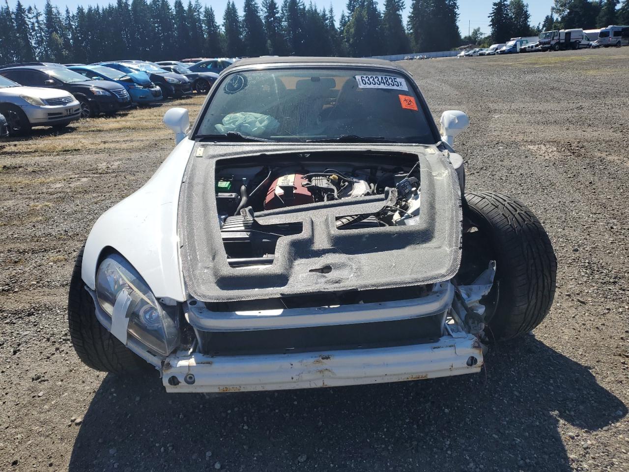 Fair2005 Honda S2000 with front and rear end damage. White exterior. Interior damage includes deployed airbags. The vehicle's front end is heavily damaged, including the hood, fenders, and bumper. The rear end also shows significant damage. Wheels appear to be intact. The interior has damage, especially to the dashboard and seats.