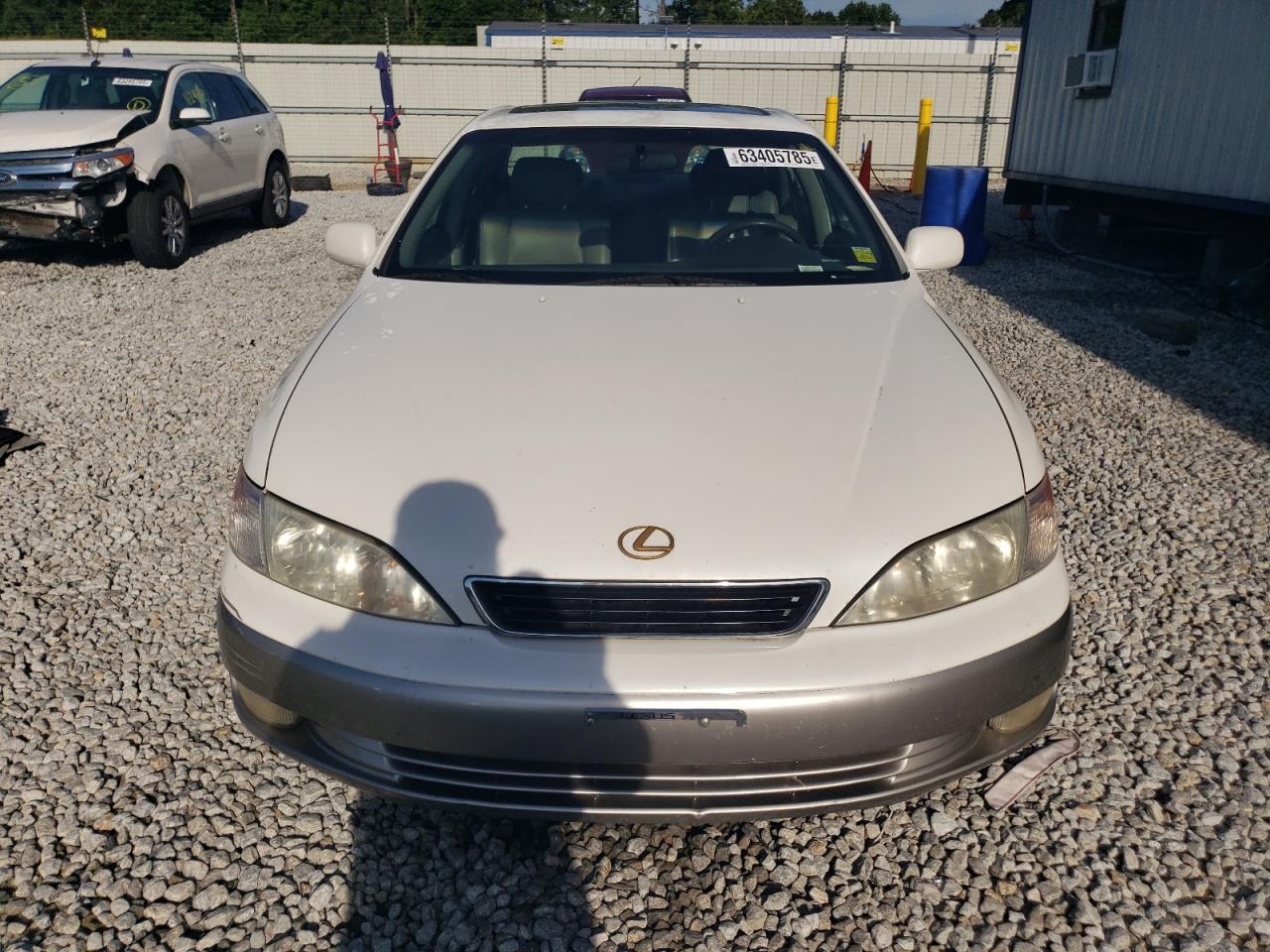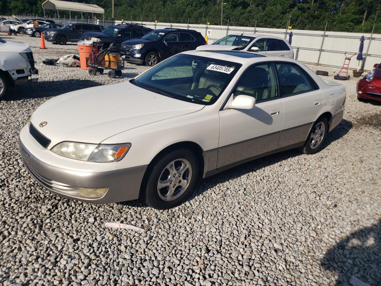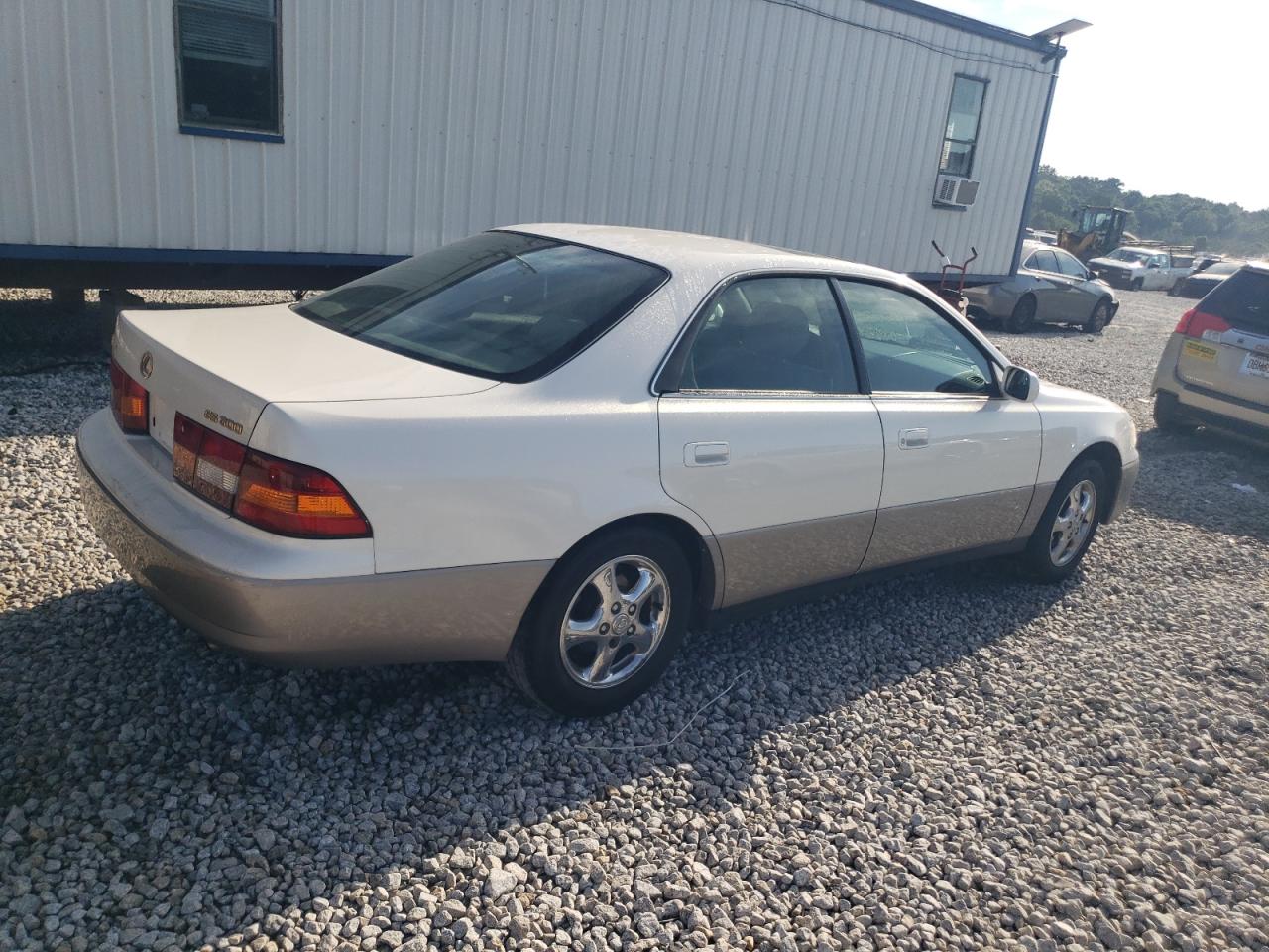 Fair1999 Lexus ES 300. This white sedan exhibits rear-end damage, classified as Body damage, indicating impact to body panels. It is a Run & Drive Verified vehicle. The interior shows wear and tear, but remains in a fair condition. The exterior condition reflects moderate damage, requiring some repairs to make it a good car. The car is drivable. The wheels appear intact, and the lights and glasses seem to be in good condition.
