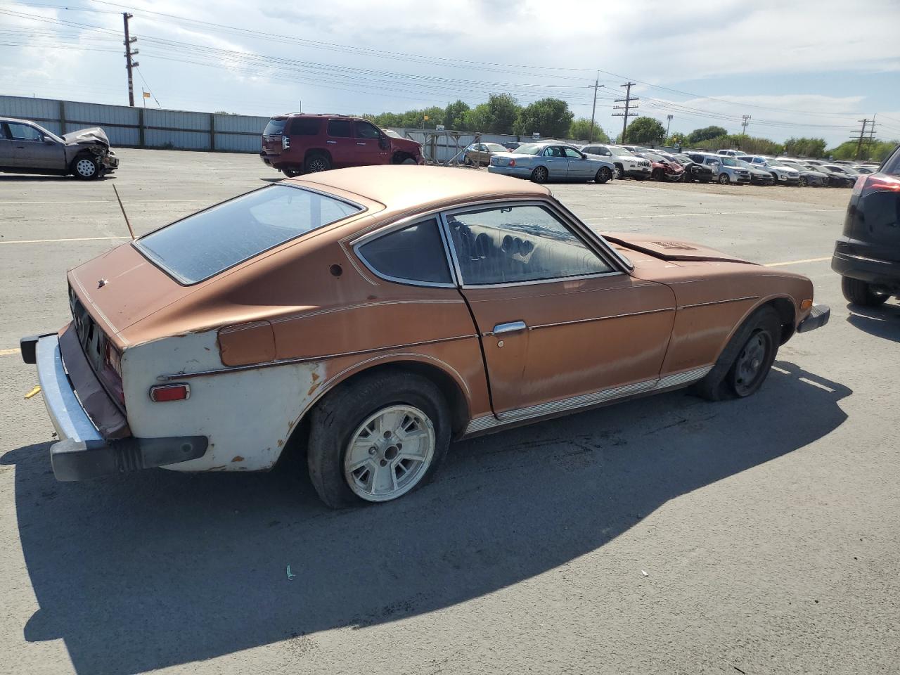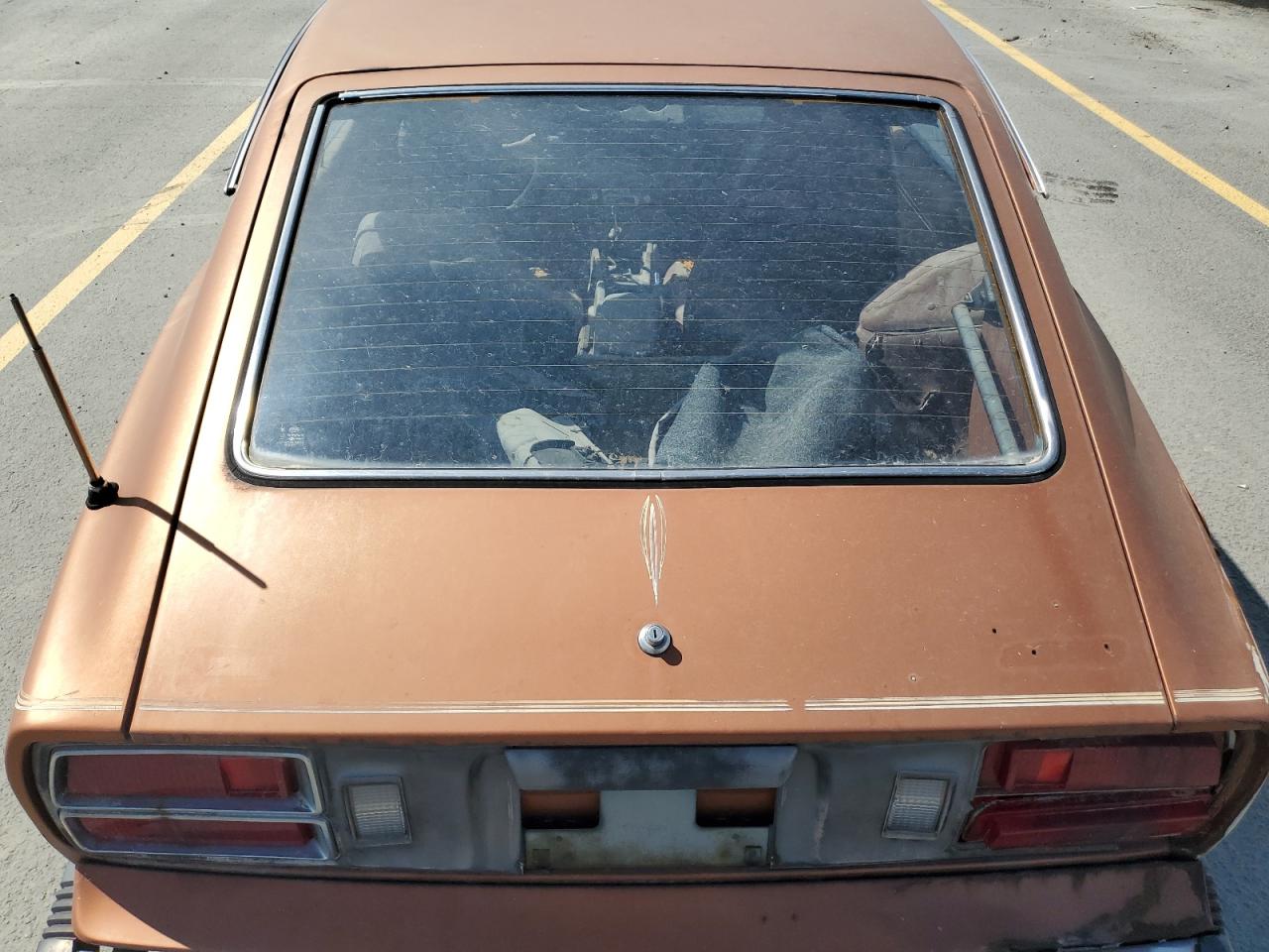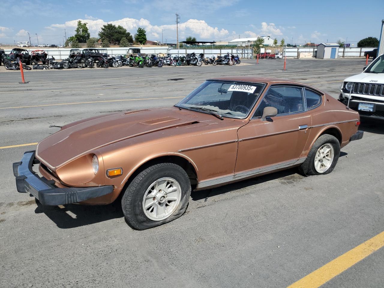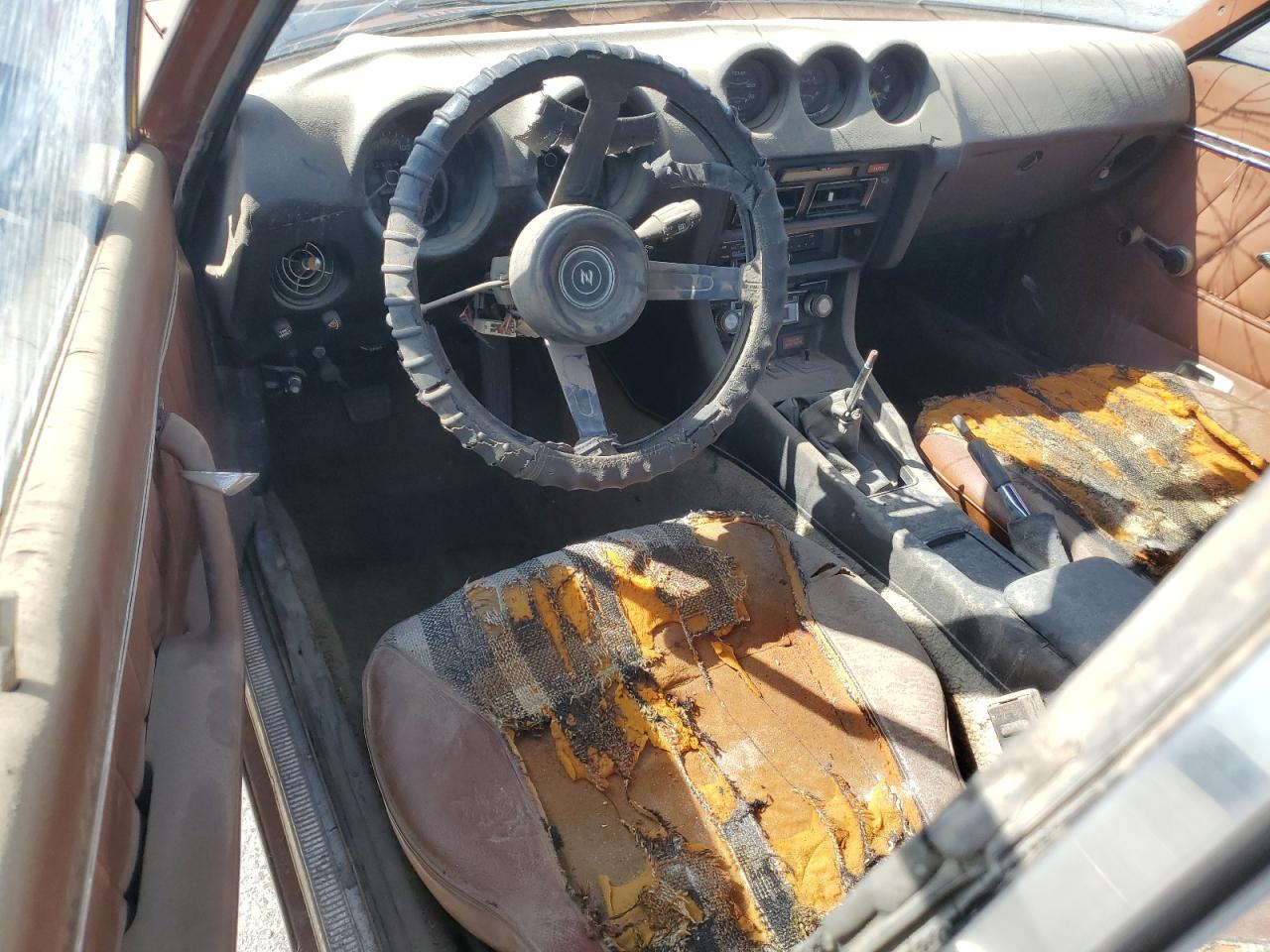 The 1977 Datsun 280Z appears in rough shape, with significant damage to the exterior and interior. The brown-colored coupe shows body damage, and the interior reflects considerable wear and tear. The tires are flat. Vehicle Damage Category: Body, as the primary damage is to the rear end. The car is in poor condition, and the visible damage includes significant body damage and wear and tear.
