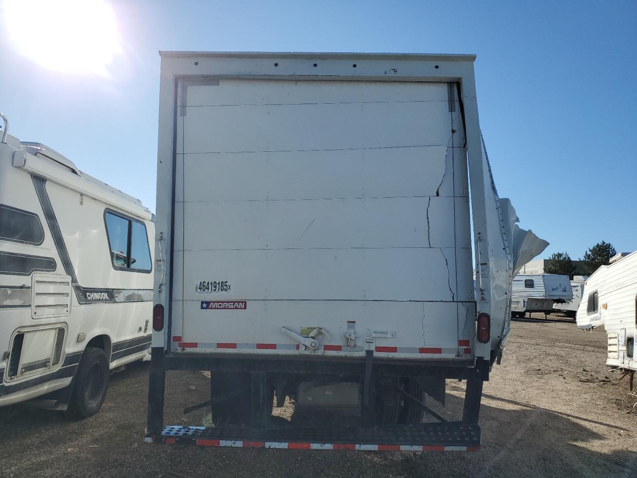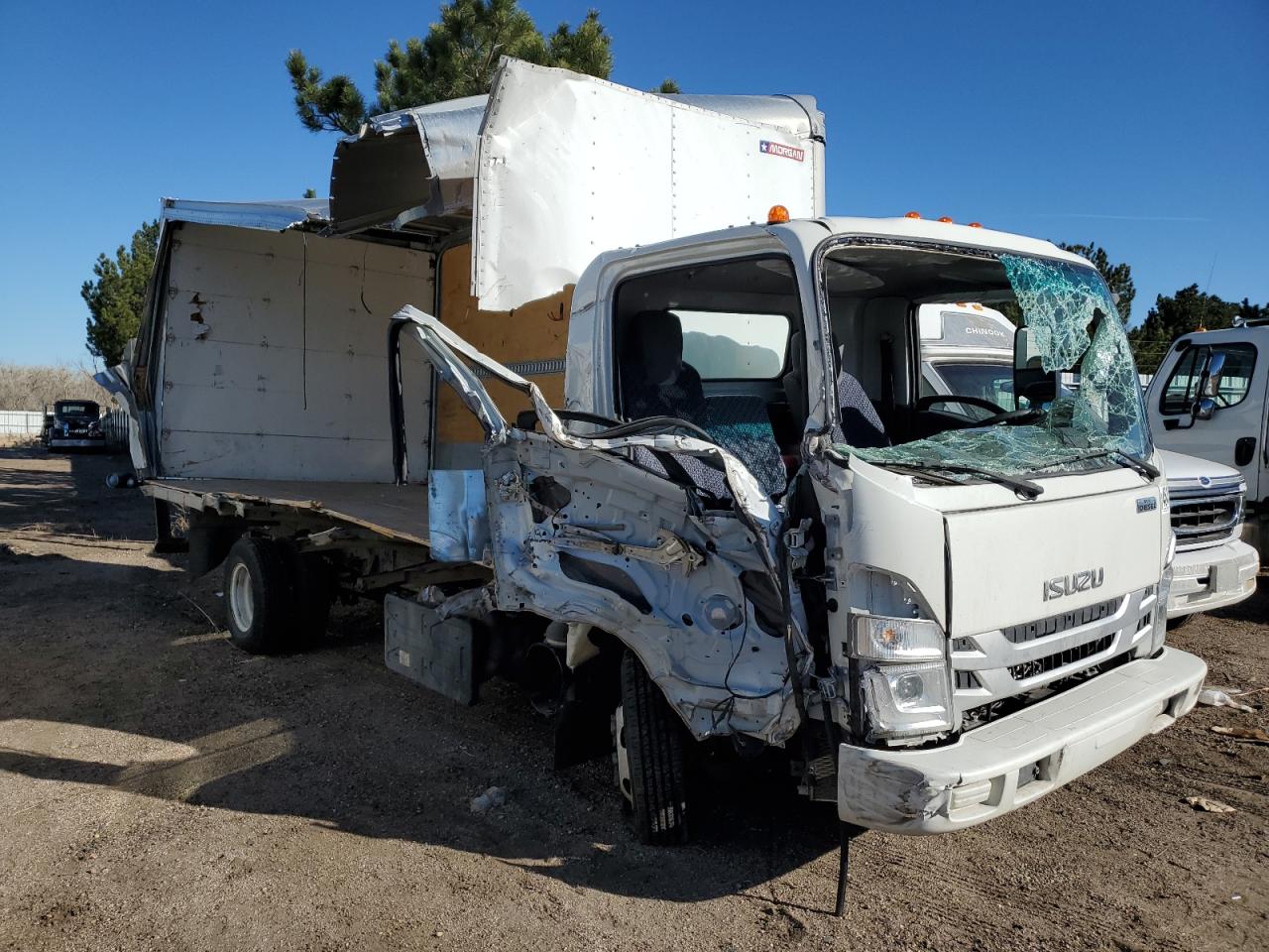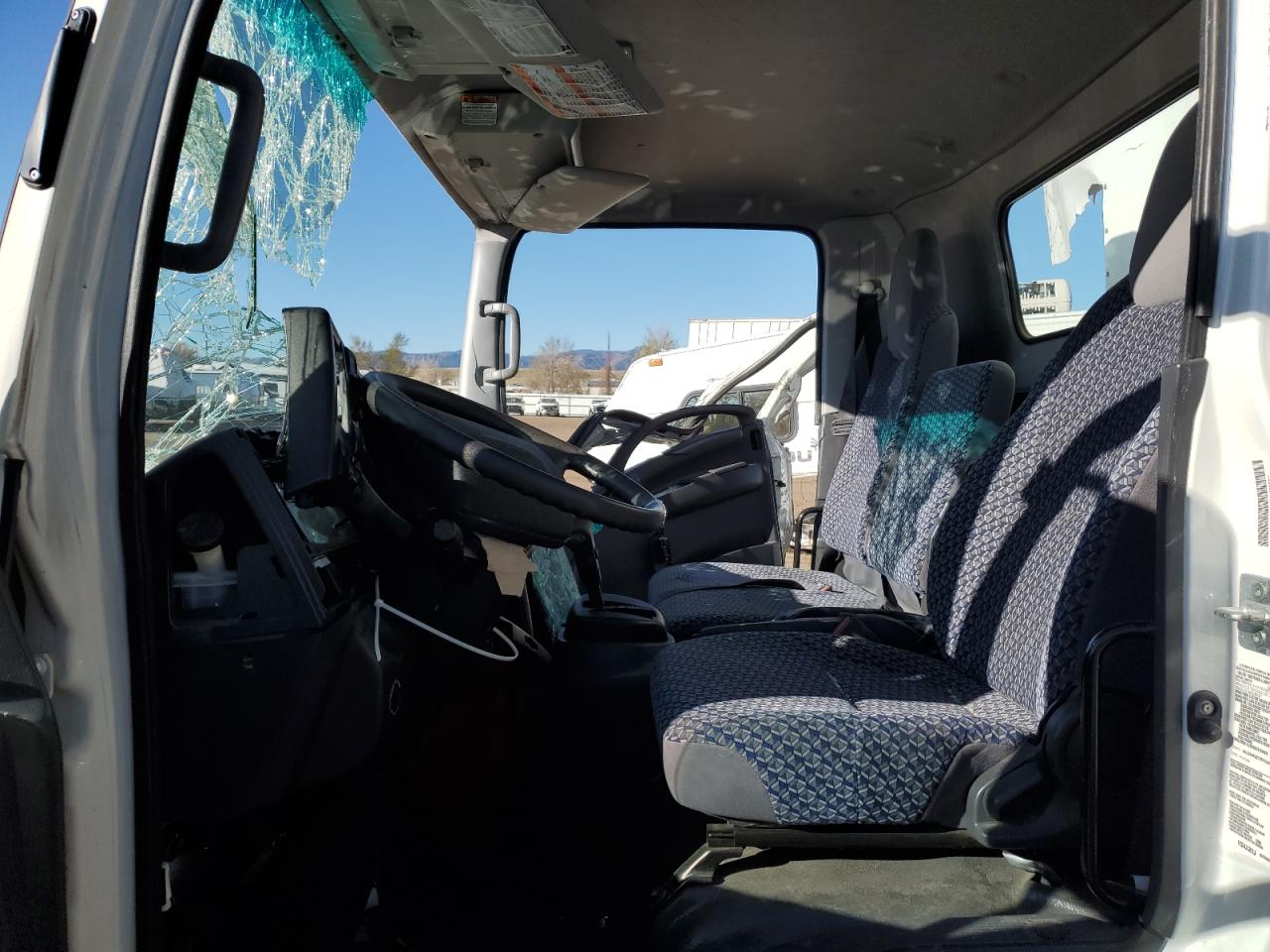 This ISUZU NPR HD truck has sustained severe damage. The exterior shows extensive damage to the body panels, with a shattered windshield. The interior also shows considerable damage. The vehicle is not drivable in its current state.
