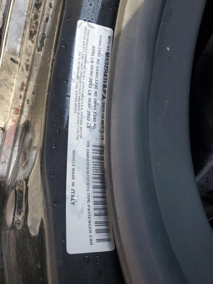 FairThe 2019 Maserati Quattroporte is a luxury sedan. This black car has suffered front-end damage. Its 'Run & Drive Verified' status indicates it can be driven. The primary damage is to the front end, with no secondary damage noted. The interior seems to have some damage, especially to the airbags.