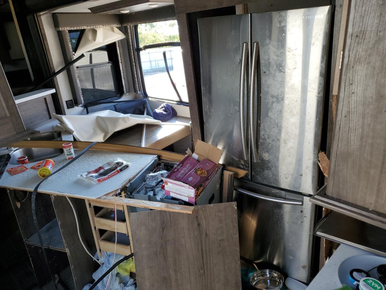The RV shows moderate visible damage. There's damage to the body panels, evident on the exterior, and some interior damage as well. The wheels appear to be in good condition. Interior damage is visible.