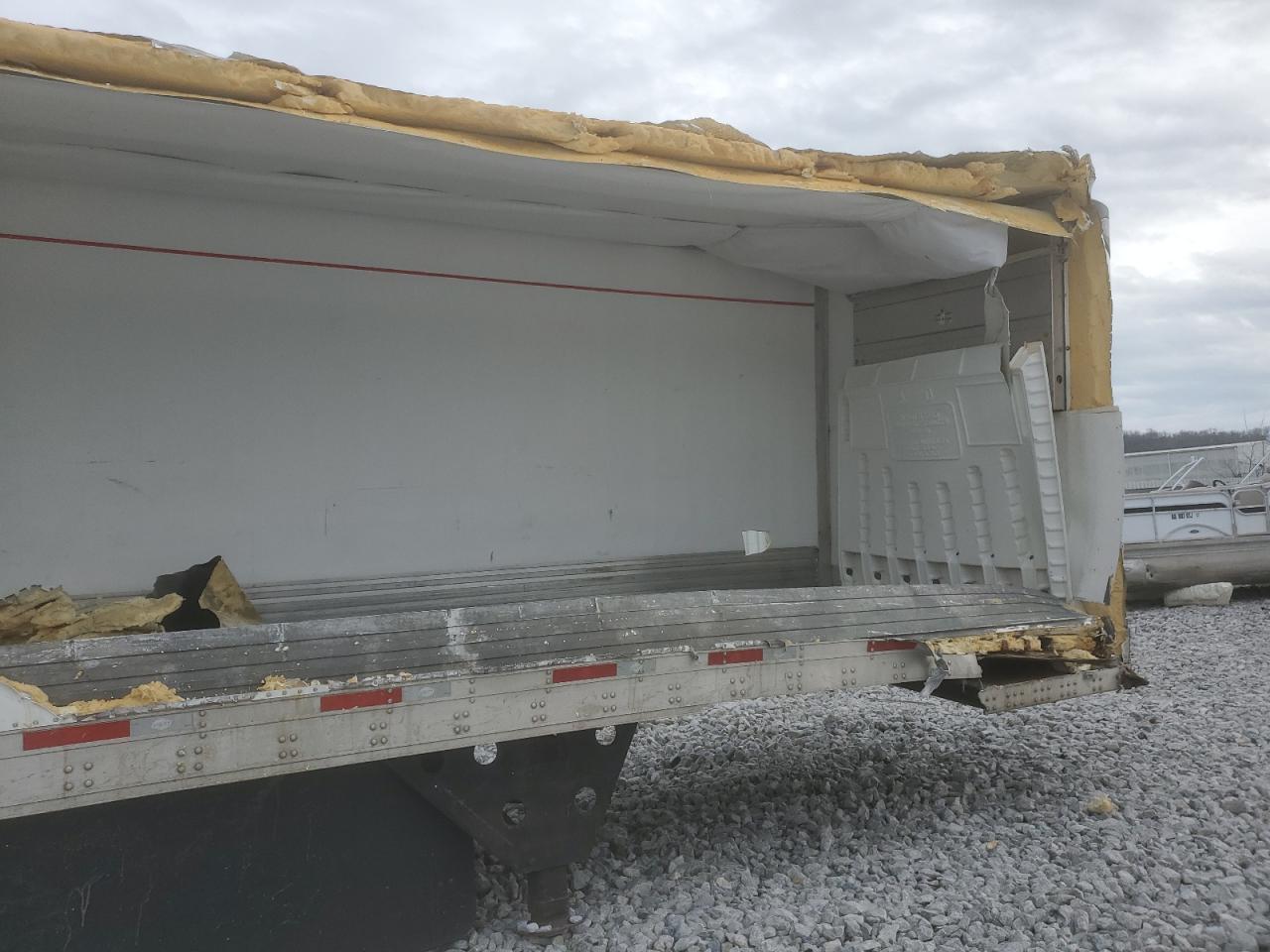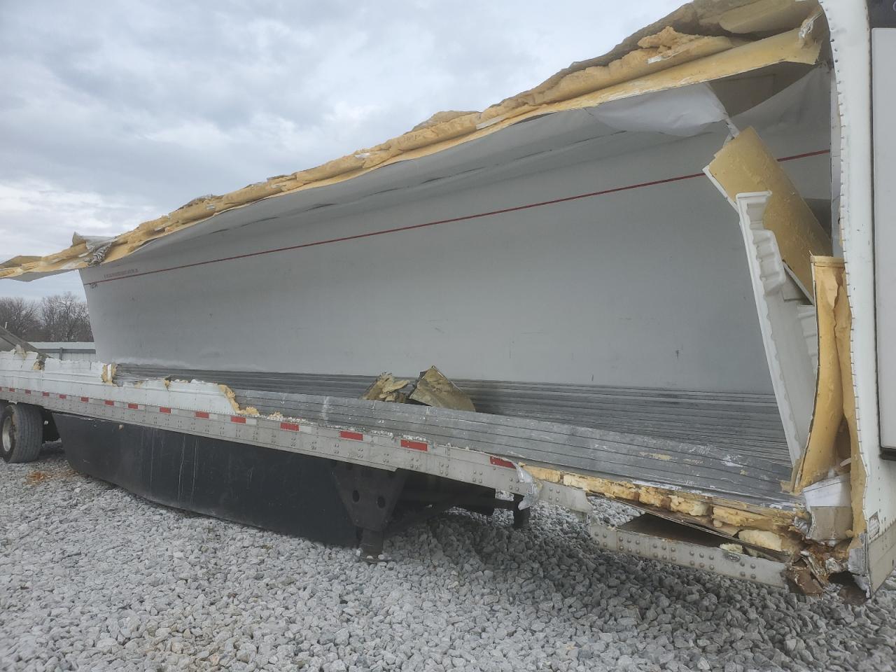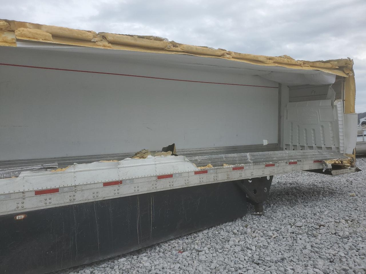Severe damage to the roof and body panels of the trailer. The roof is completely torn open in multiple sections, revealing the internal insulation. The side panels also show extensive damage, with large sections missing or compromised. This includes the reefer unit. The trailer is severely damaged and in need of significant repair.