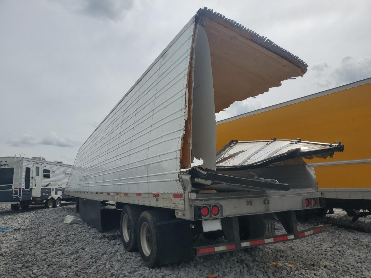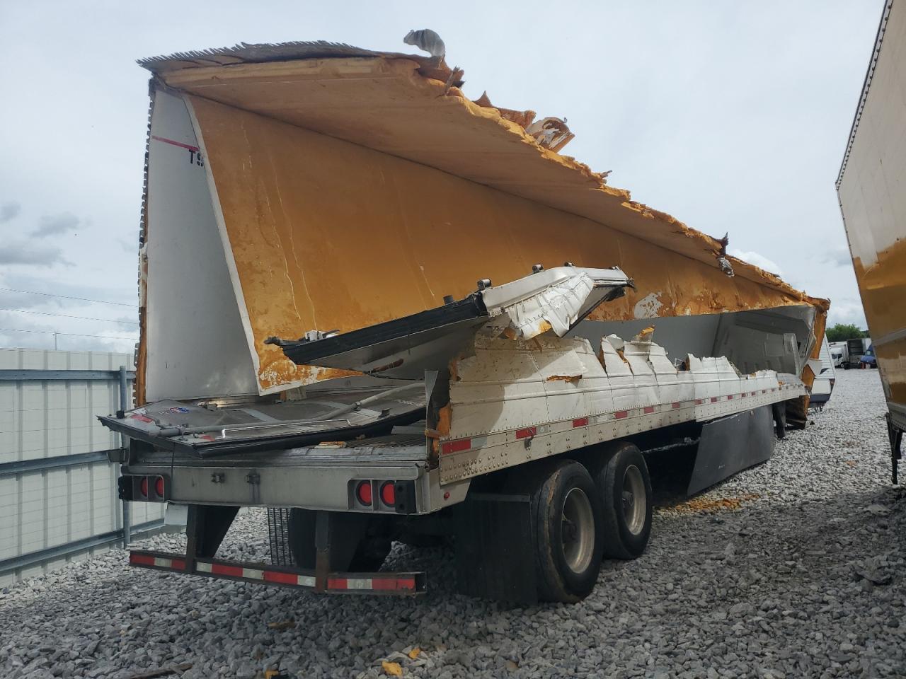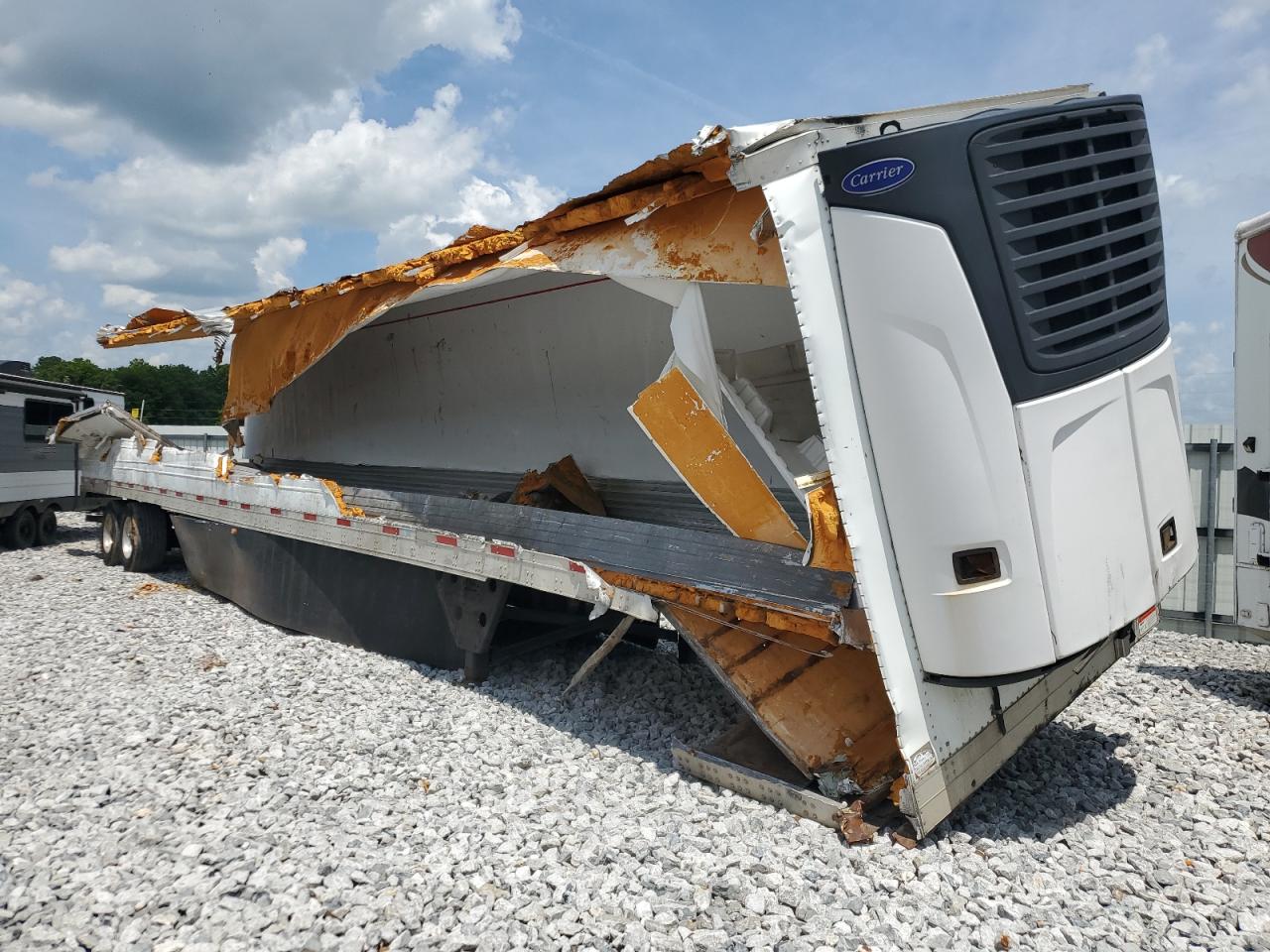 Severe damage to the roof and body panels of the trailer. The roof is completely torn open in multiple sections, revealing the internal insulation. The side panels also show extensive damage, with large sections missing or compromised. This includes the reefer unit. The trailer is severely damaged and in need of significant repair.