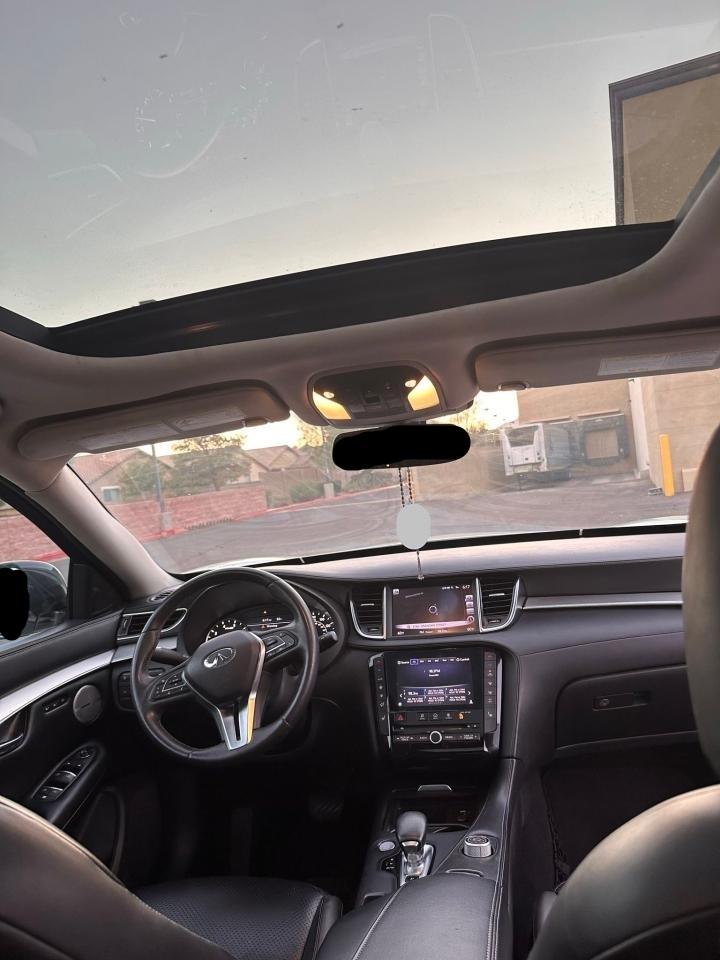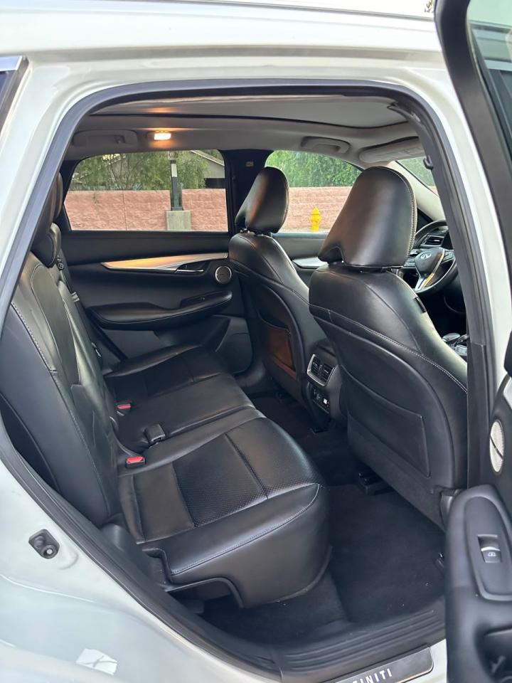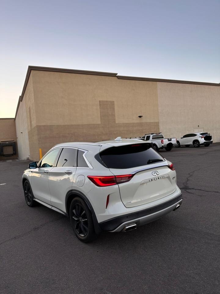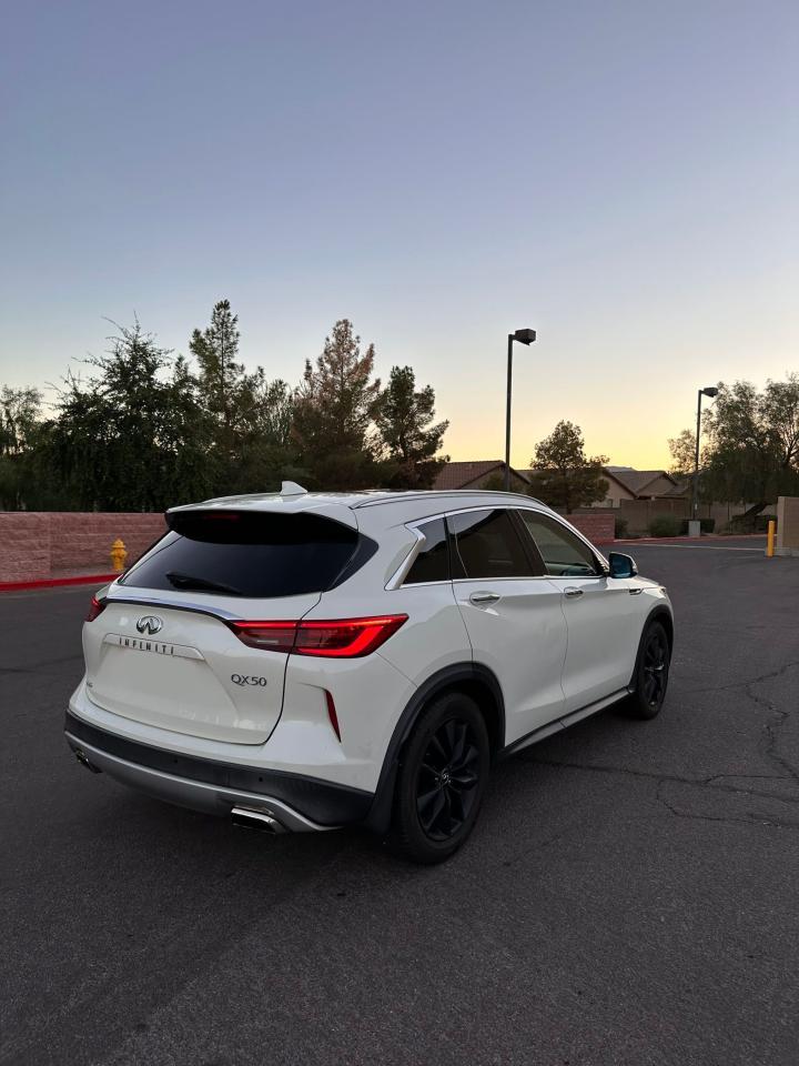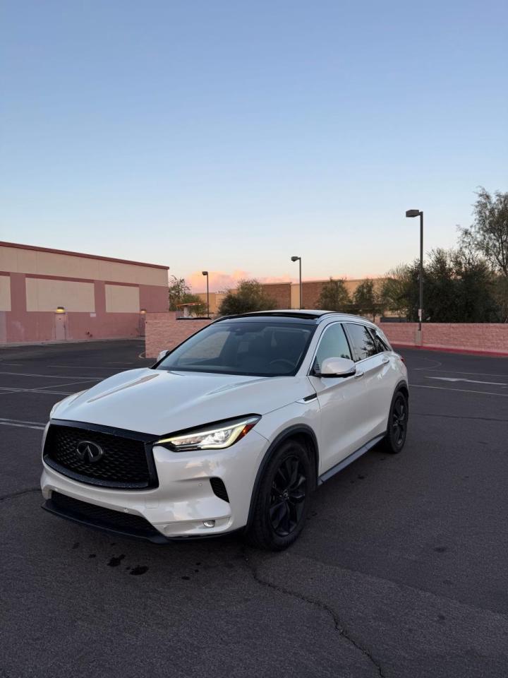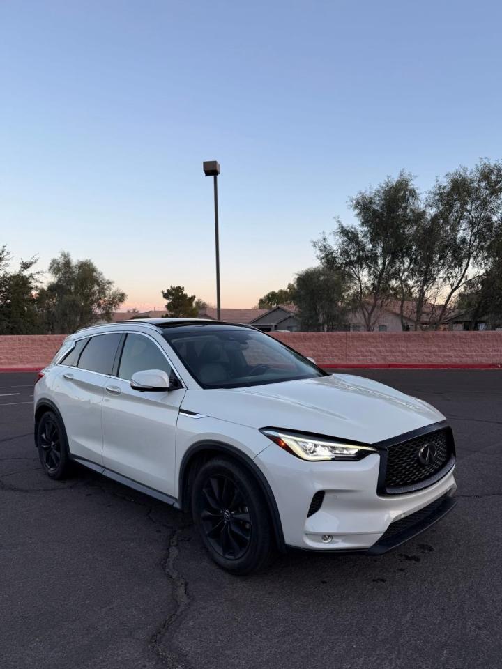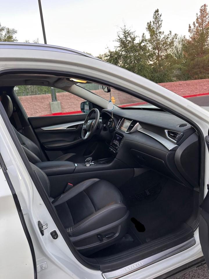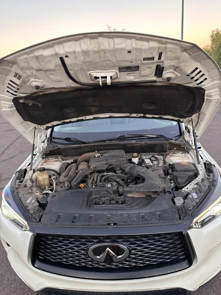Good2019 INFINITI QX50 ESSEN. The car is white, and its start code is Run & Drive Verified. It has a DAMAGE HISTORY and NORMAL WEAR. The interior presents a clean appearance, with minimal wear and tear. The vehicle has some cosmetic issues with a damage history.
