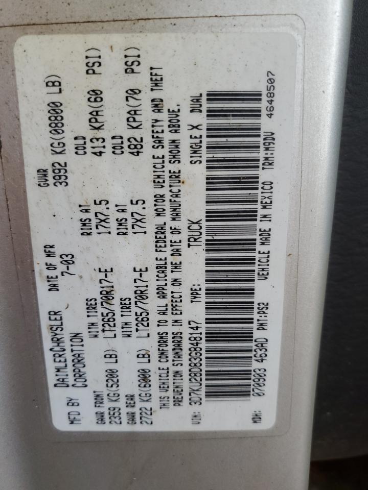 FairThis is a 2003 Dodge Ram 2500 with significant body damage and normal wear. The silver exterior exhibits rust on the body panels, particularly on the bed. The interior shows wear and tear, consistent with its age. The vehicle is noted as 'Run & Drive Verified'.
