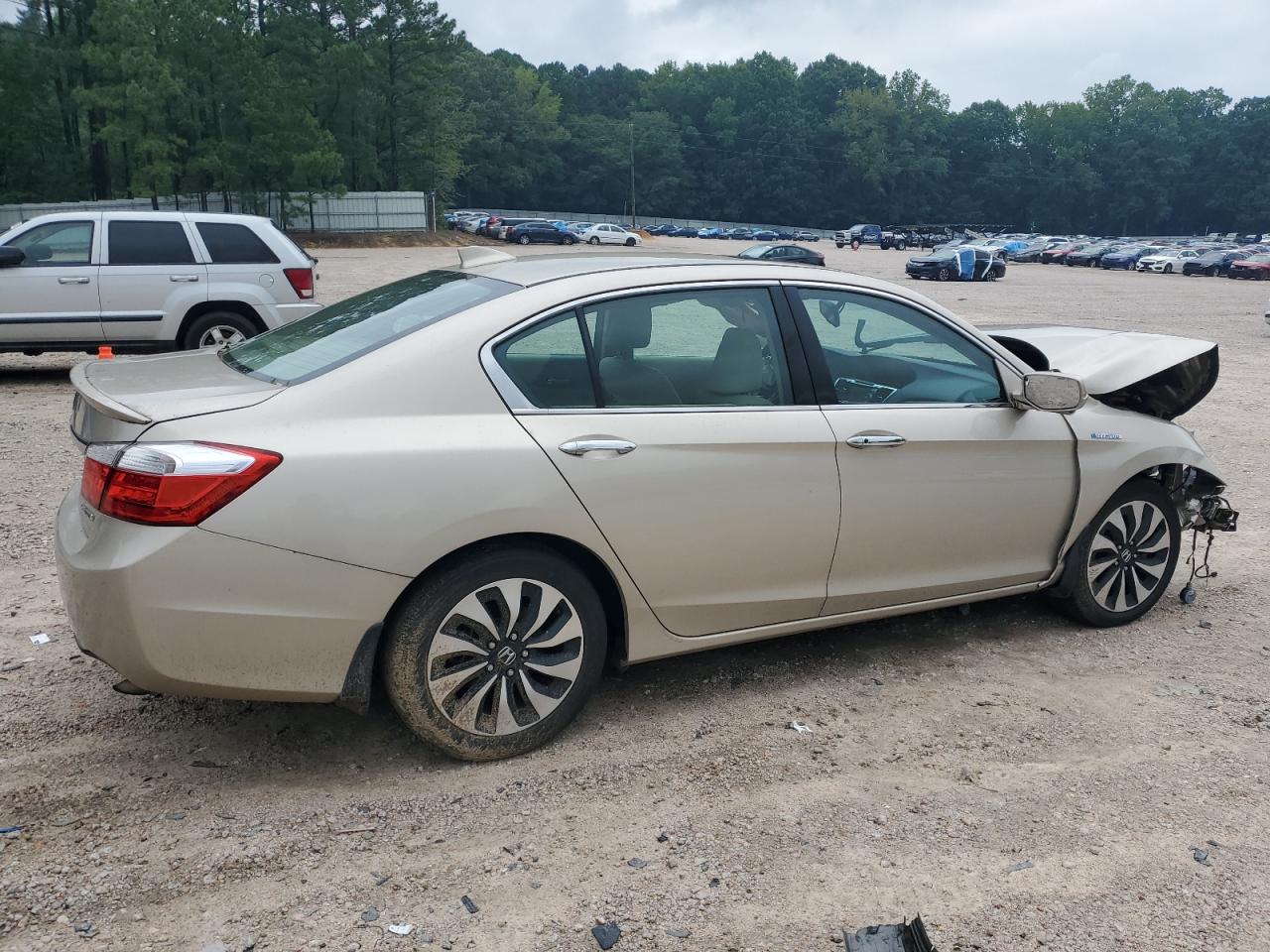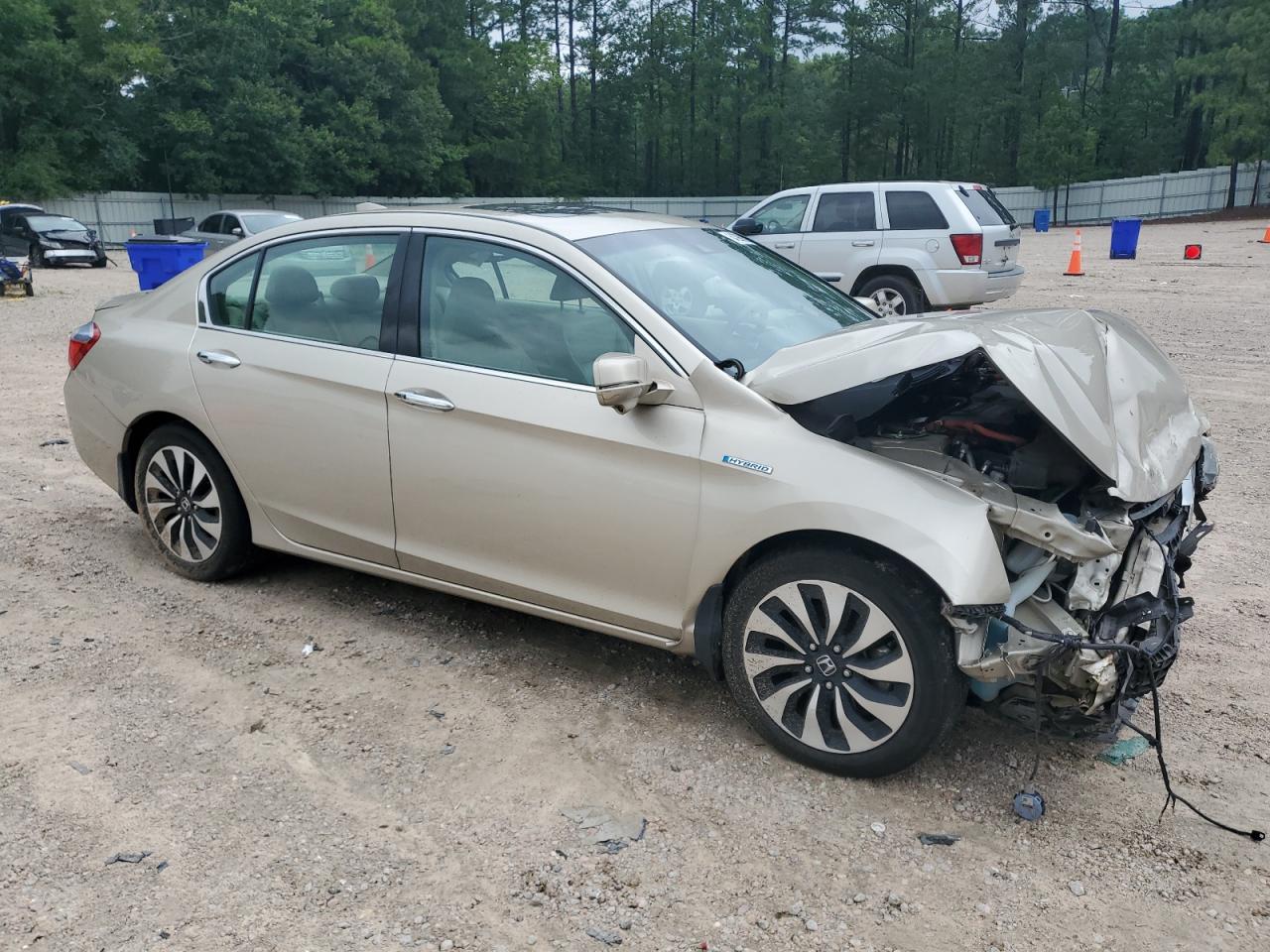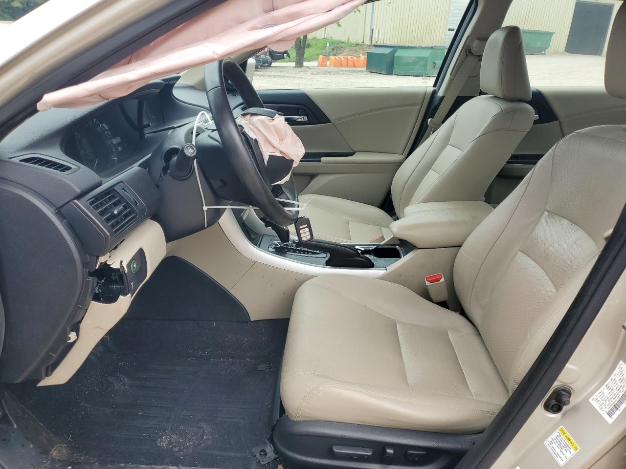 FairThis is a tan 2015 Honda Accord Hybrid that has sustained significant front-end damage. The vehicle has visible damage to the front fascia, hood, and potentially the frame. Both the exterior and interior conditions are assessed as 'Fair', indicating moderate damage throughout. The overall state of the vehicle is rated as 'Poor' due to the extensive damage. The airbags have deployed, and the interior shows signs of impact and damage. This car likely requires considerable repair and is potentially not drivable in its current condition. The wheels appear to be intact. The lights are damaged. The glasses appears intact.