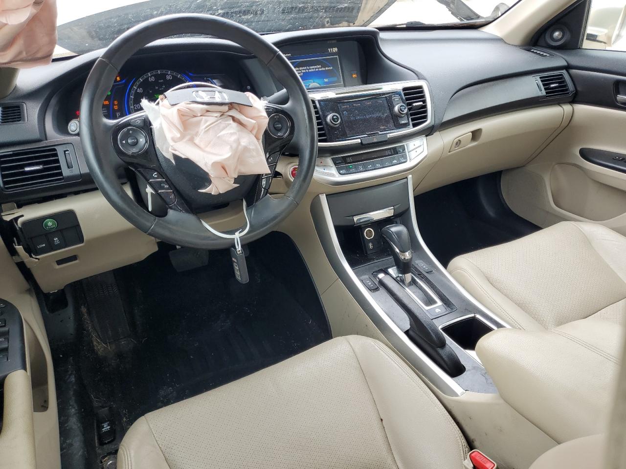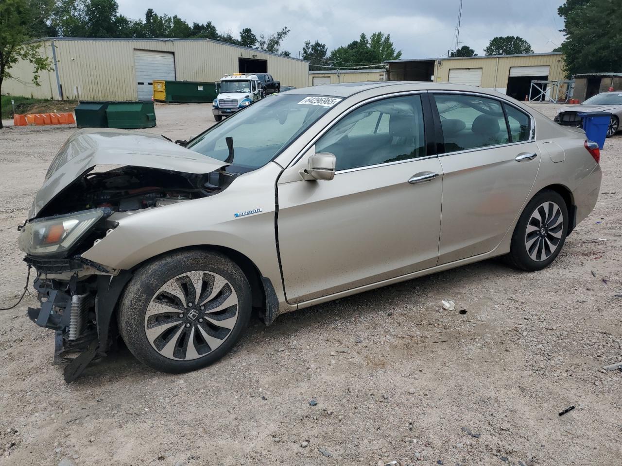 The Honda Accord Hybrid has suffered significant front-end damage, with visible impact on the front bumper, hood, and potentially frame. Interior damage includes deployed airbags and signs of impact. The car presents a fair condition overall but is not drivable.