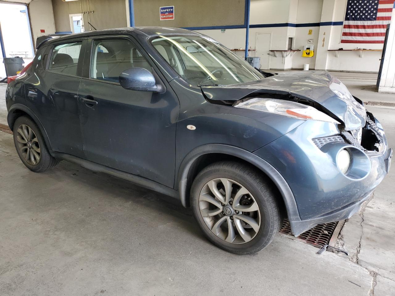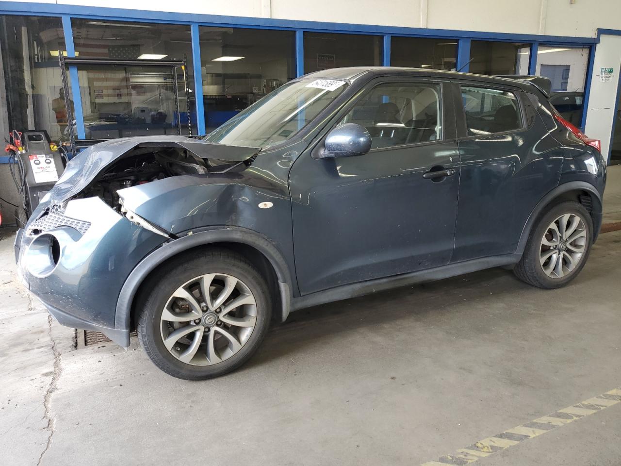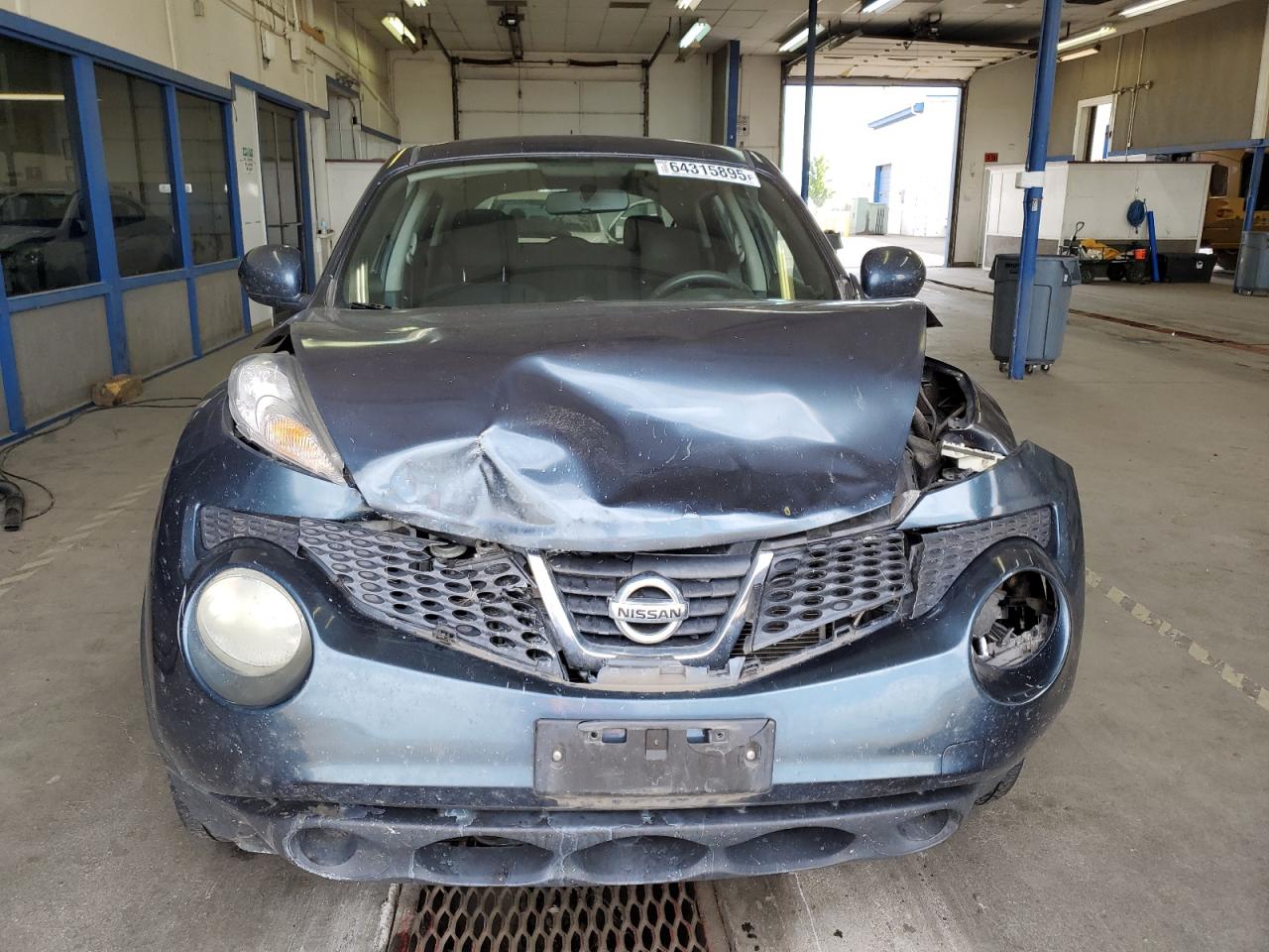 FairThe 2011 Nissan Juke S, blue in color, displays significant front-end damage, impacting its overall condition. The vehicle's exterior shows substantial damage, including deformation of body panels, especially at the front. Interior reveals airbag deployment and visible damage. The car is verified as run and drive.
