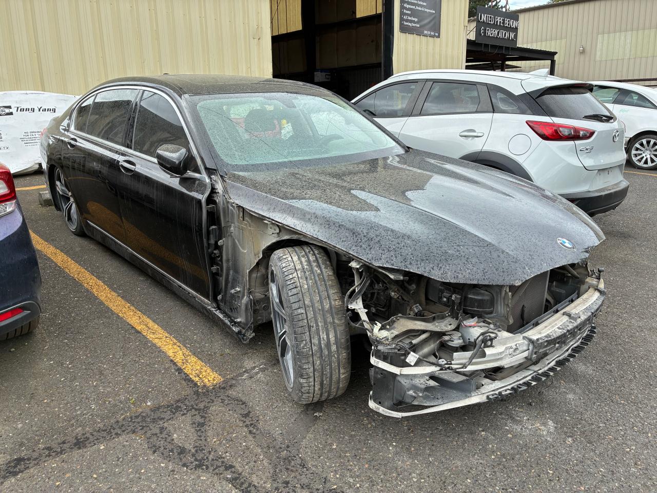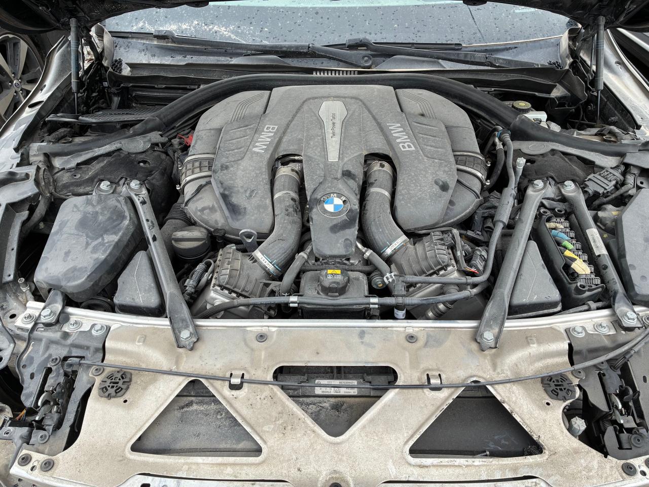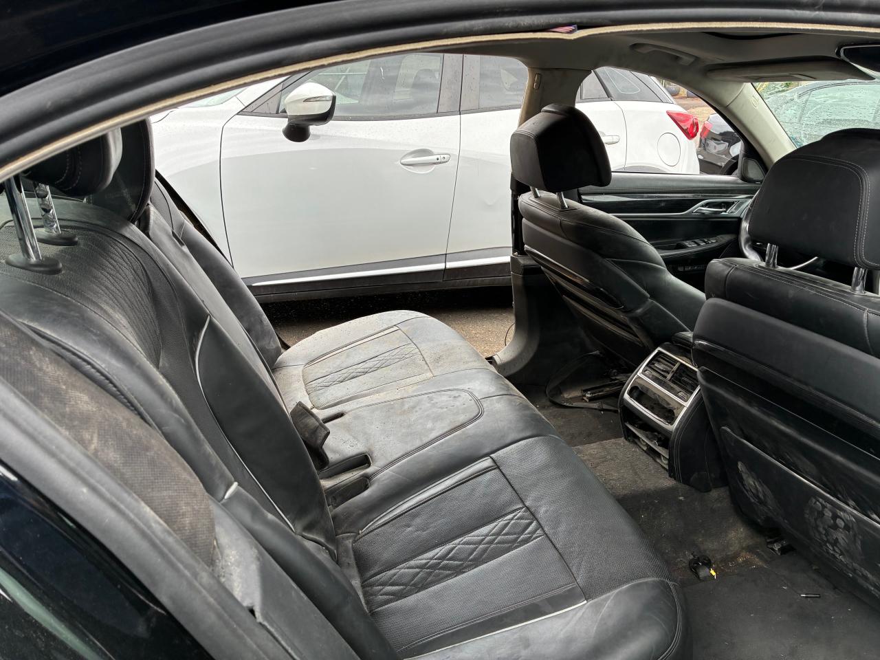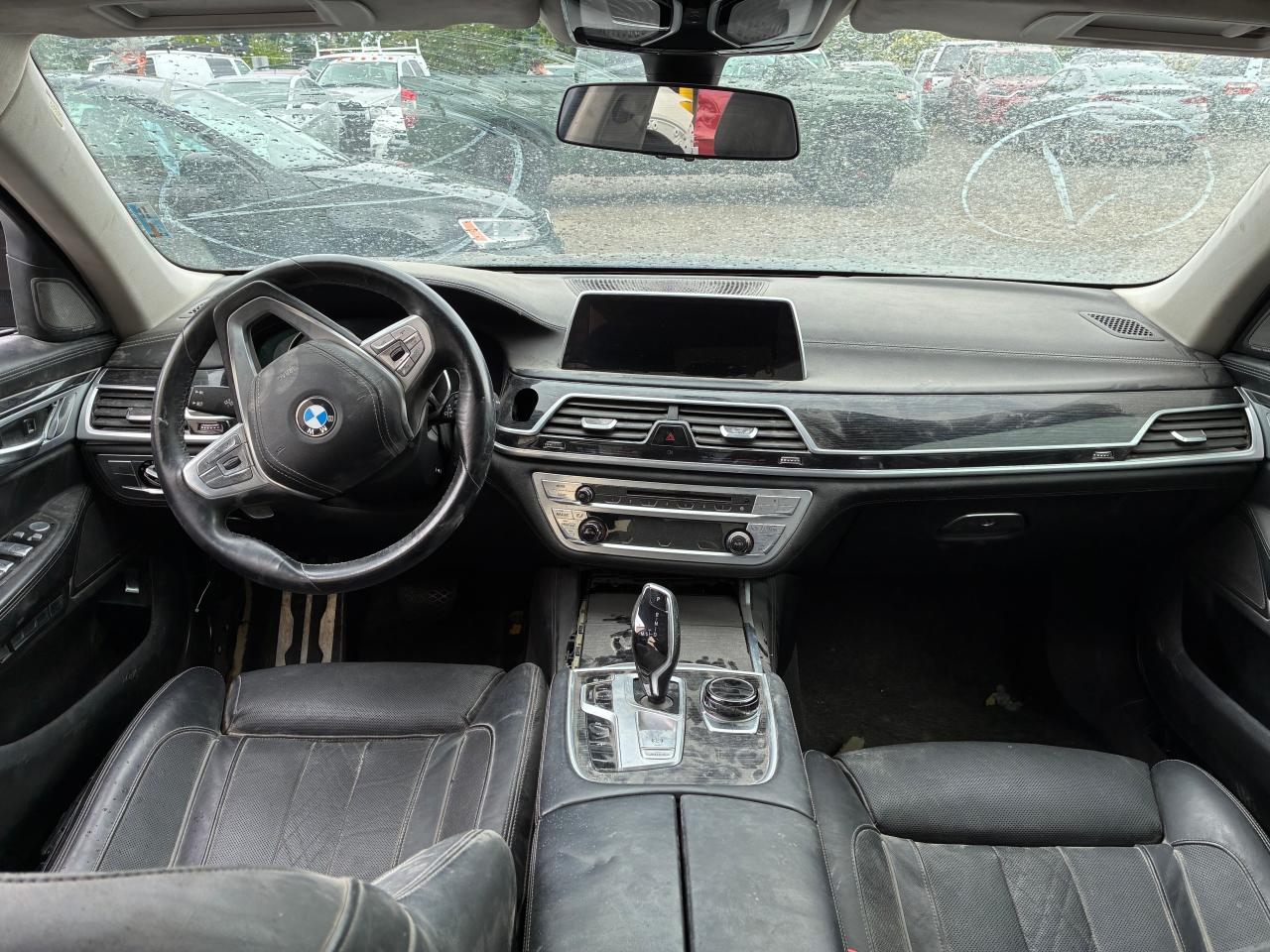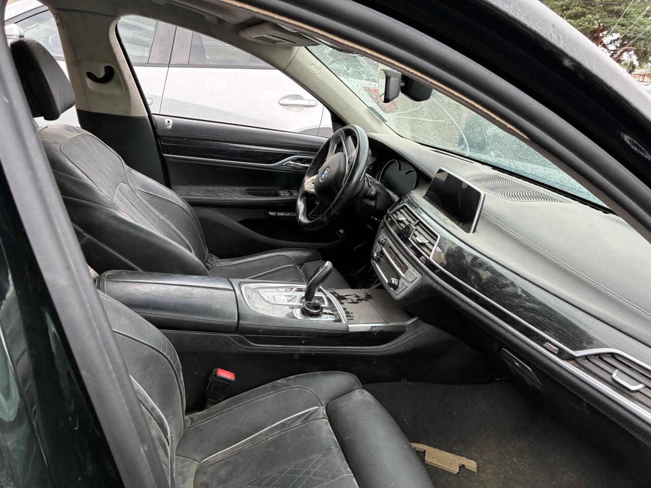 PoorThis is a damaged 2017 BMW 750i, black in color. The vehicle has sustained significant damage, with a focus on body and frame damage. The front end is extensively damaged, including the bumper, front panels, and likely the frame. The doors are open, suggesting the car might not be drivable. The interior shows signs of wear and tear. The wheels are damaged. The lights and glasses seem broken or missing.