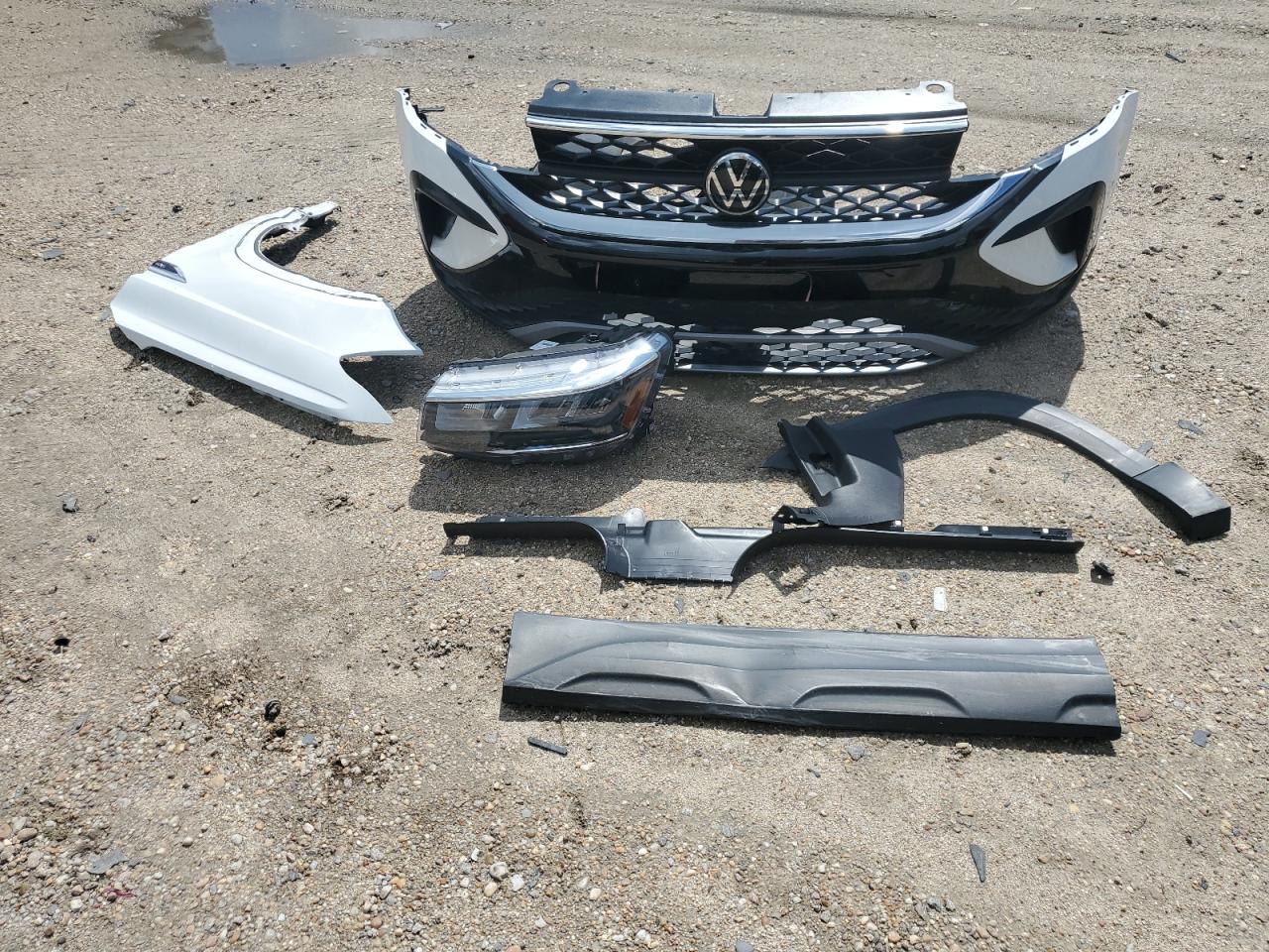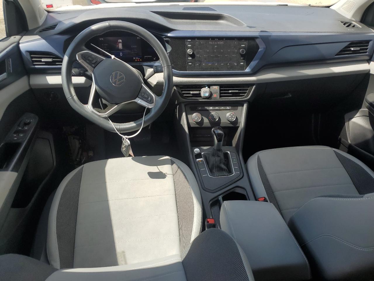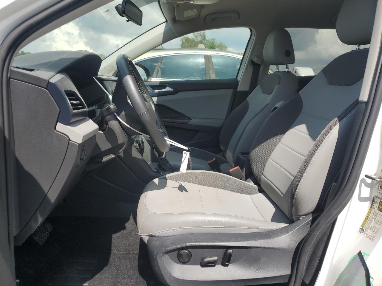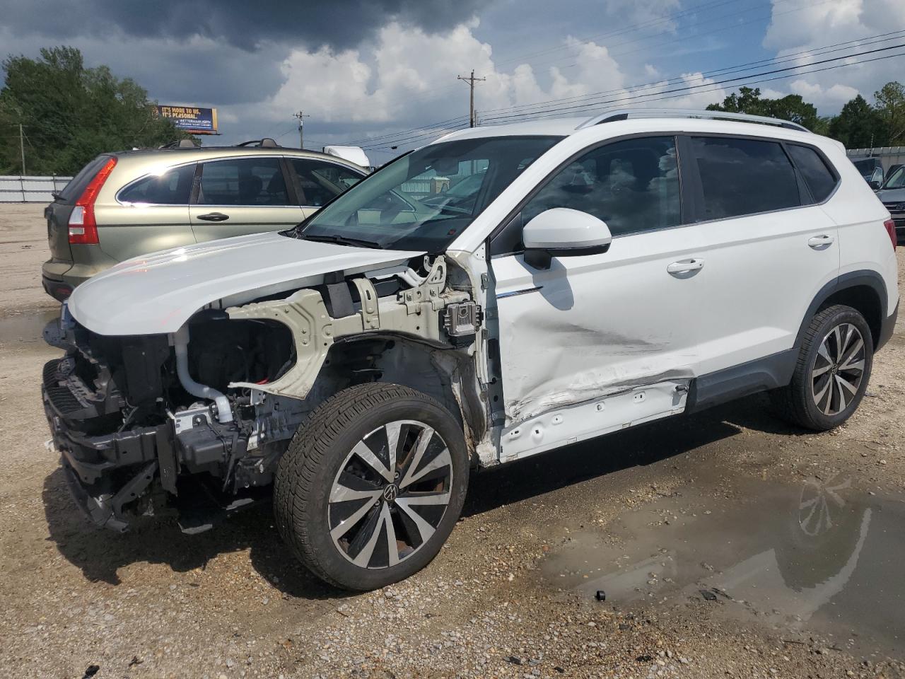 FairThis is a white 2022 Volkswagen Taos SE that has sustained significant damage. The primary damage is to the front end, with secondary damage to the side. The vehicle's front end exhibits extensive damage, including a collapsed front bumper and compromised front components. The side panels show visible signs of impact. The wheels appear to be intact, and the vehicle's glass components seem undamaged. The interior condition is good with moderate wear and tear consistent with its age. The car is listed with a Run & Drive Verified status. The airbag status is not visible. The vehicle is drivable.