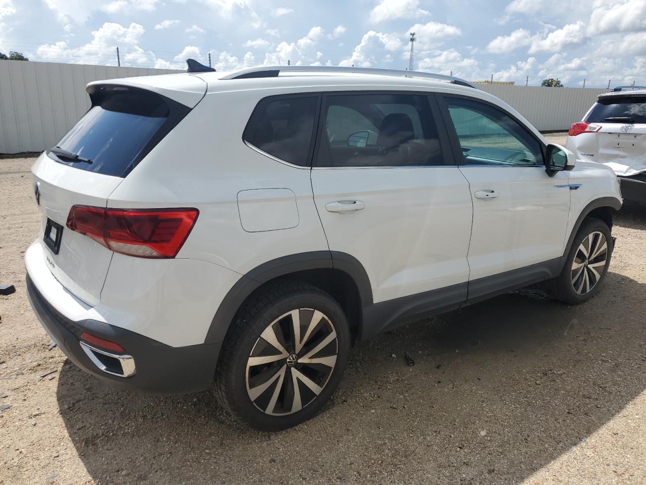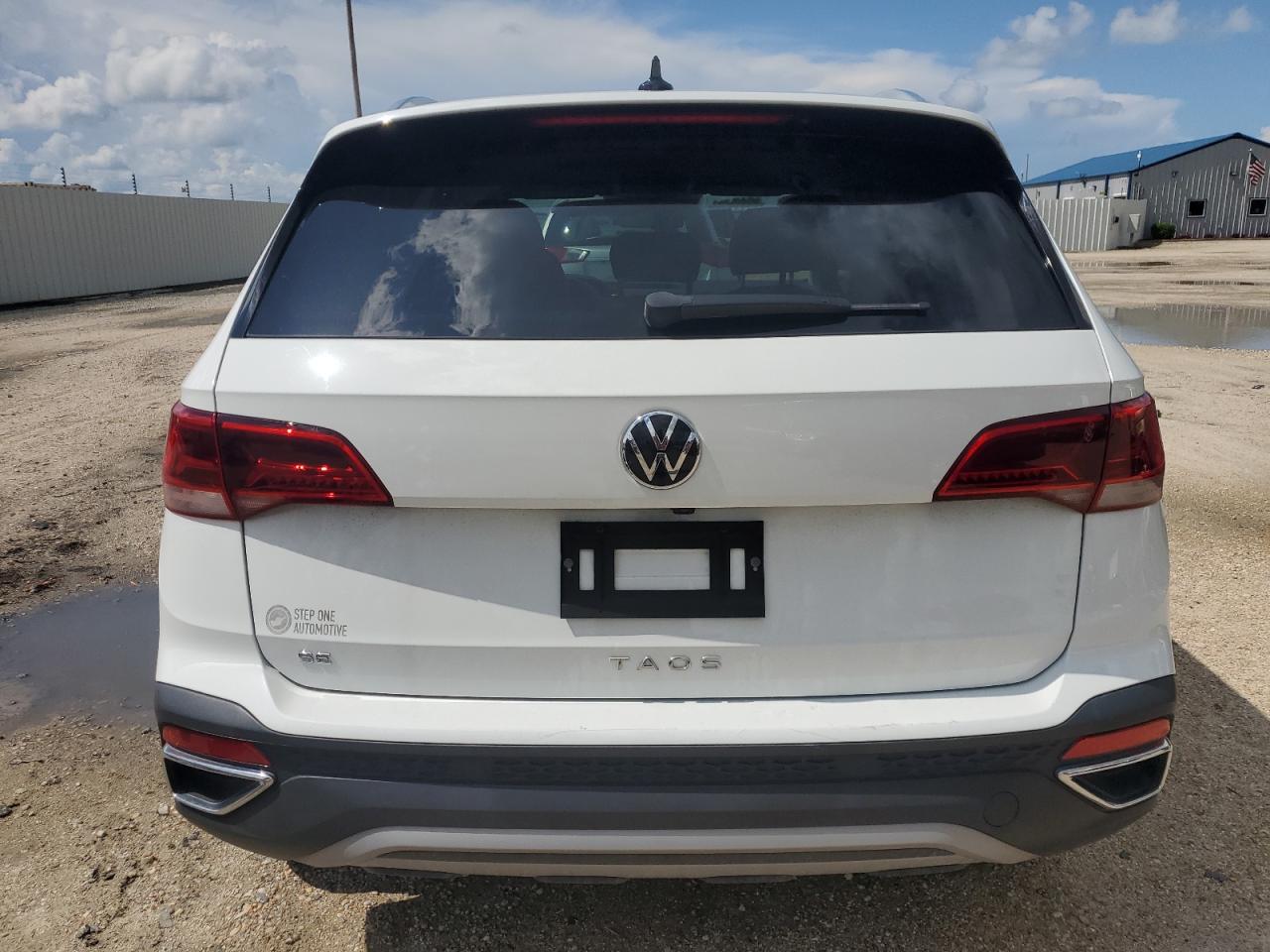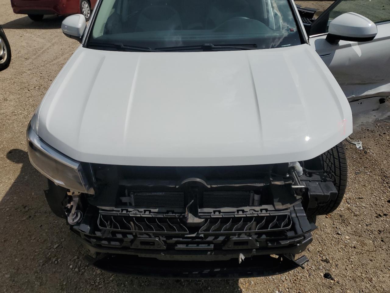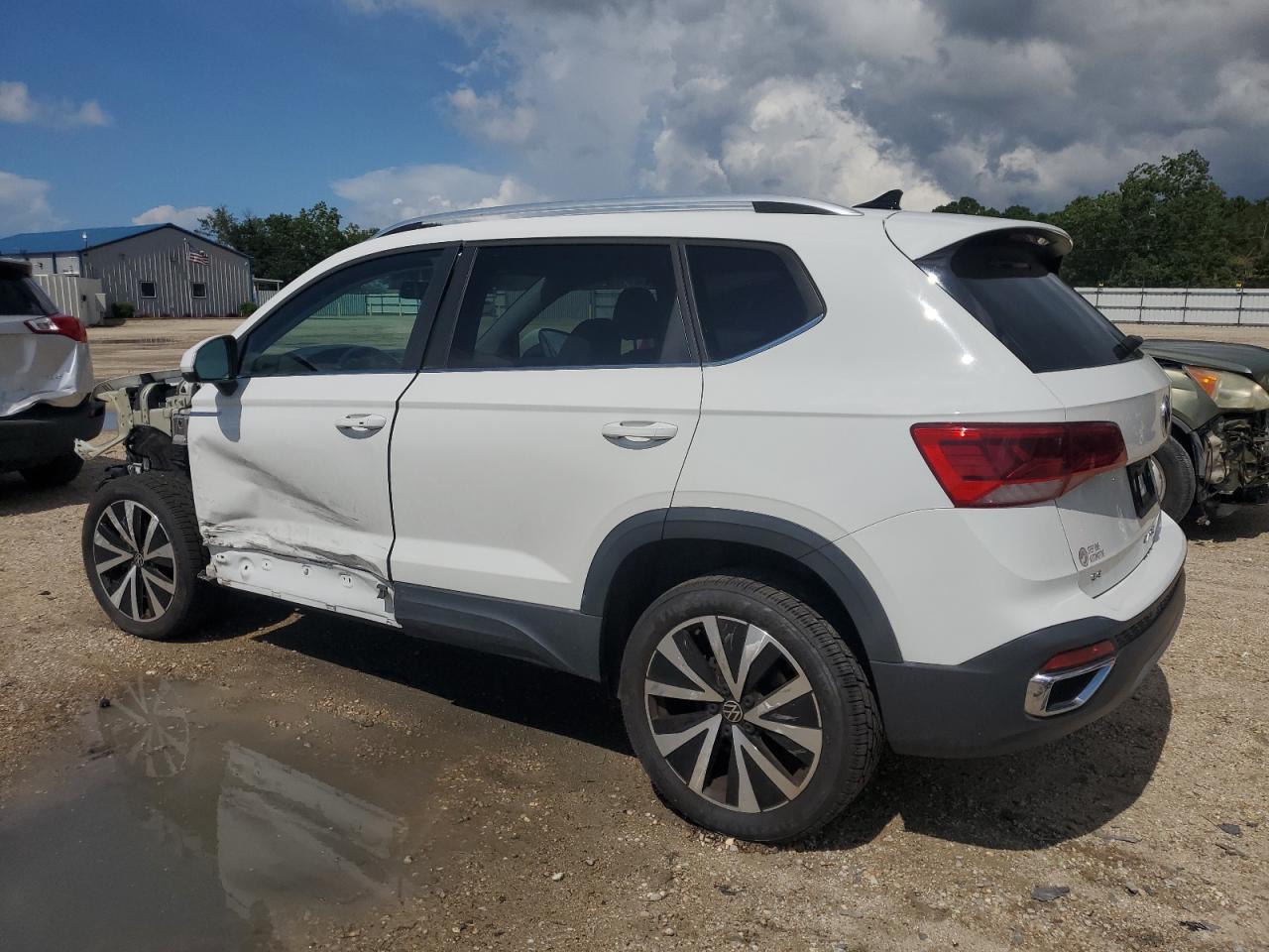 FairThis is a white 2022 Volkswagen Taos SE that has sustained significant damage. The primary damage is to the front end, with secondary damage to the side. The vehicle's front end exhibits extensive damage, including a collapsed front bumper and compromised front components. The side panels show visible signs of impact. The wheels appear to be intact, and the vehicle's glass components seem undamaged. The interior condition is good with moderate wear and tear consistent with its age. The car is listed with a Run & Drive Verified status. The airbag status is not visible. The vehicle is drivable.