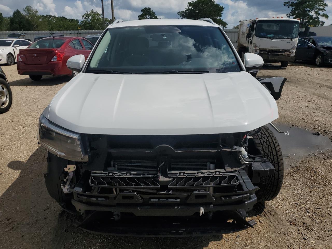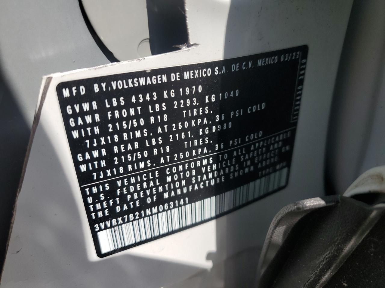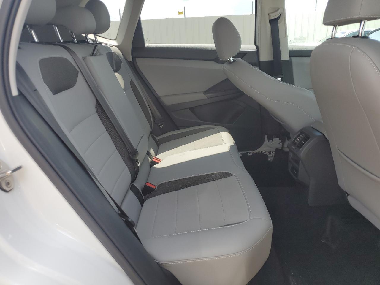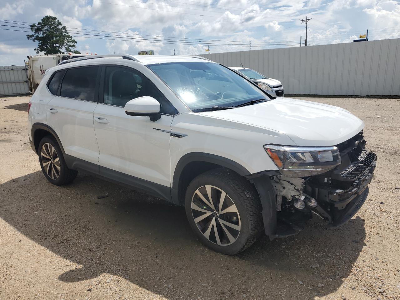 FairThis is a white 2022 Volkswagen Taos SE that has sustained significant damage. The primary damage is to the front end, with secondary damage to the side. The vehicle's front end exhibits extensive damage, including a collapsed front bumper and compromised front components. The side panels show visible signs of impact. The wheels appear to be intact, and the vehicle's glass components seem undamaged. The interior condition is good with moderate wear and tear consistent with its age. The car is listed with a Run & Drive Verified status. The airbag status is not visible. The vehicle is drivable.