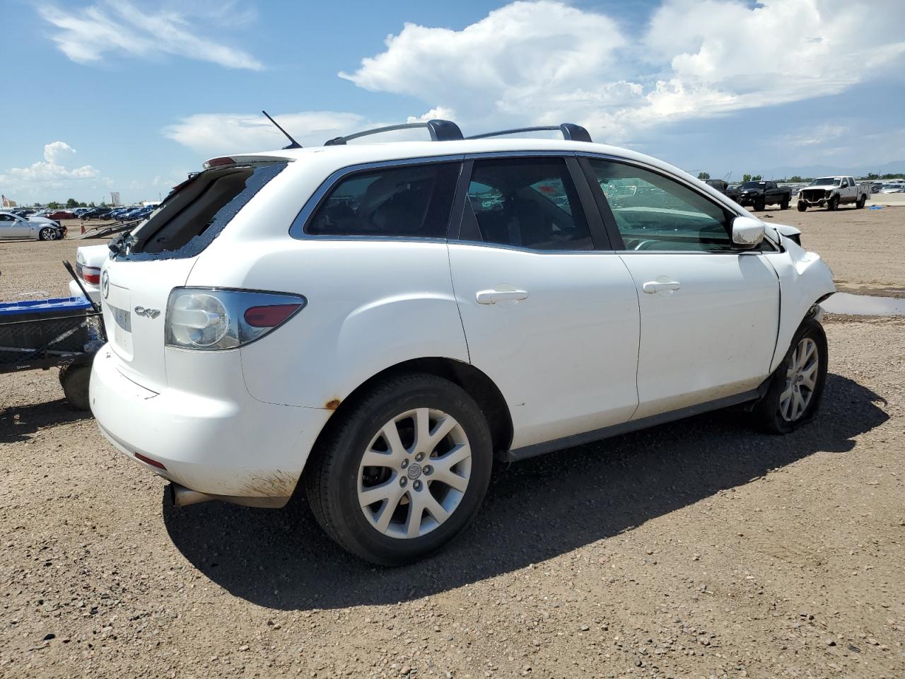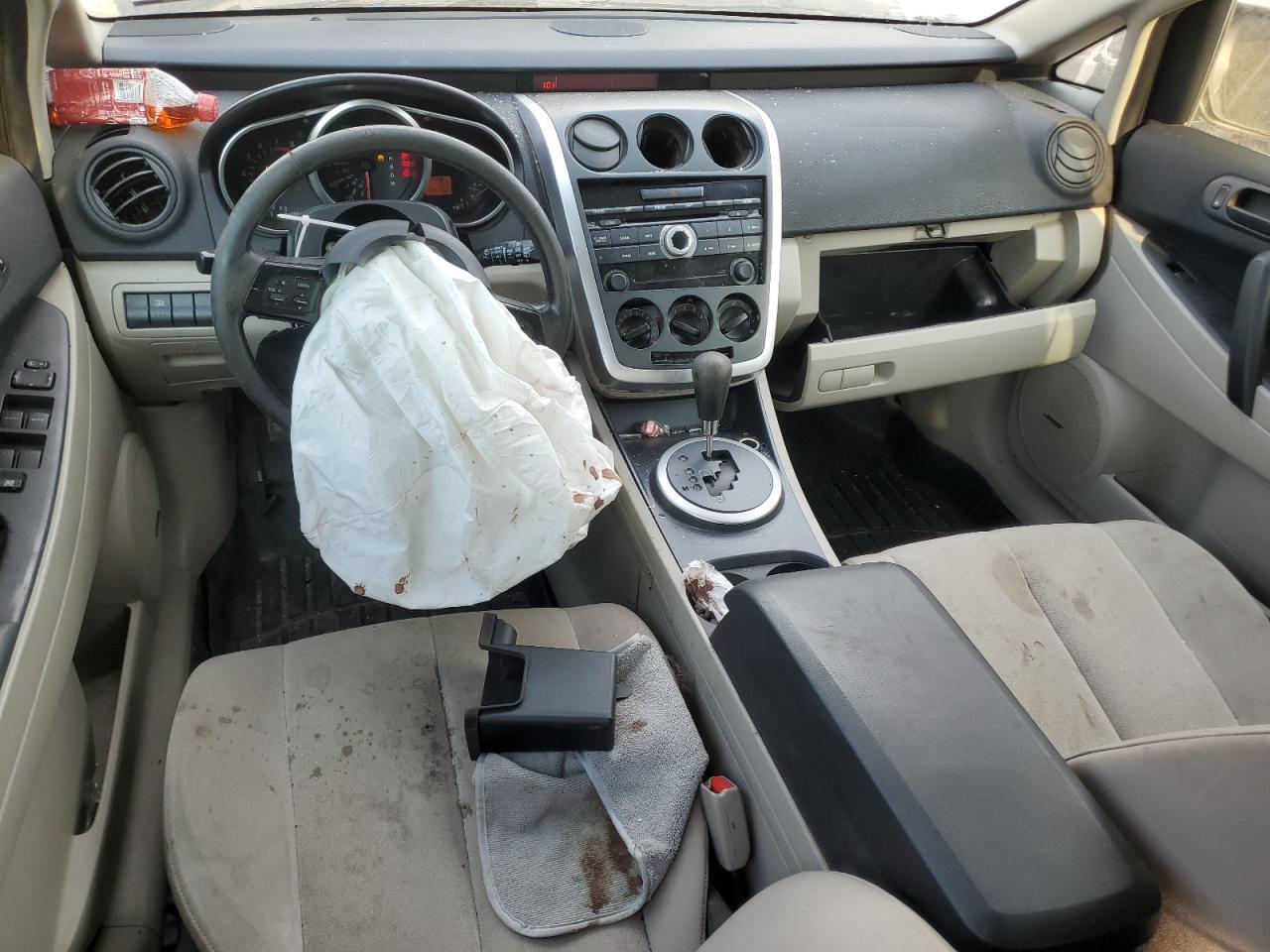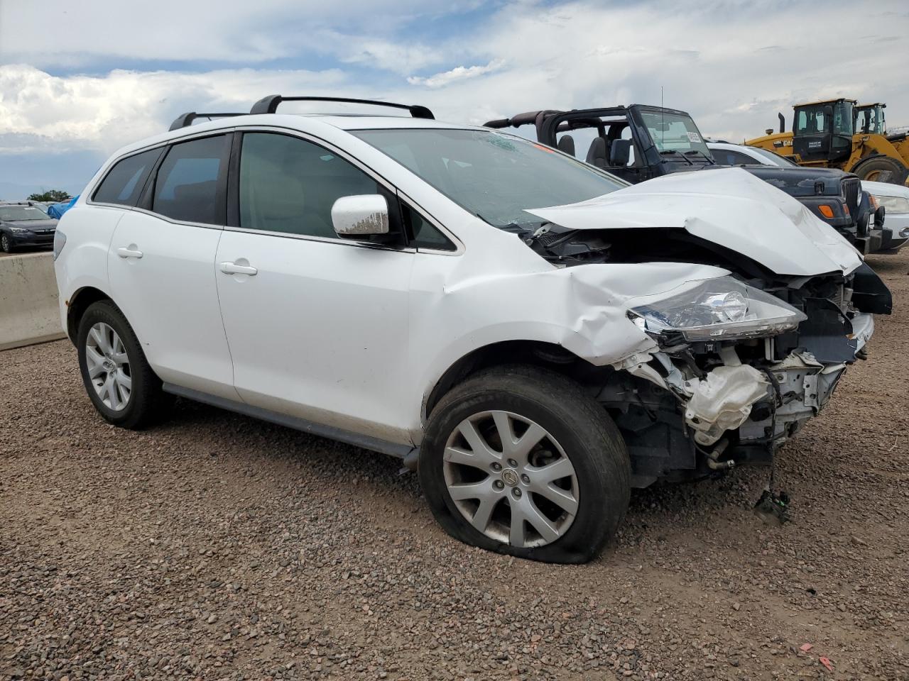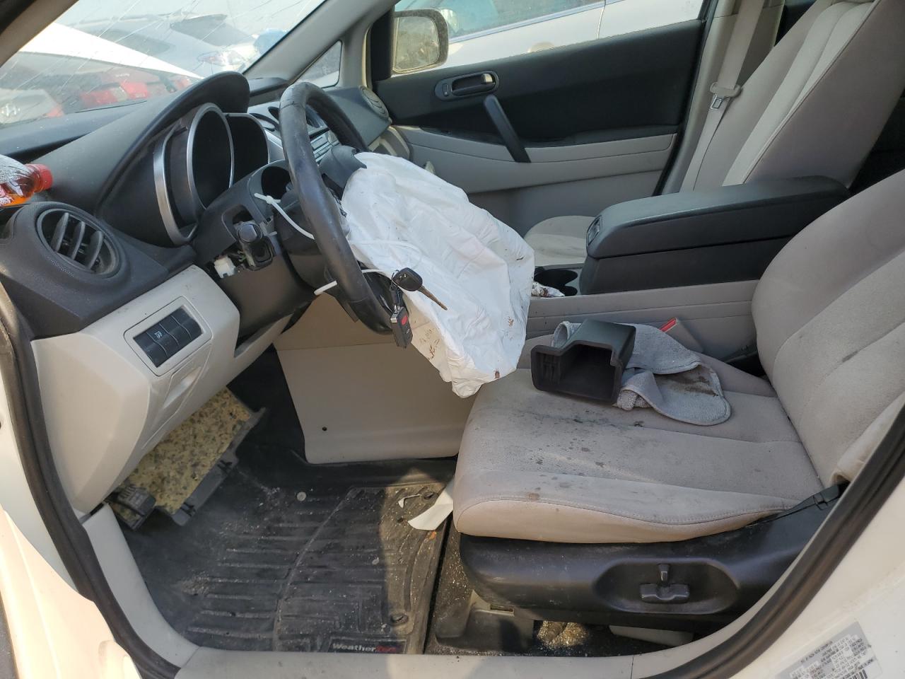 PoorThis is a white 2007 Mazda CX-7. The car has sustained significant front-end and roof damage, indicating a major collision. The front of the vehicle is severely impacted, with extensive damage to the body panels, lights, and possible frame damage. The roof also shows significant damage, with potential glass breakage. The interior appears to have deployed airbags, indicating an impact. The wheels are in good condition. Summary: Damaged 2007 Mazda CX-7 with severe front-end and roof damage. Vehicle Damage Category: Body, Overall Condition: Poor. This car has a lot of visible damage including front, top/roof. This Mazda need a lot of repairs to be drivable again.