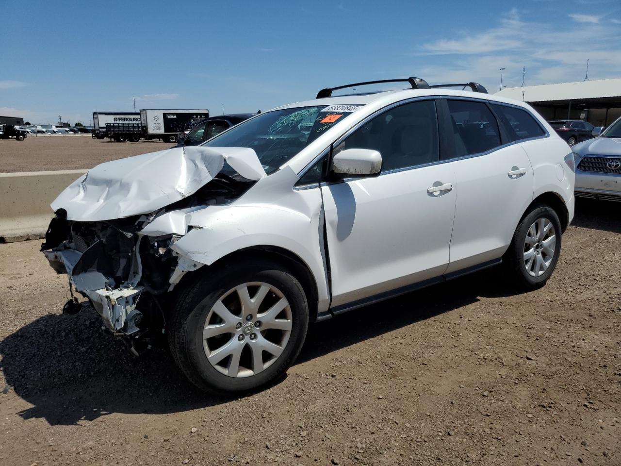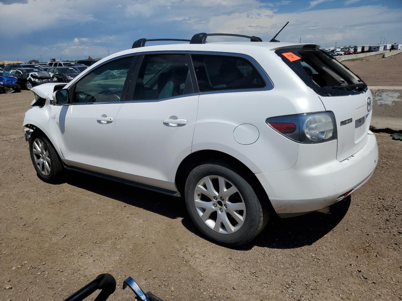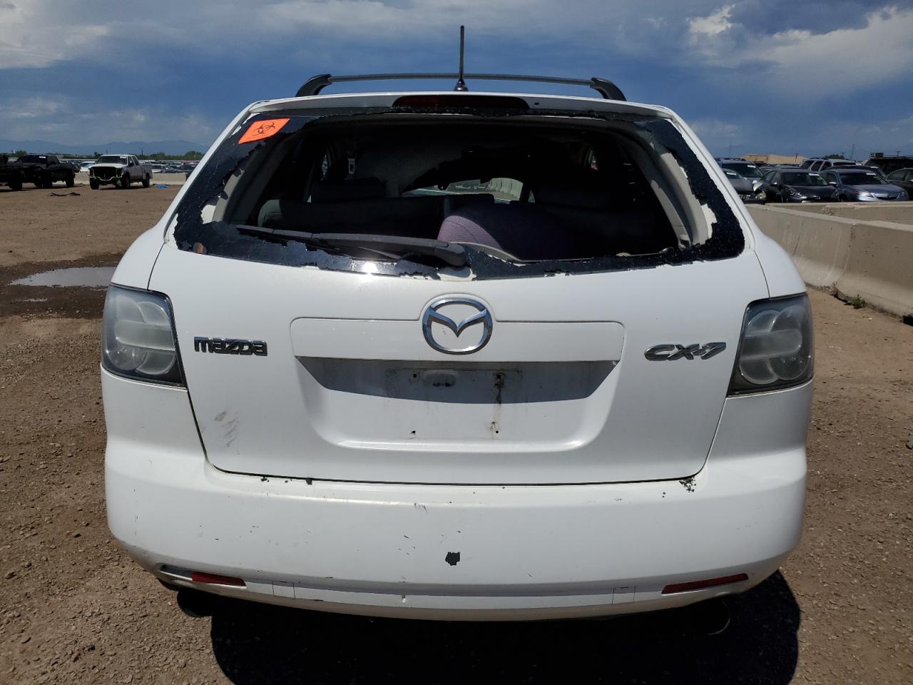 PoorThis is a white 2007 Mazda CX-7. The car has sustained significant front-end and roof damage, indicating a major collision. The front of the vehicle is severely impacted, with extensive damage to the body panels, lights, and possible frame damage. The roof also shows significant damage, with potential glass breakage. The interior appears to have deployed airbags, indicating an impact. The wheels are in good condition. Summary: Damaged 2007 Mazda CX-7 with severe front-end and roof damage. Vehicle Damage Category: Body, Overall Condition: Poor. This car has a lot of visible damage including front, top/roof. This Mazda need a lot of repairs to be drivable again.