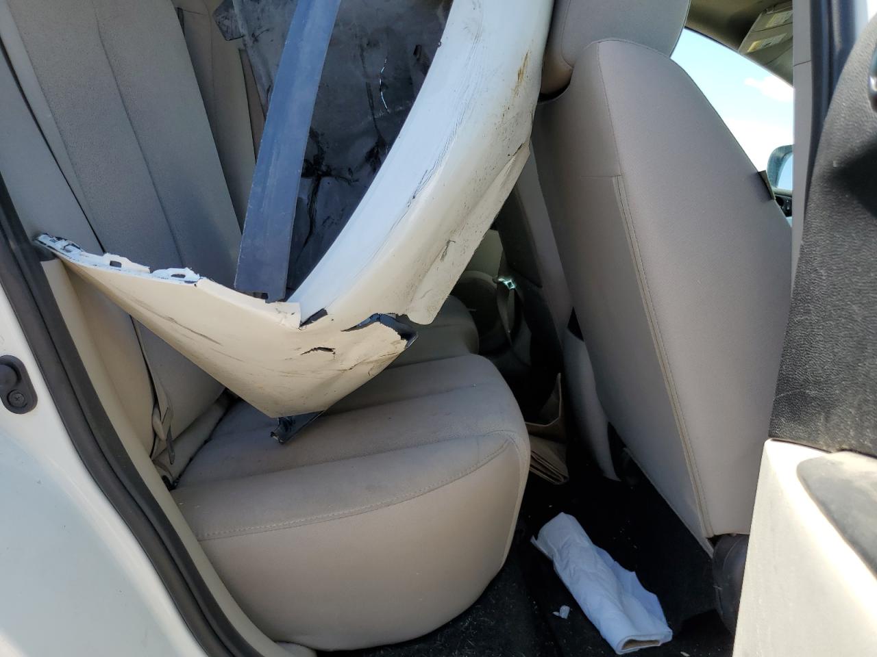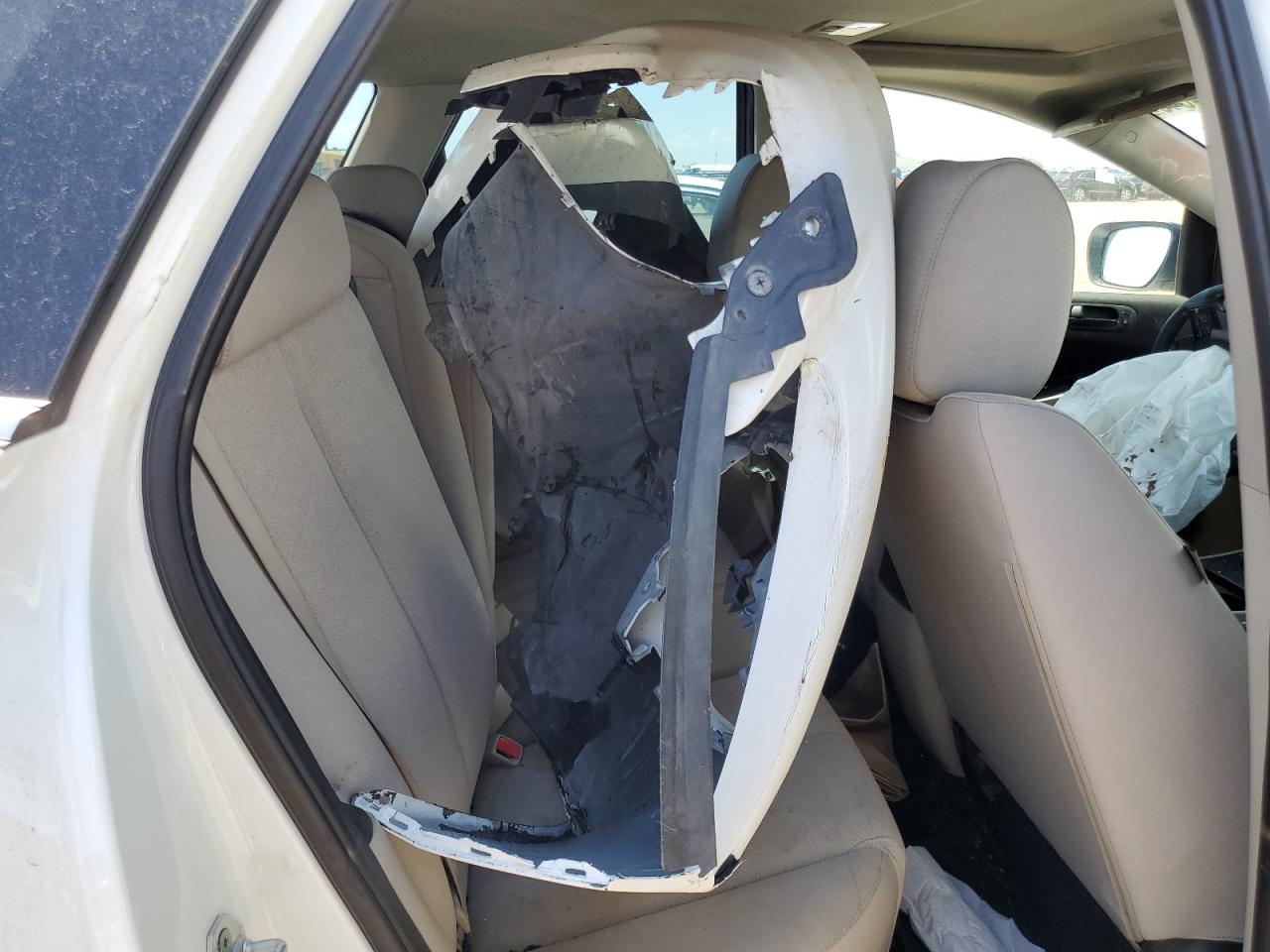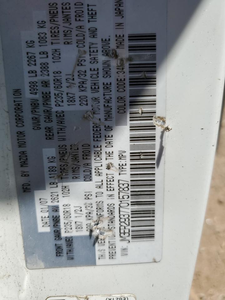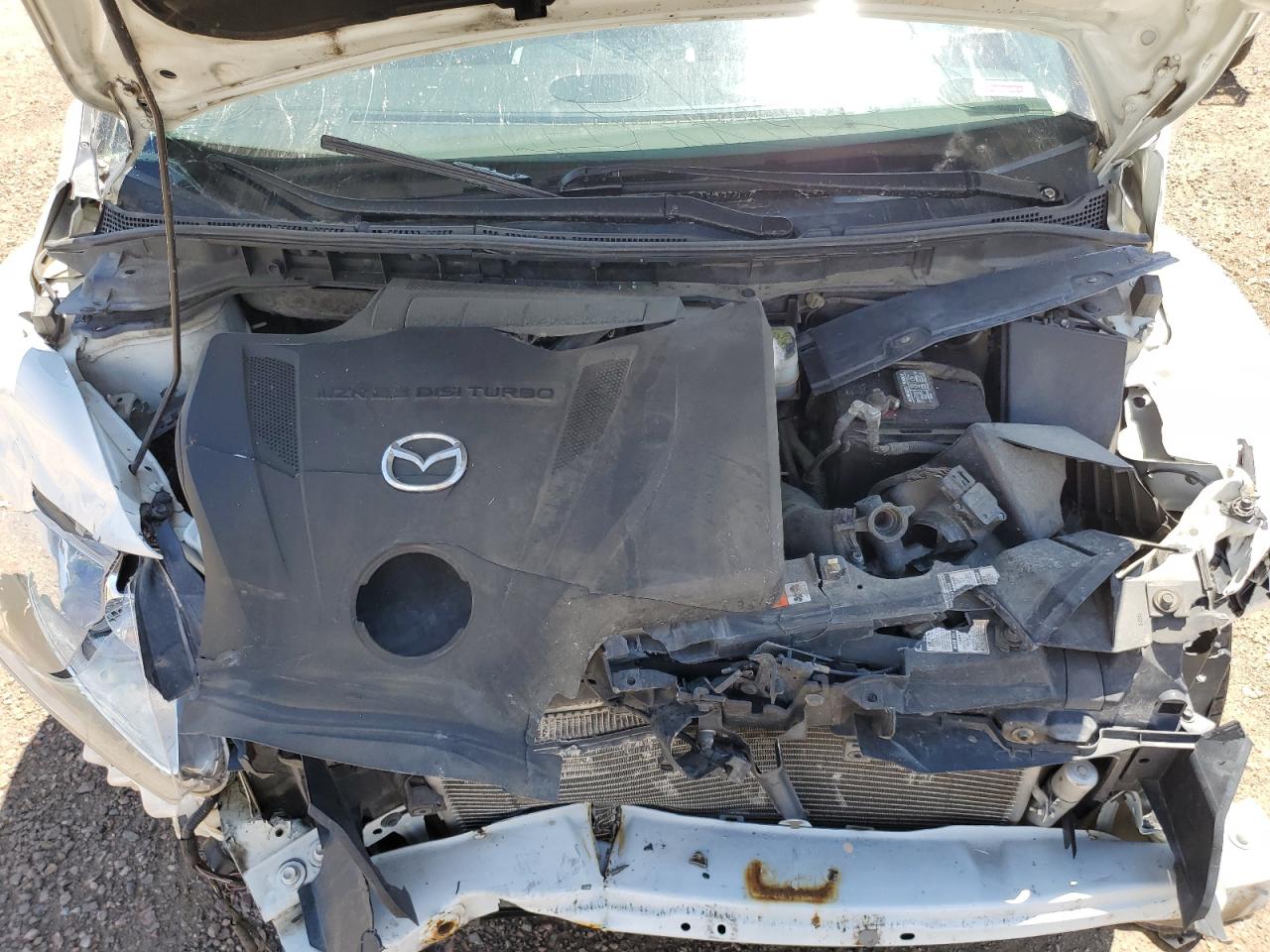 PoorThis is a white 2007 Mazda CX-7. The car has sustained significant front-end and roof damage, indicating a major collision. The front of the vehicle is severely impacted, with extensive damage to the body panels, lights, and possible frame damage. The roof also shows significant damage, with potential glass breakage. The interior appears to have deployed airbags, indicating an impact. The wheels are in good condition. Summary: Damaged 2007 Mazda CX-7 with severe front-end and roof damage. Vehicle Damage Category: Body, Overall Condition: Poor. This car has a lot of visible damage including front, top/roof. This Mazda need a lot of repairs to be drivable again.
