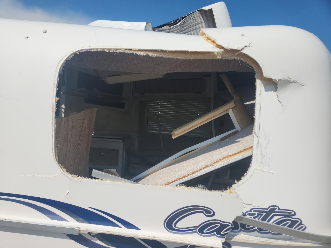 Extensive body damage, roof damage, and interior structural damage. The Casita trailer requires significant repairs.